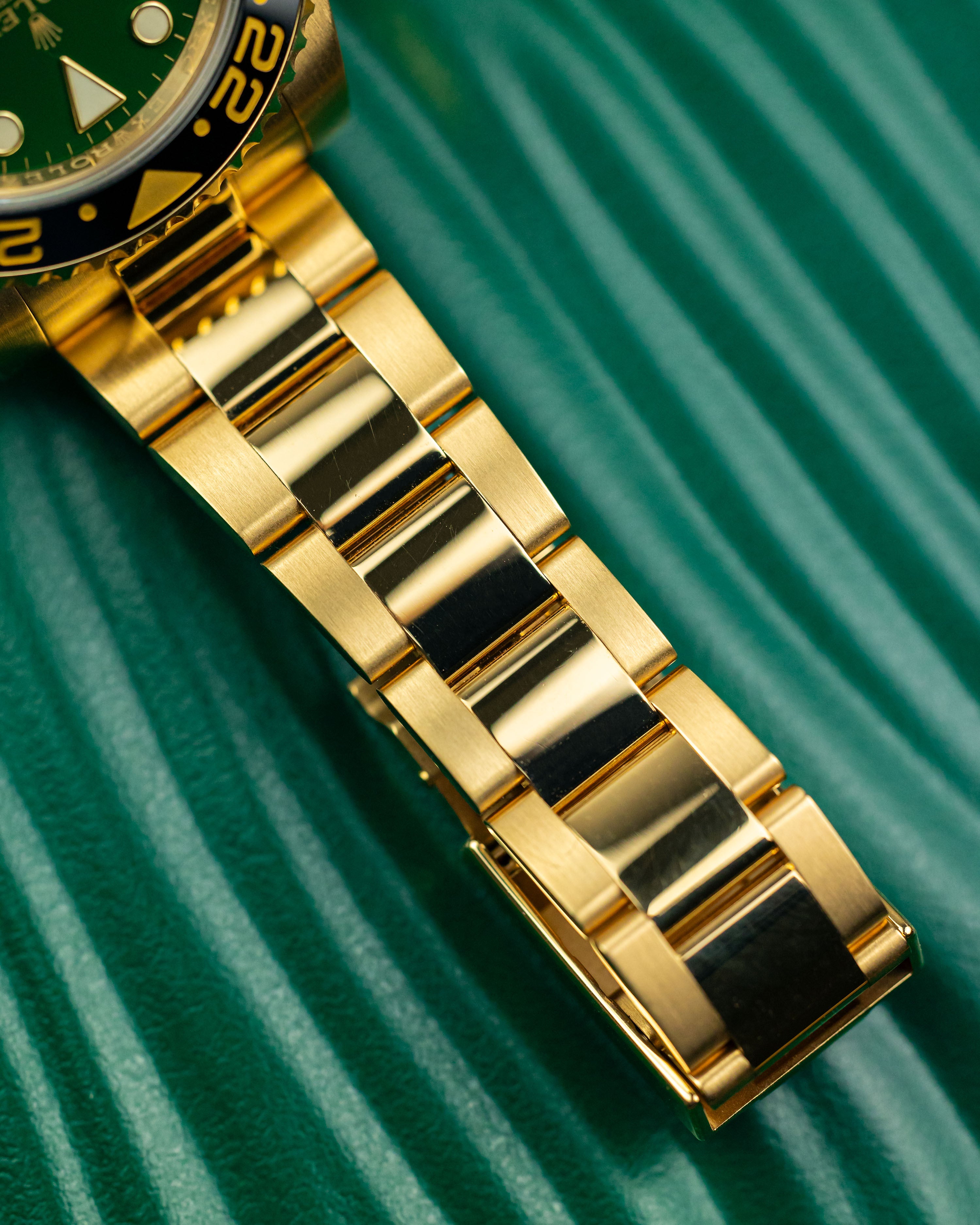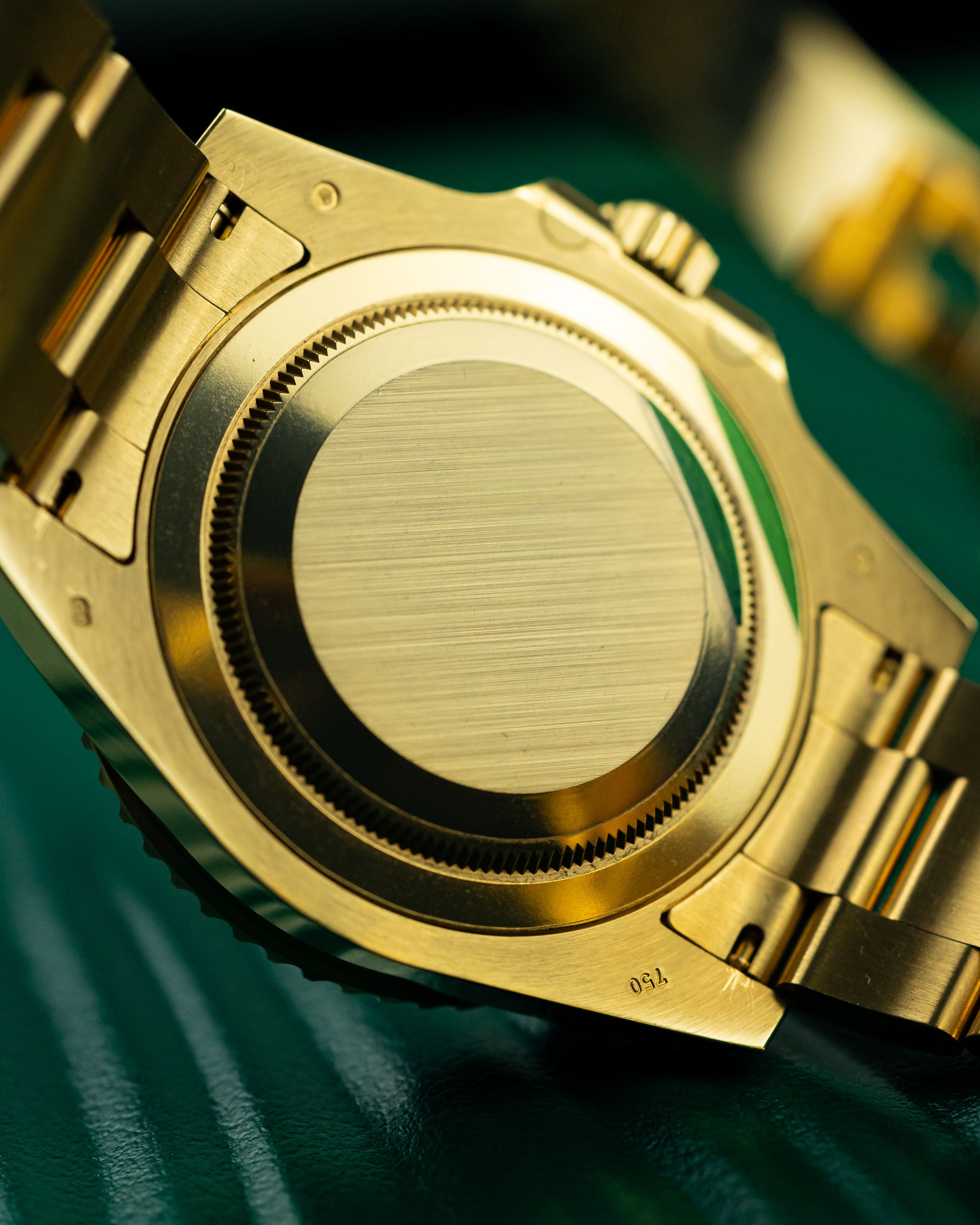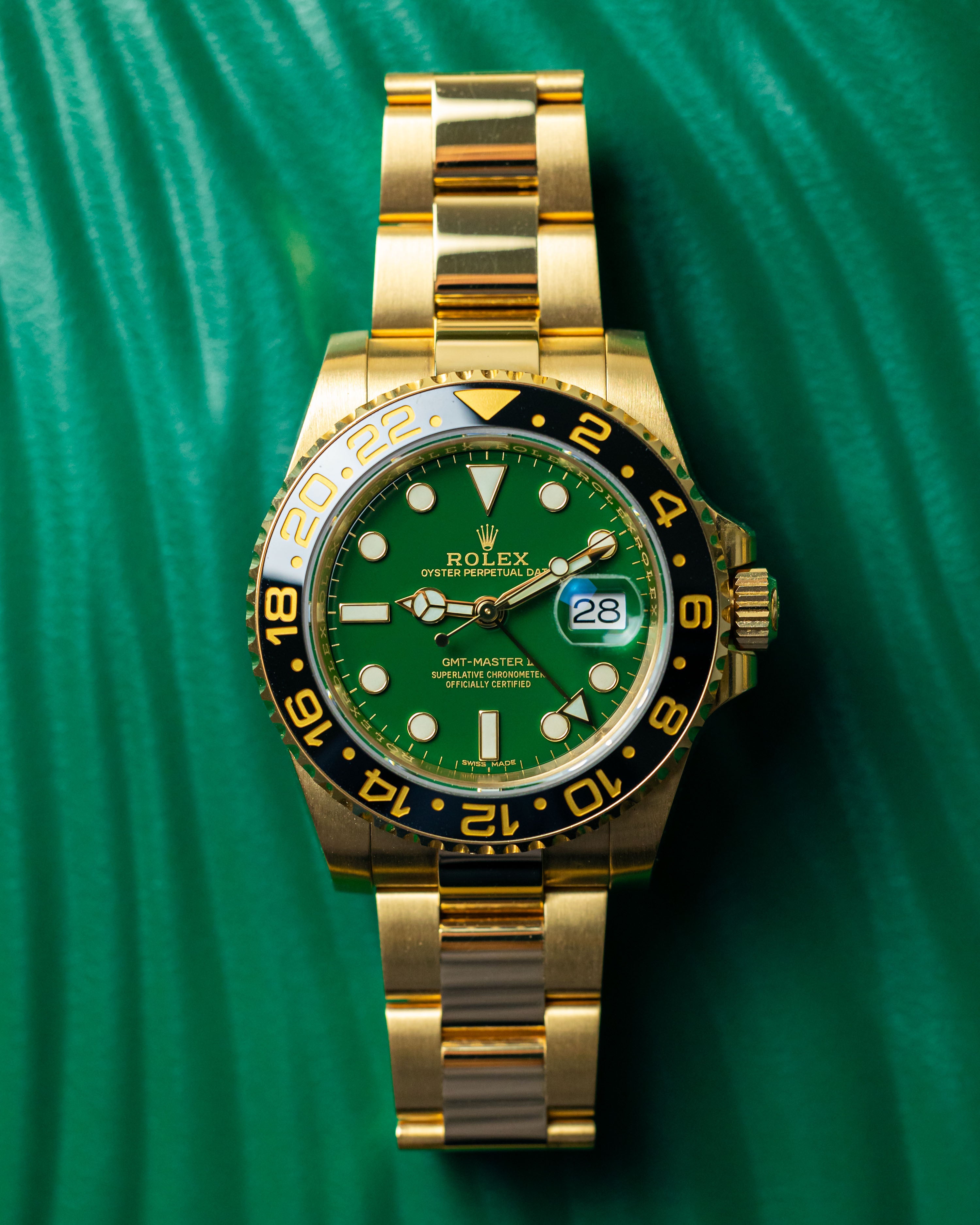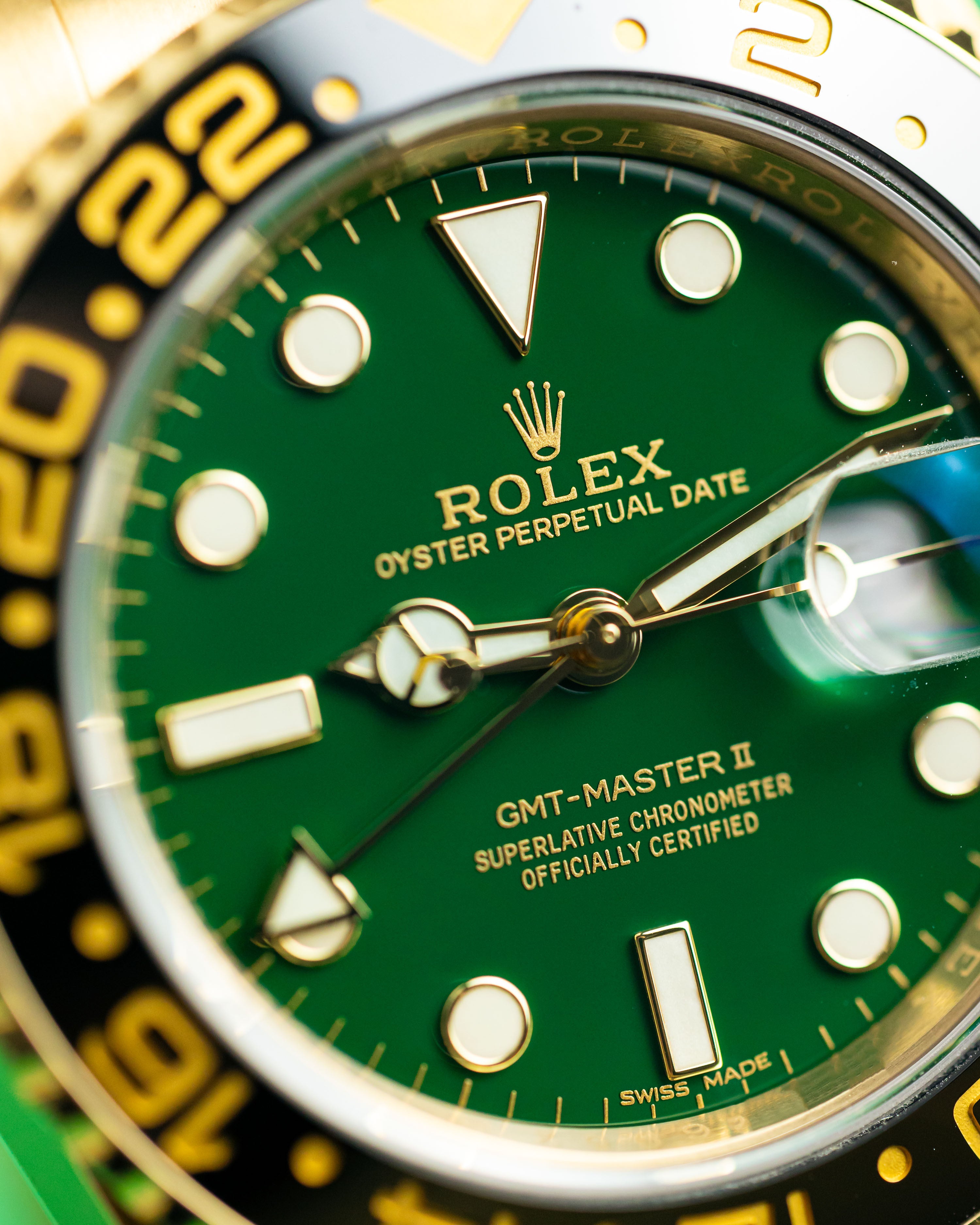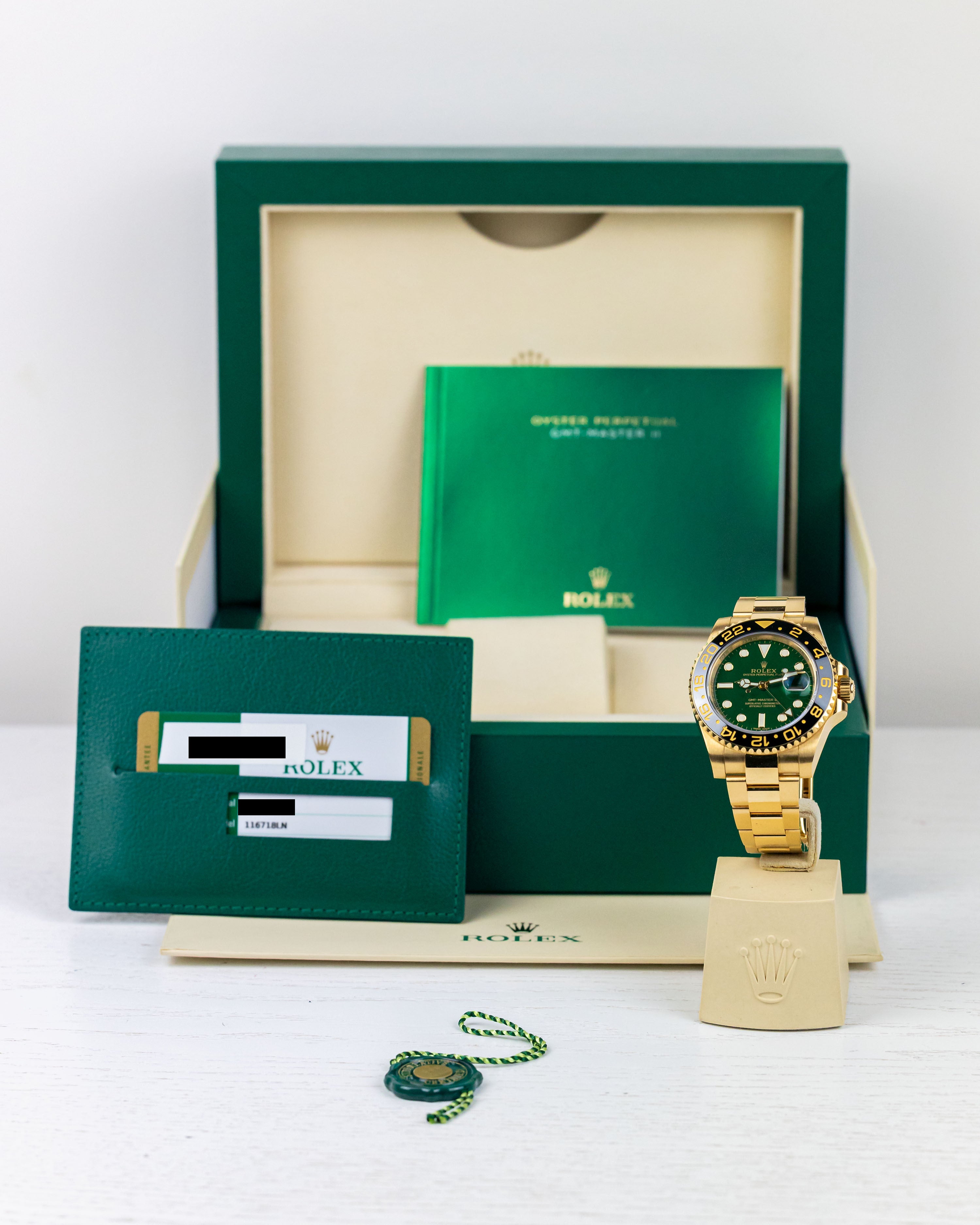 A rarely seen yellow gold GMT2 with the highly desirable gloss green dial. Having been discontinued for almost 5 years, it’s great to see a late model example come into stock in such great condition. Only light signs of wear are evident from careful use.