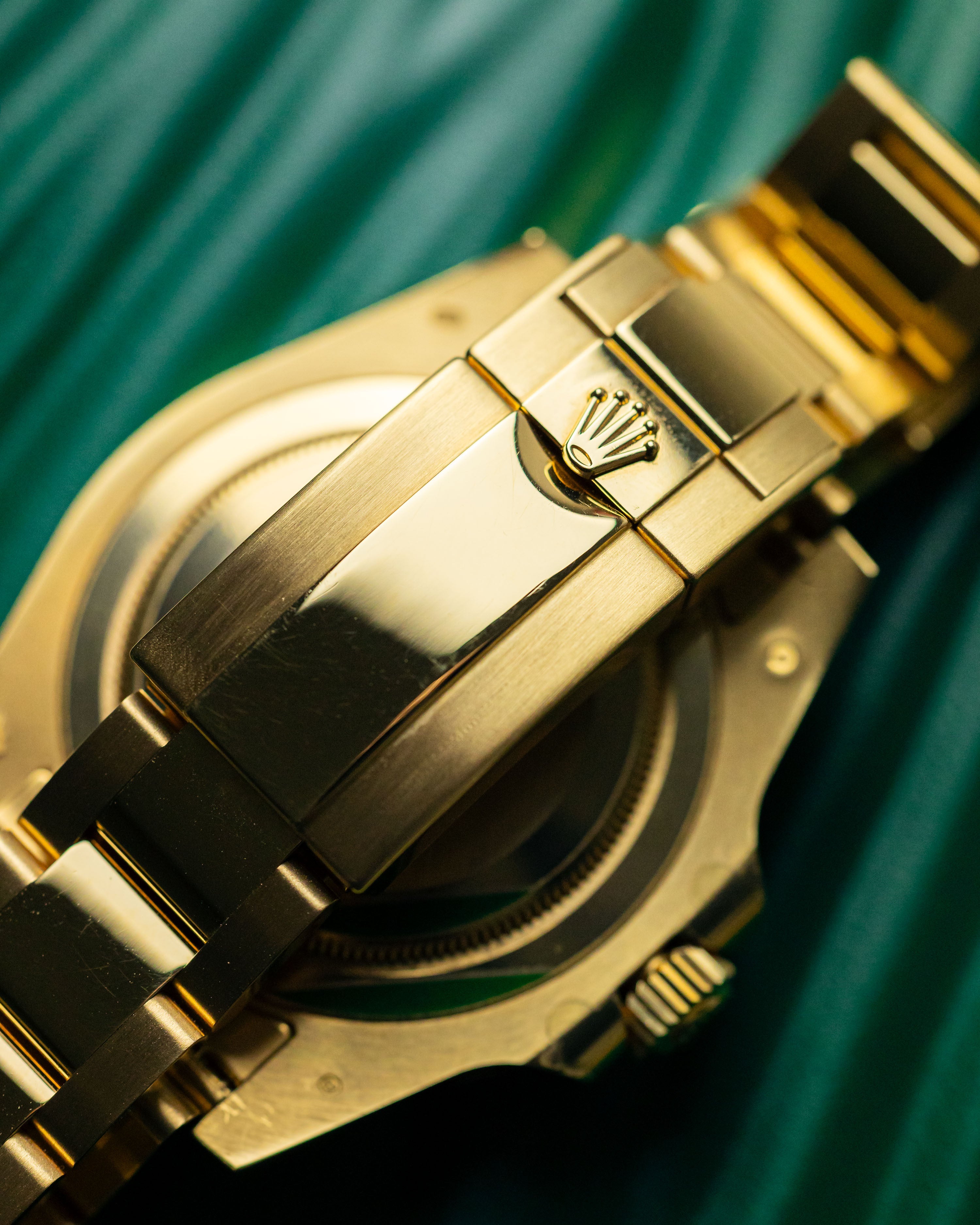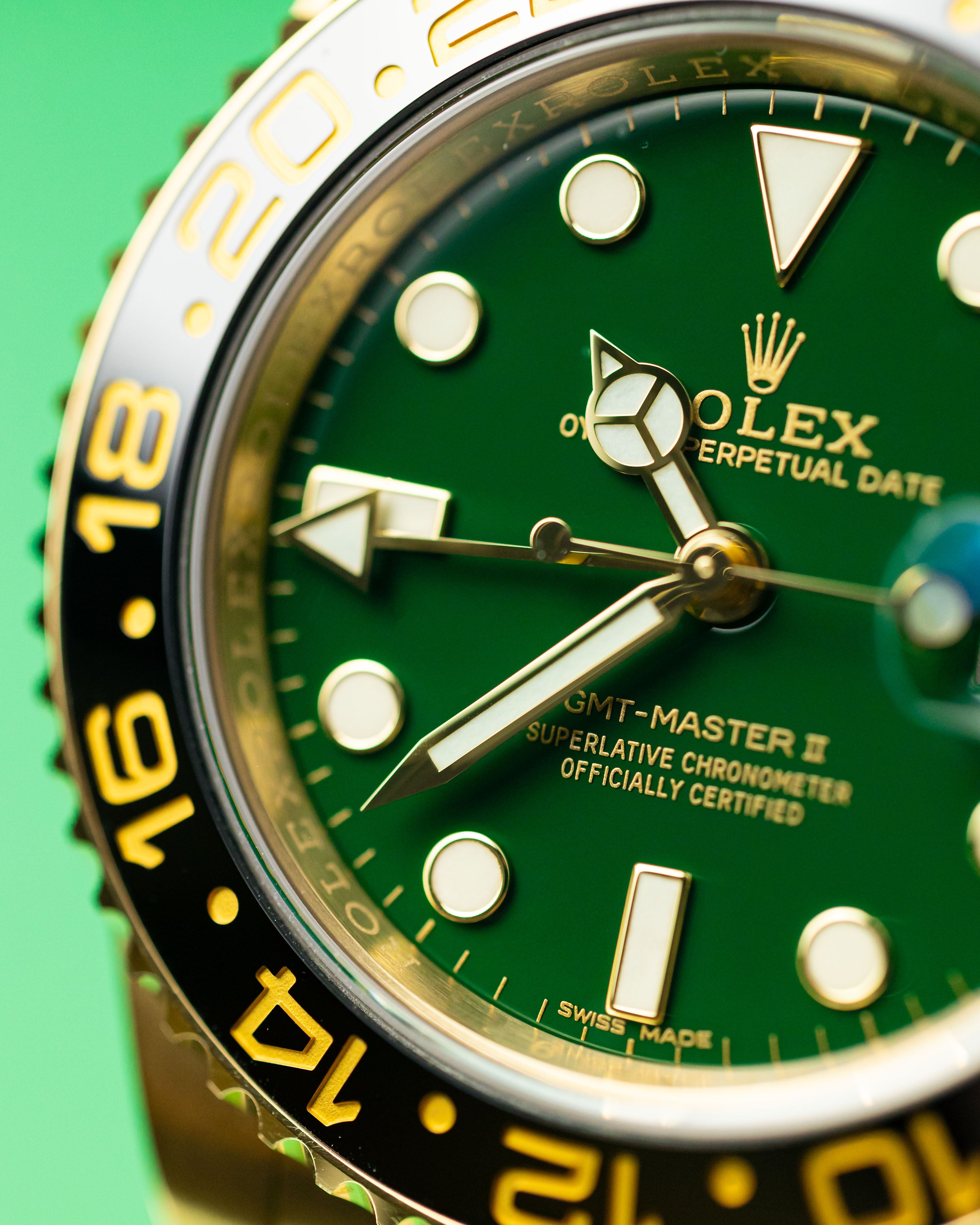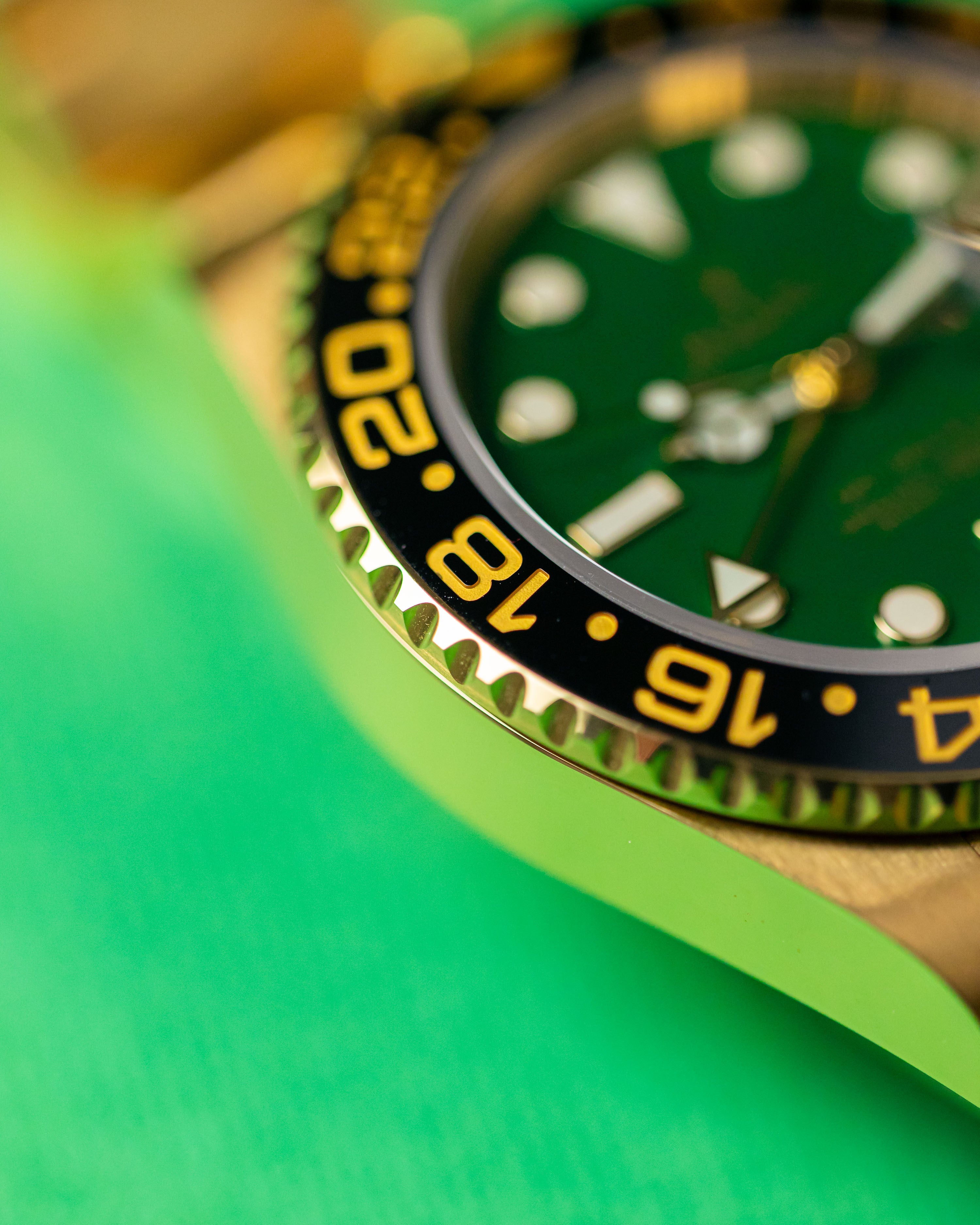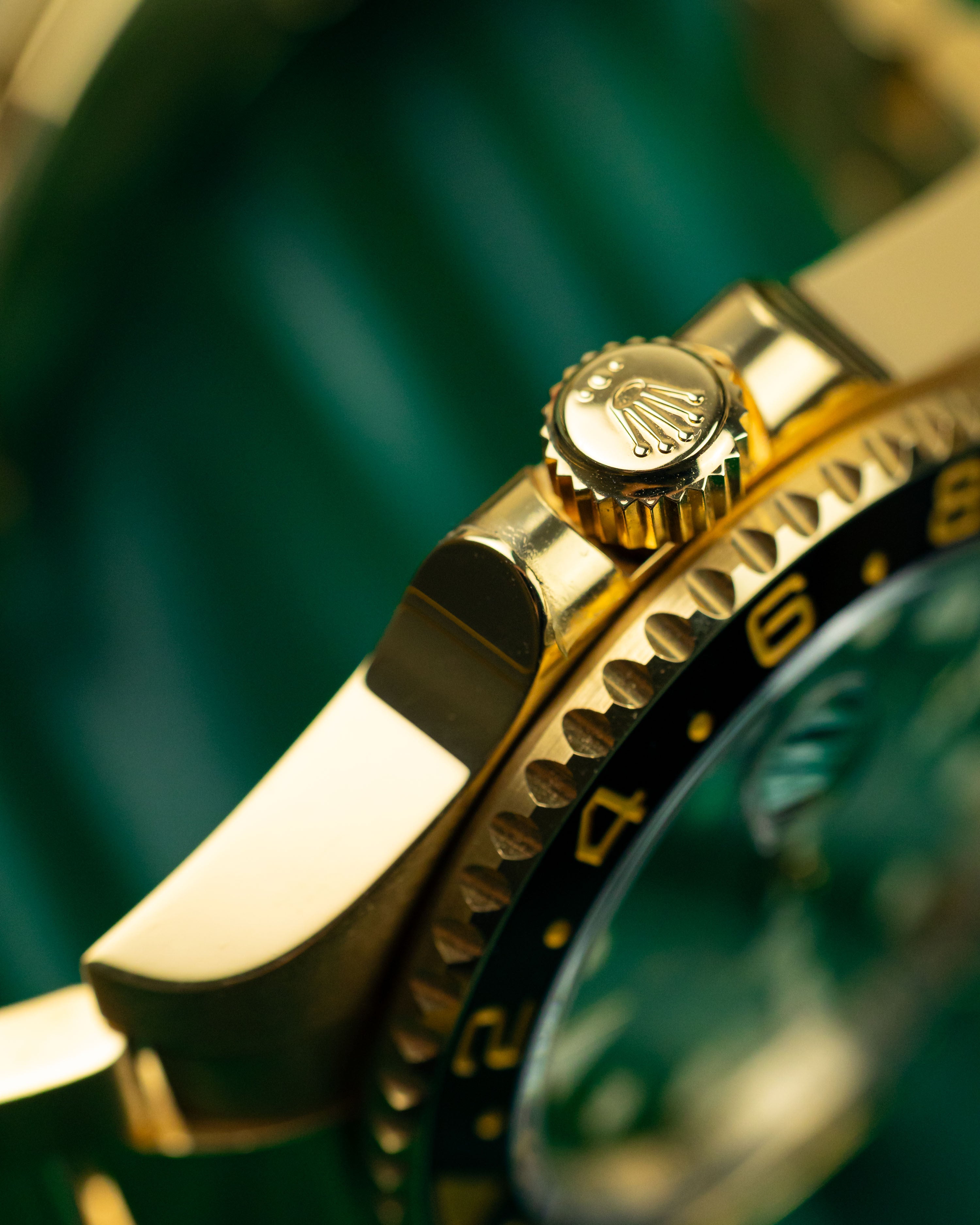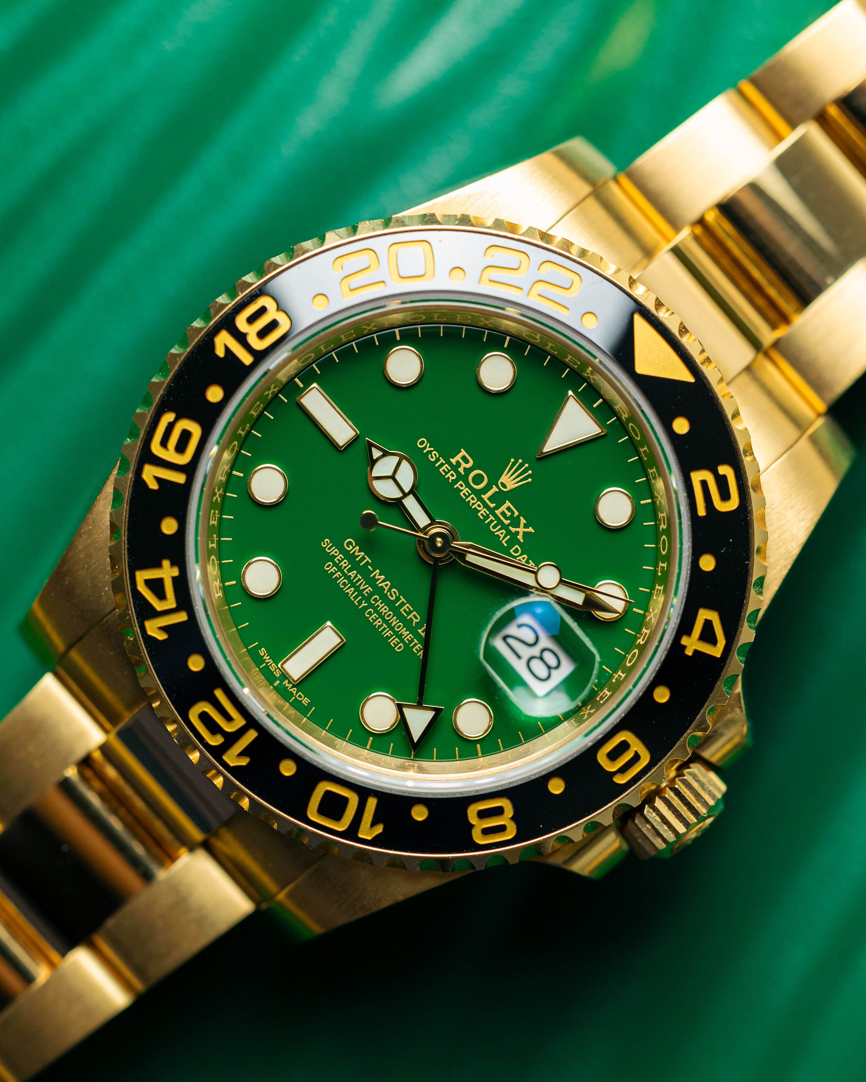 A rarely seen yellow gold GMT2 with the highly desirable gloss green dial. Having been discontinued for almost 5 years, it’s great to see a late model example come into stock in such great condition. Only light signs of wear are evident from careful use.