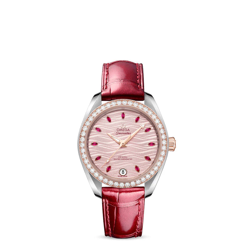 The Seamaster Aqua Terra pays homage to Omega’s rich history in marine timepieces. The symmetrical case and crown of this 34 mm watch are cast in full-gloss stainless steel, and the case back is lined with wavy textured trim.