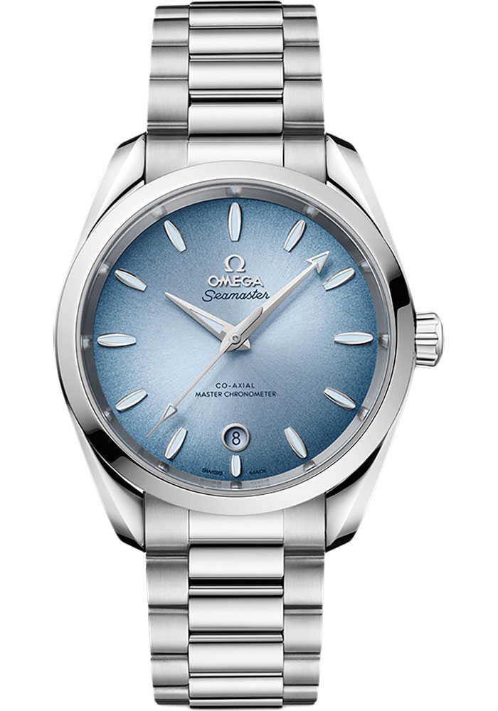 The sun-brushed dial, in OMEGA’s own Summer Blue, is PVD-treated and varnished with a gradient finish to reflect the watch’s level of water resistance. It has rhodium-plated hands and sailboat hull indexes filled with a unique light blue Super-LumiNova and a matching blue date window indicator at 6 o’clock.