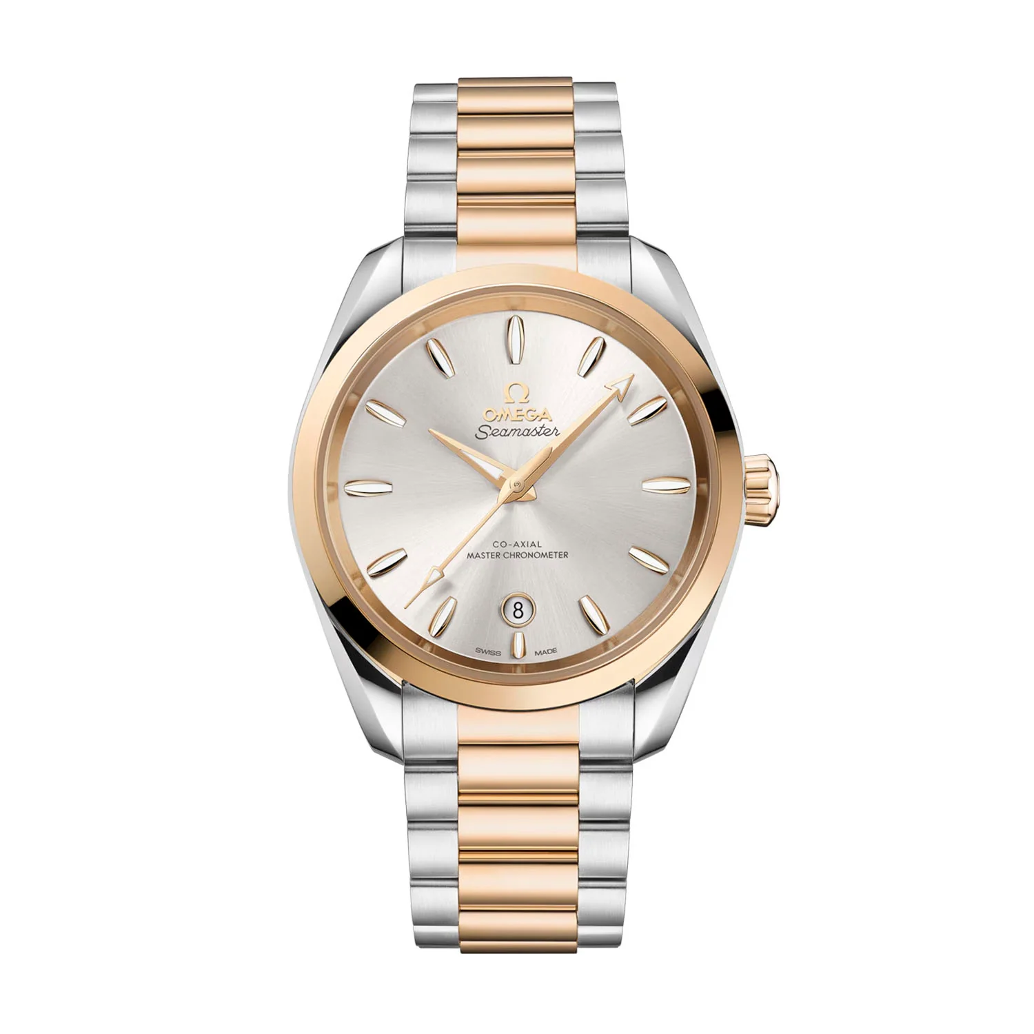 This 38 mm model, crafted in polished stainless steel and 18K Moonshine™ Gold, has a conical crown and wave-edged caseback with flat sapphire crystal. The sun-brushed and lacquered silvery dial features a circular date window at 6 o’clock ringed in 18K Moonshine™ Gold. OMEGA has also used 18K Moonshine™ Gold for the facetted hands and distinctive hour-markers, which are shaped like sailboat hulls and filled with white Super-LumiNova.