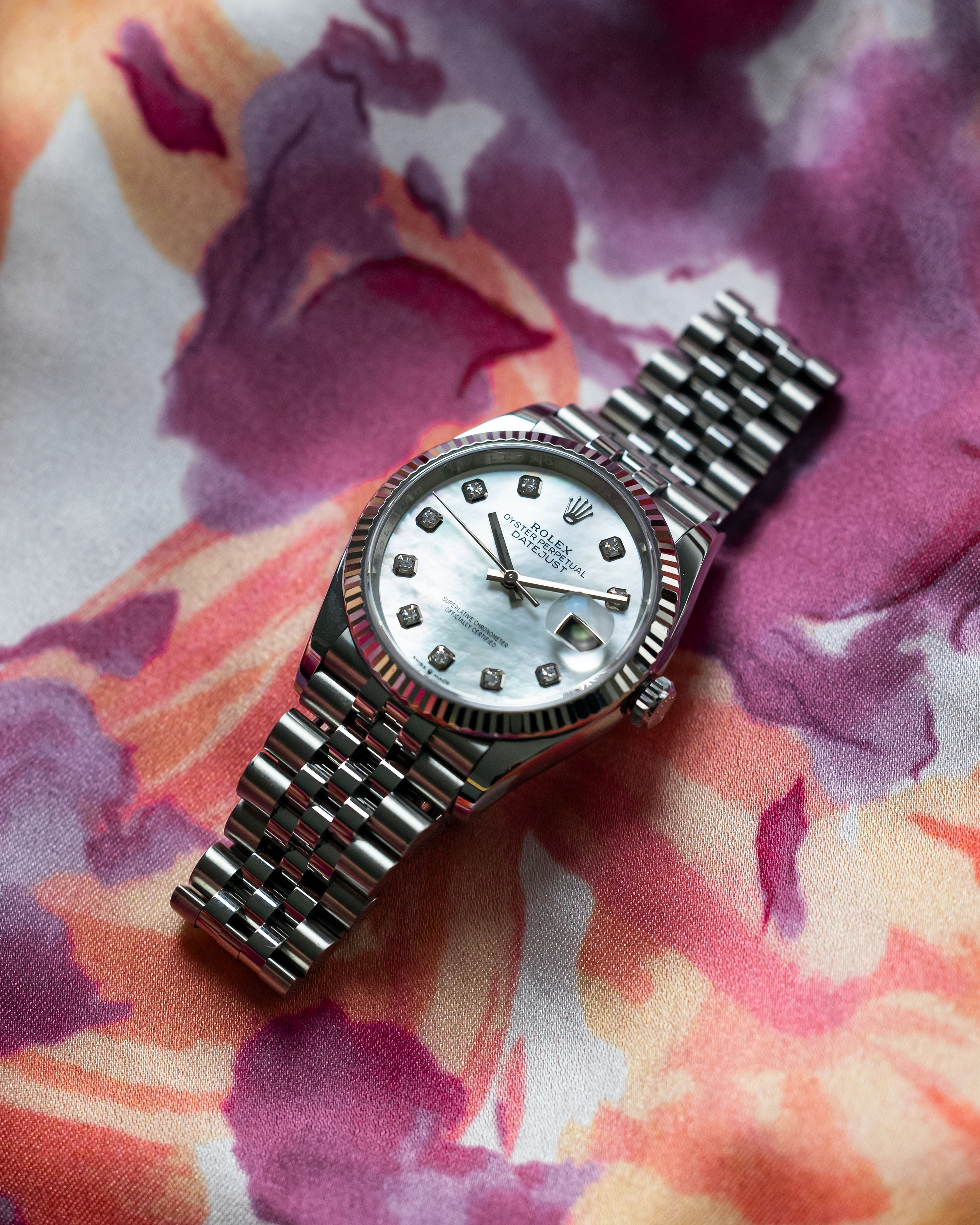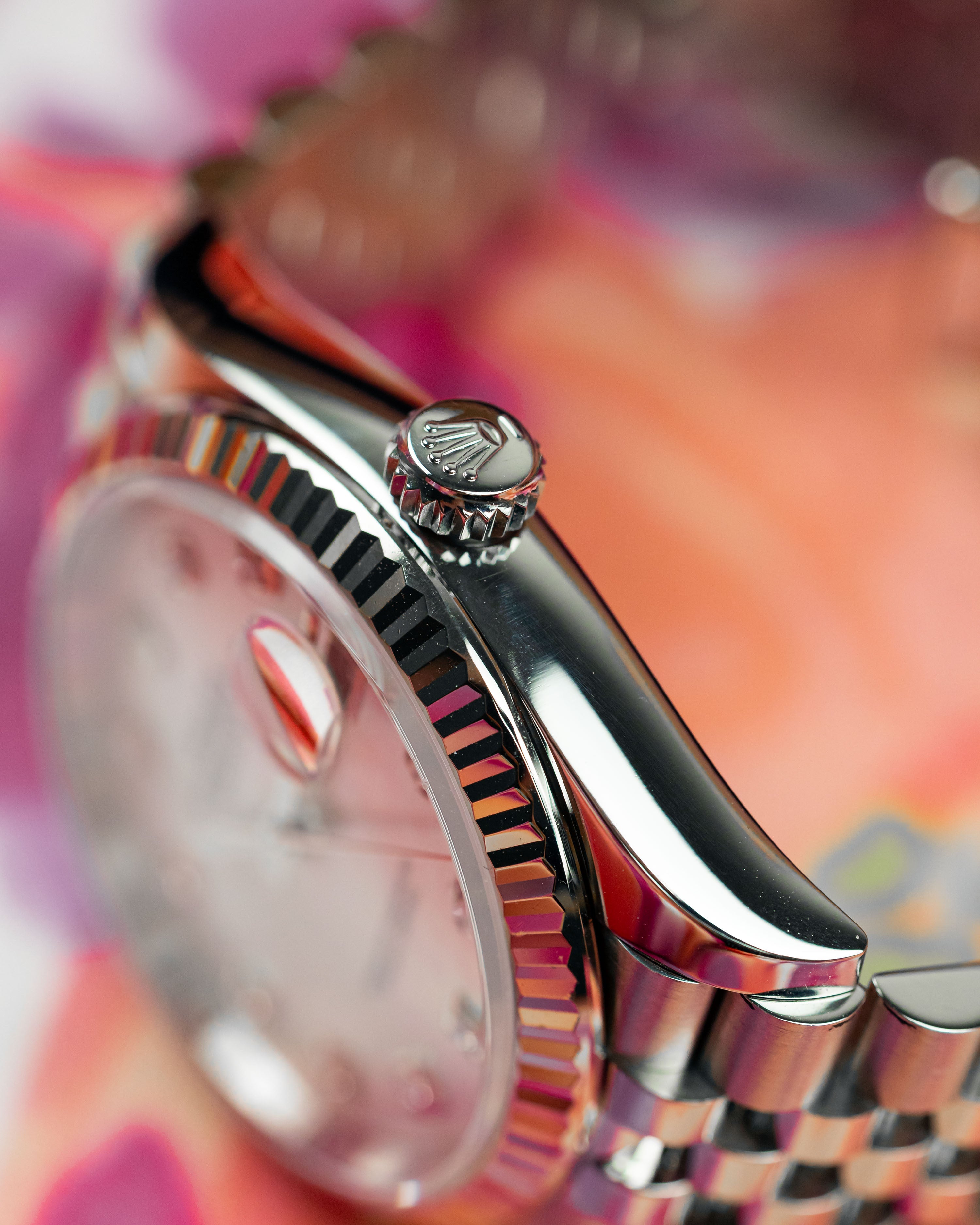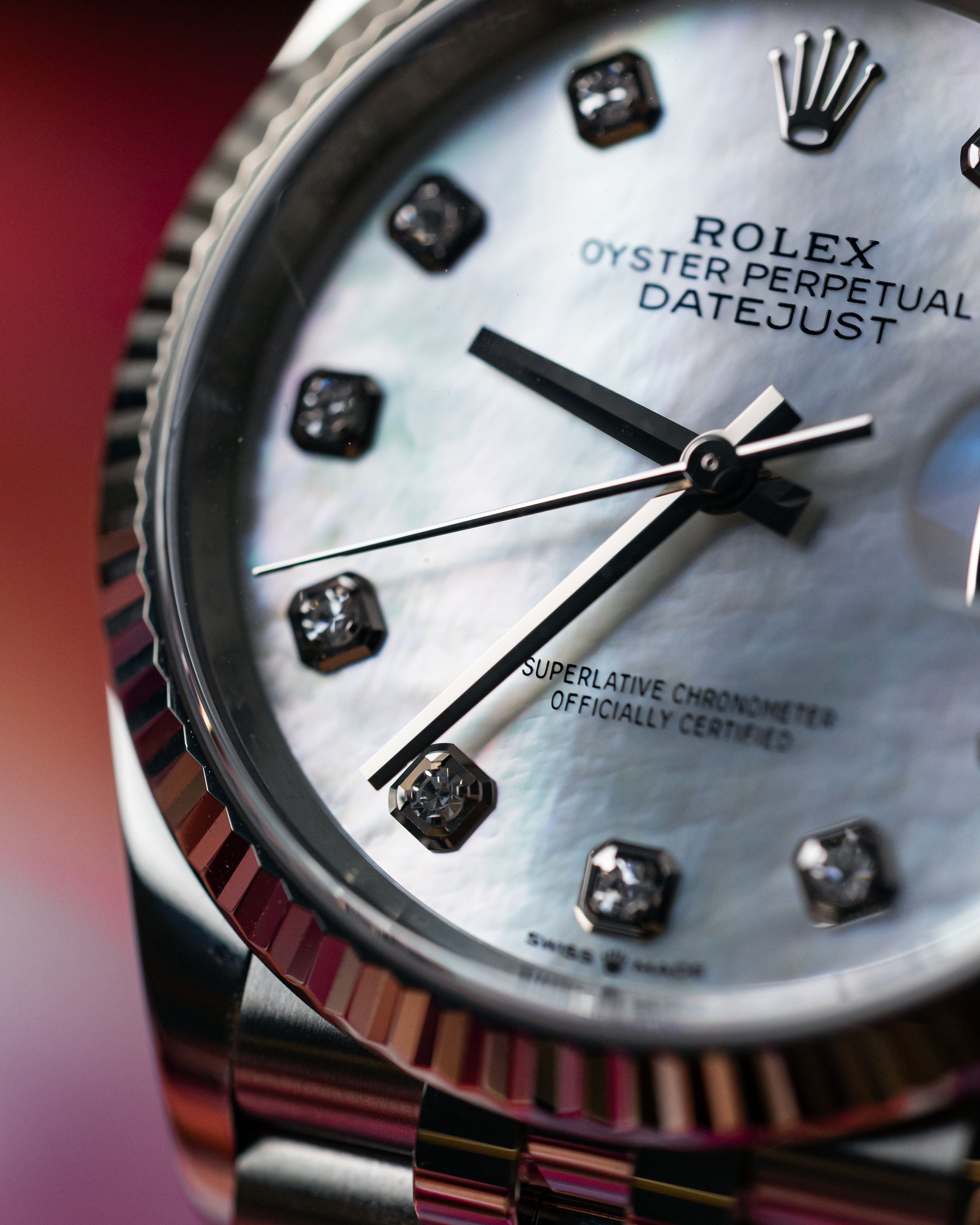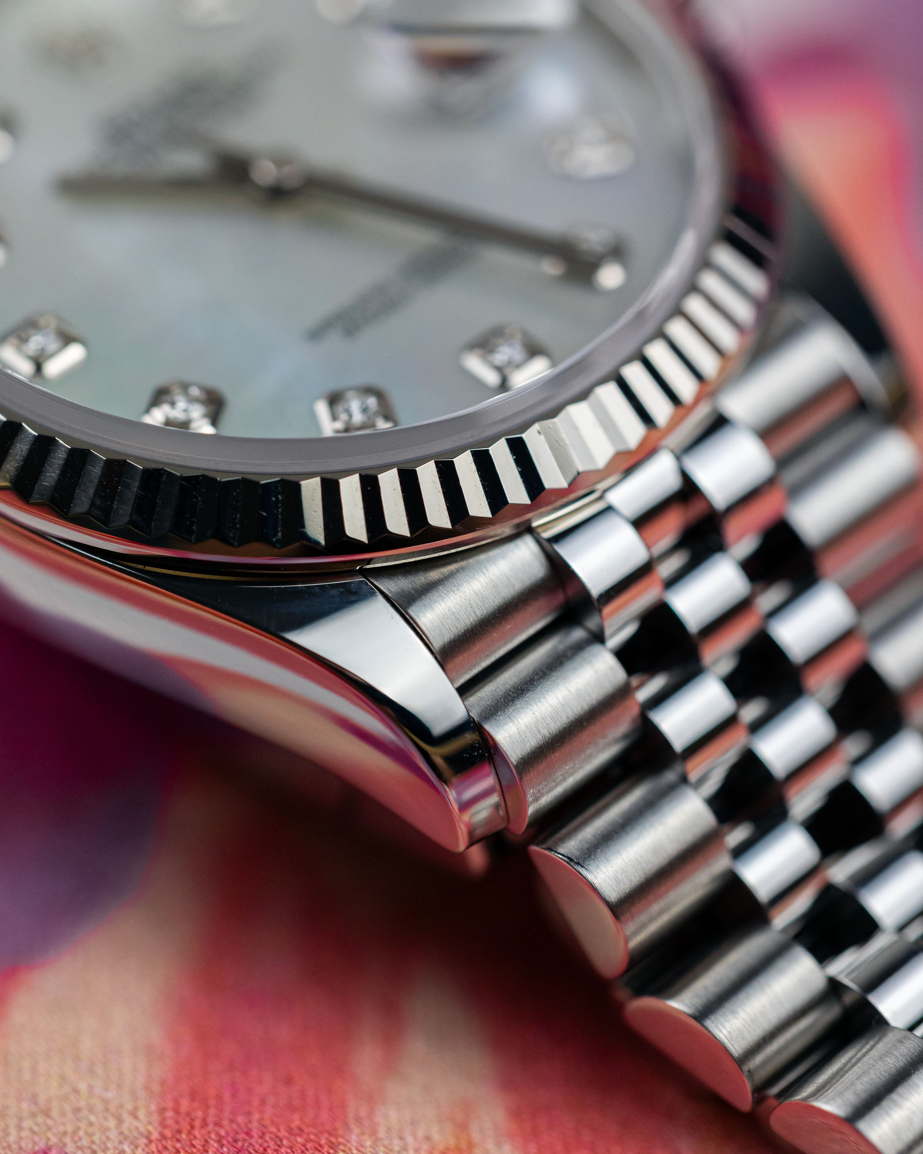 The 36mm Datejust is a classically proportioned ladies watch, the fluted bezel and jubilee bracelet just work so well together. The mother of pearl dial is a stunning backdrop to the diamond hour markers. Each dial is unique and this particular example is nice and even.