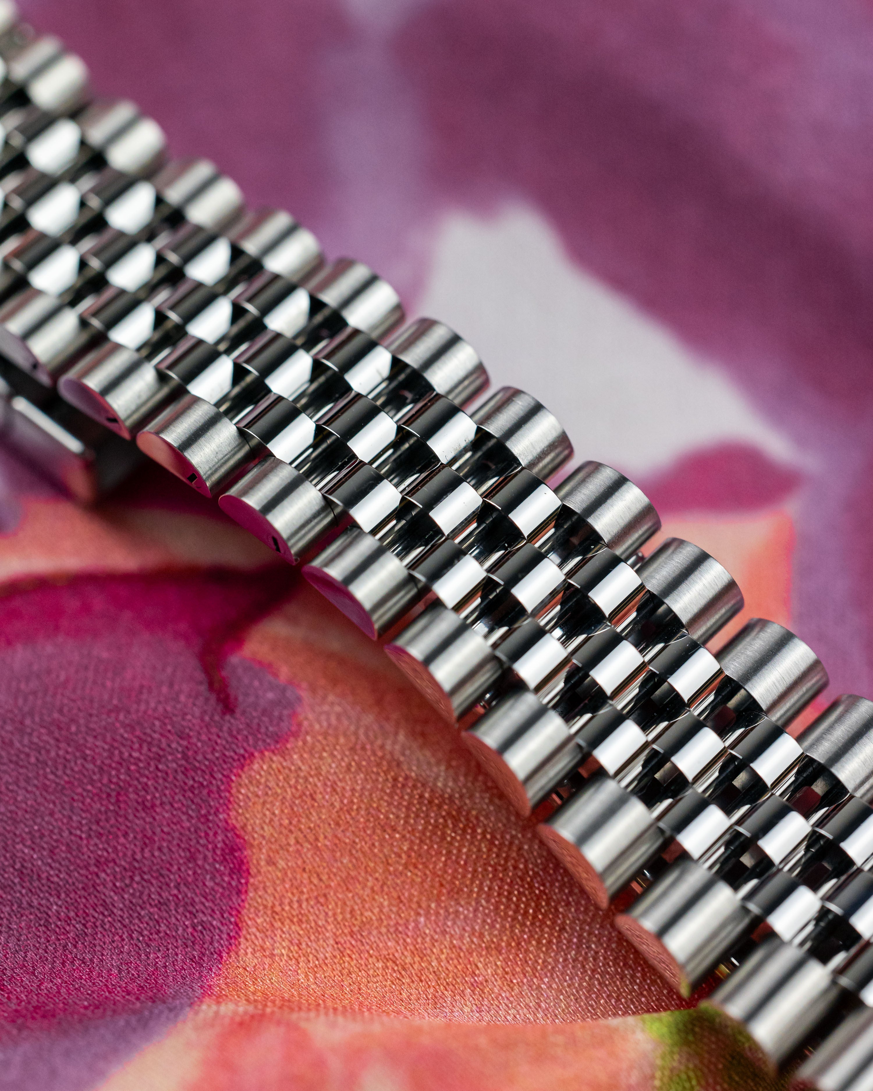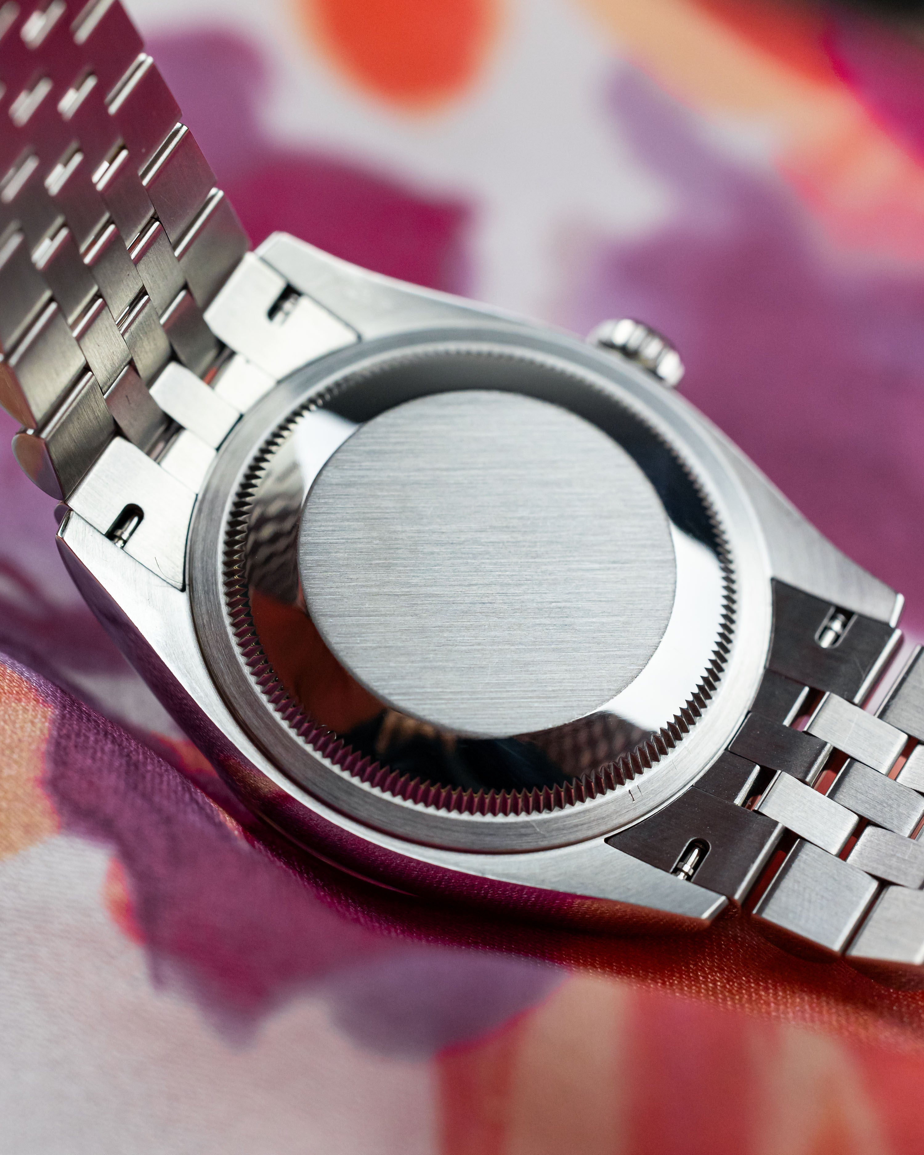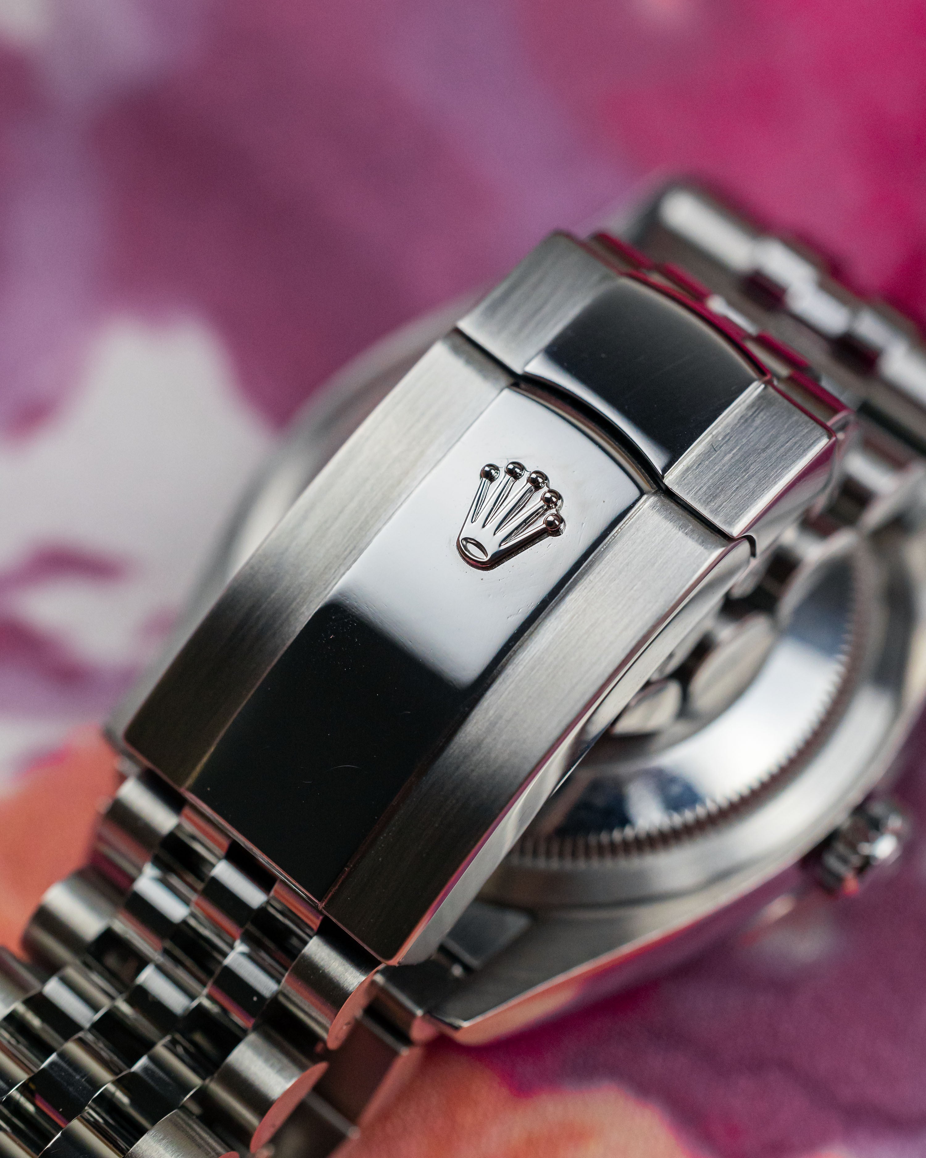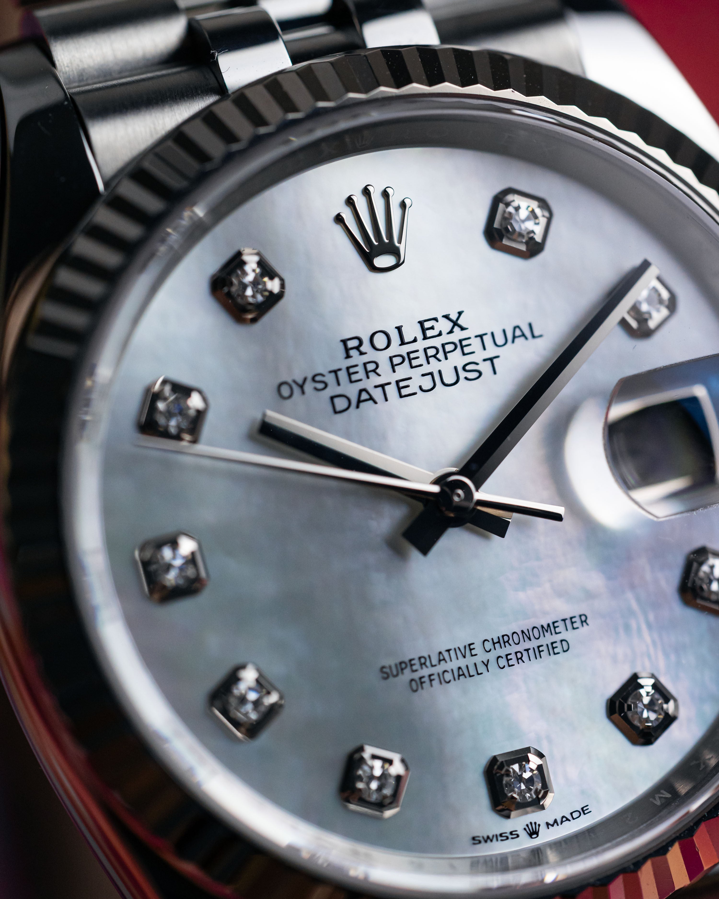The 36mm Datejust is a classically proportioned ladies watch, the fluted bezel and jubilee bracelet just work so well together. The mother of pearl dial is a stunning backdrop to the diamond hour markers. Each dial is unique and this particular example is nice and even.