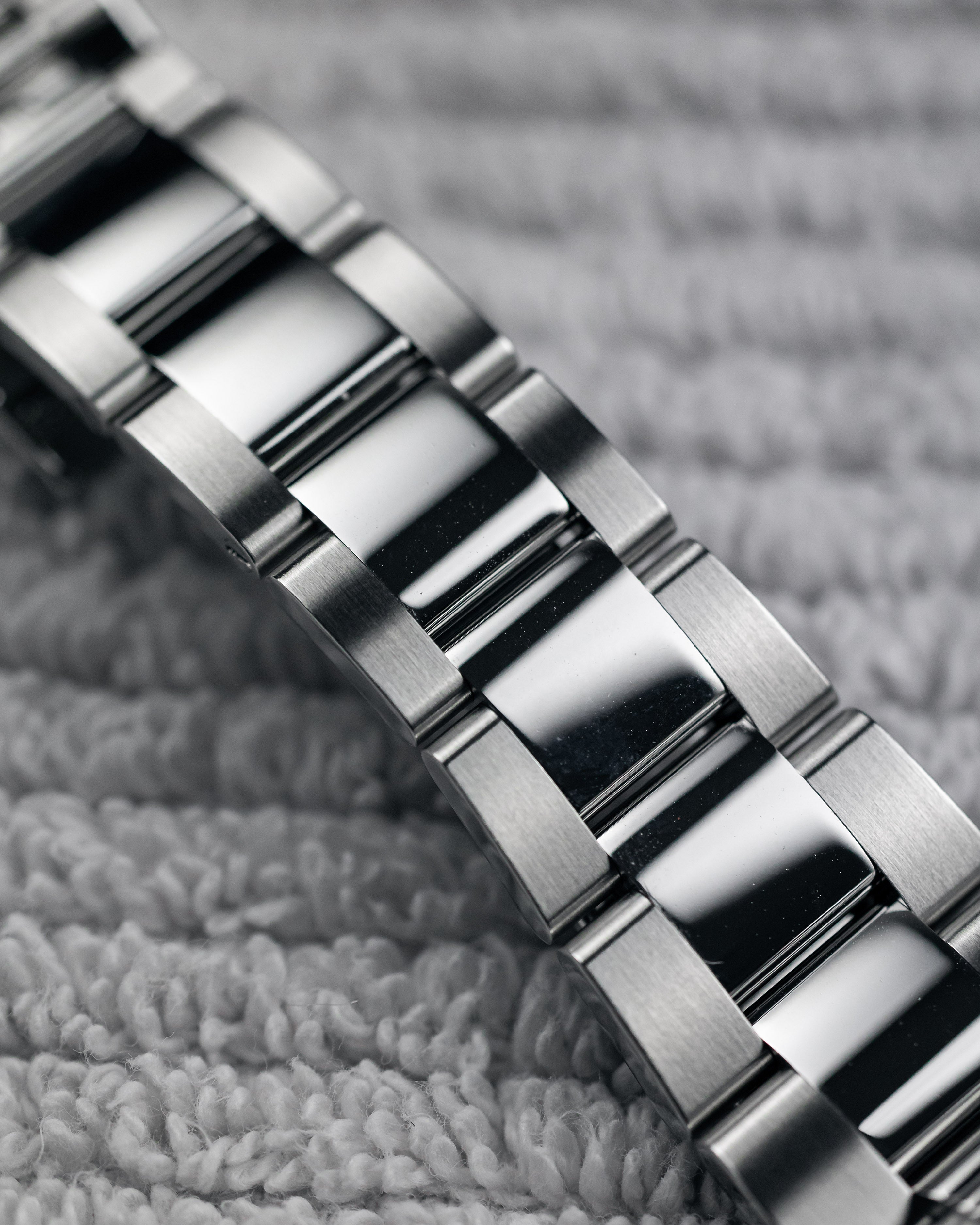 Luminescent Silver Hands and Stick Hour Markers with the Date at 3 o'clock on a Black Dial.