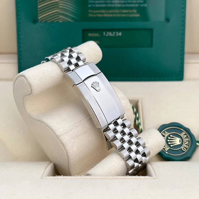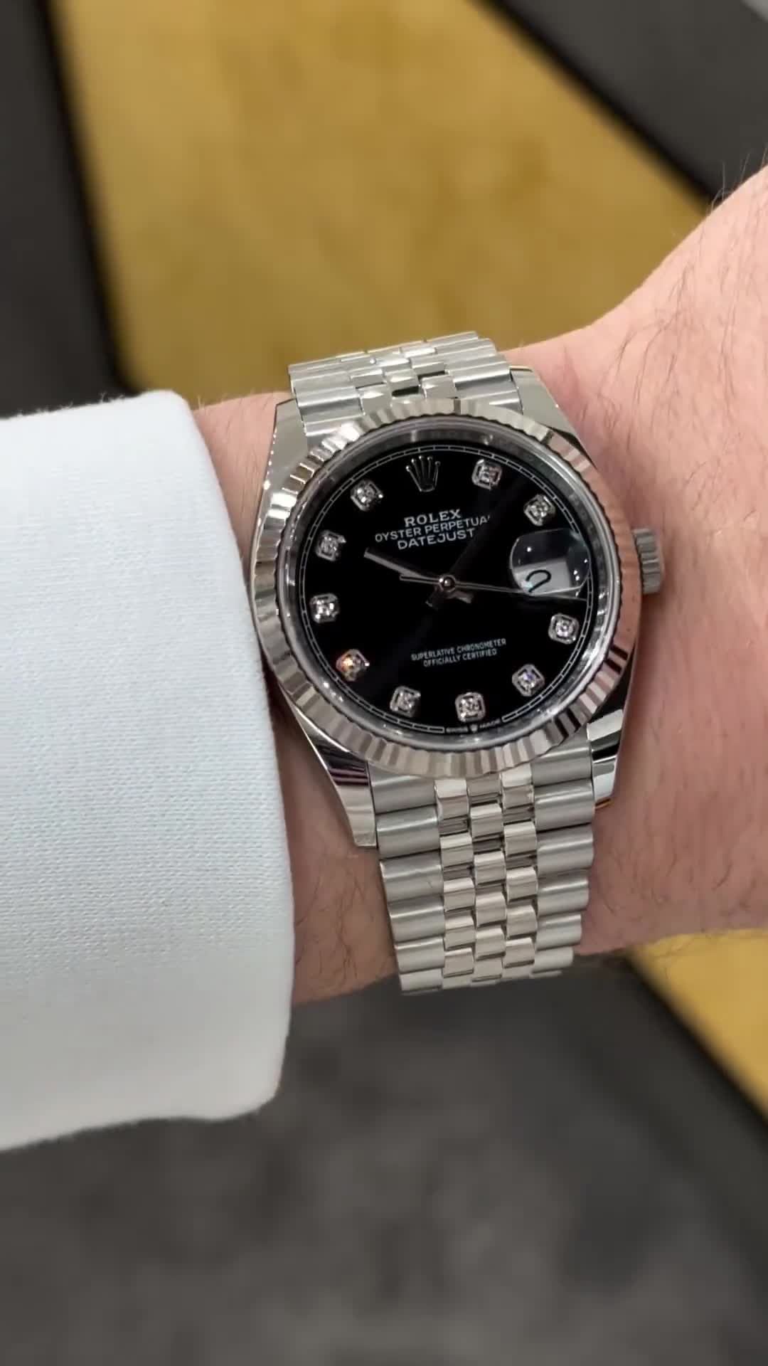 Polished 18kt White Gold Hands. Diamond Hour Markers and the Date Displayed at 3, on a Black Dial.
