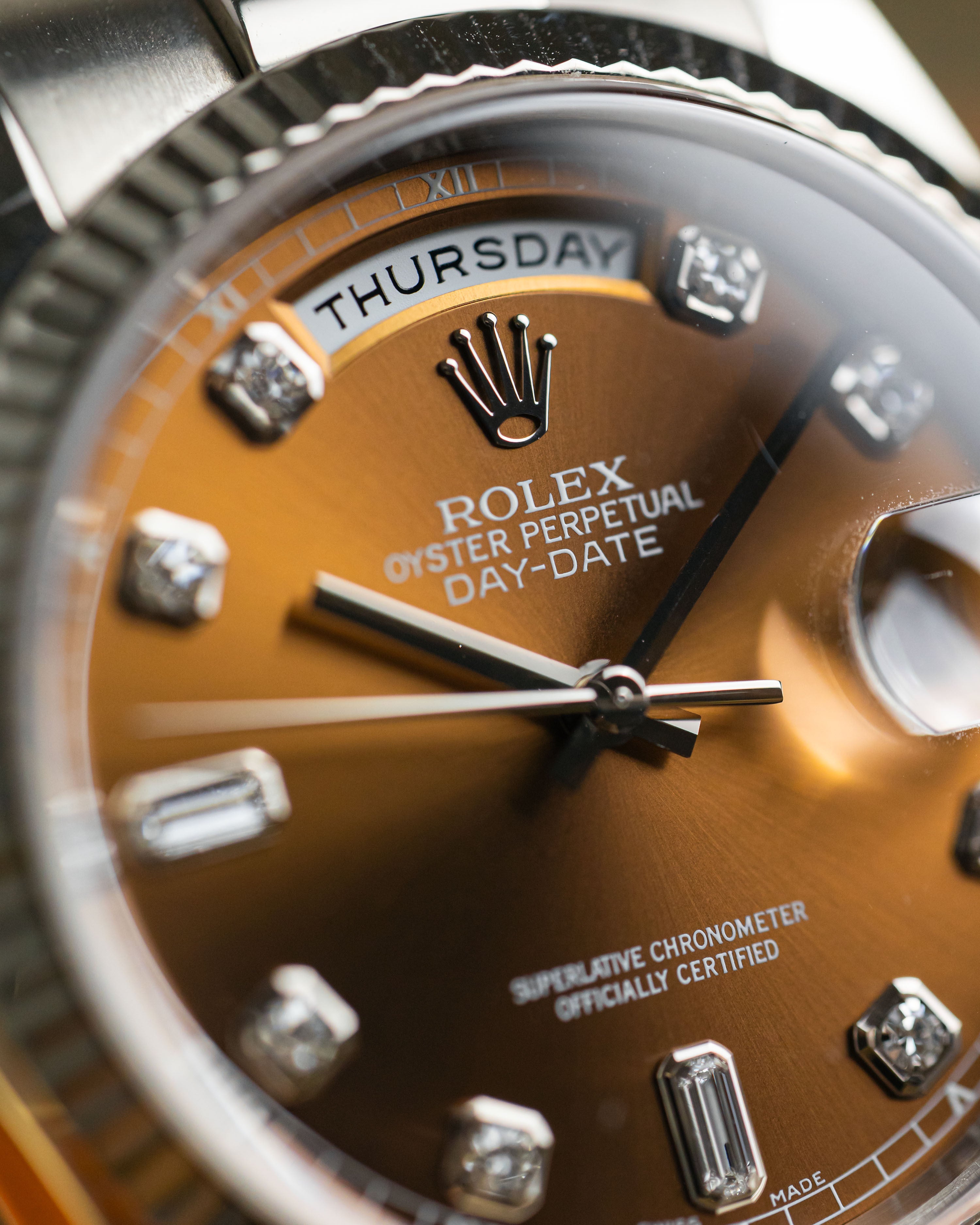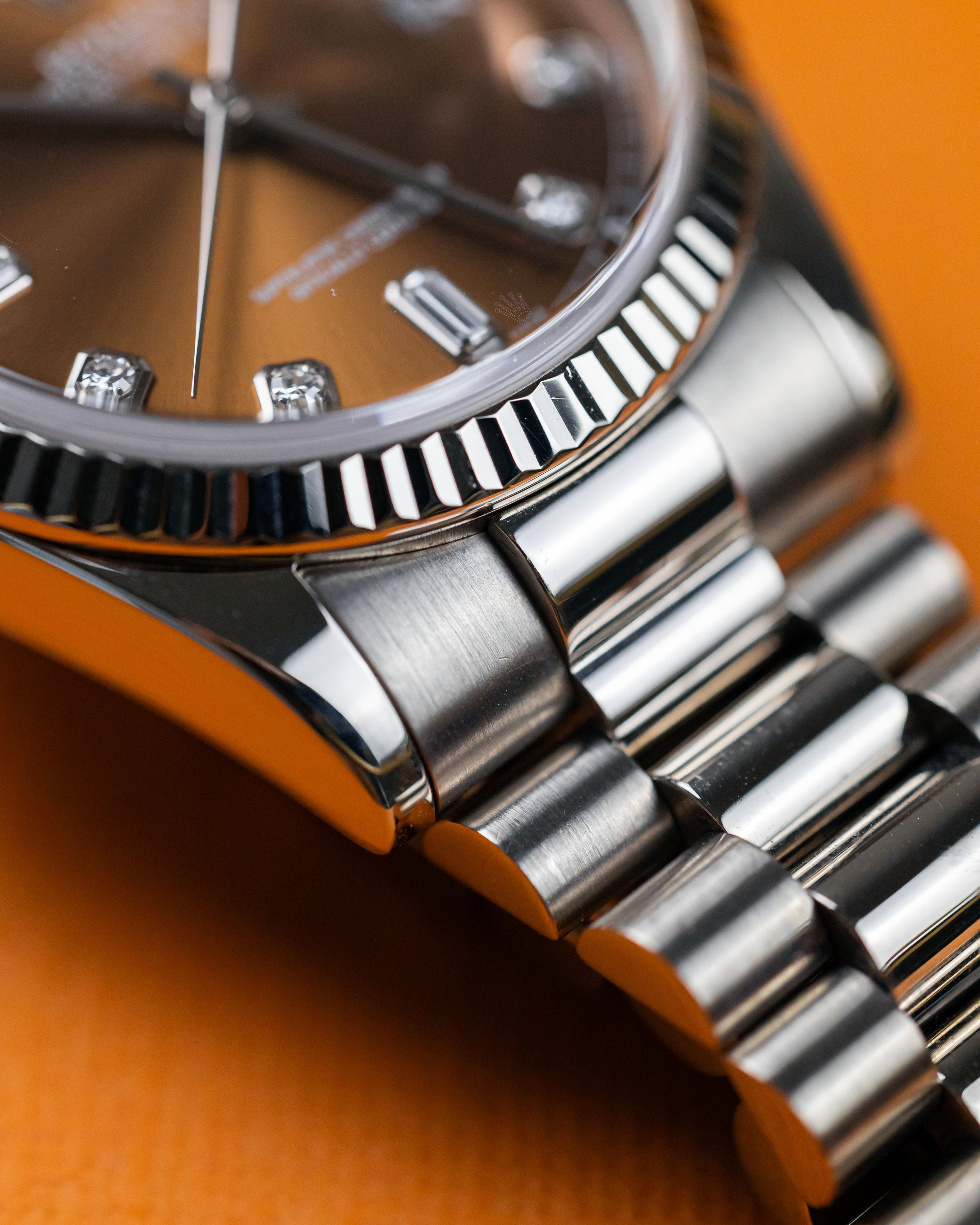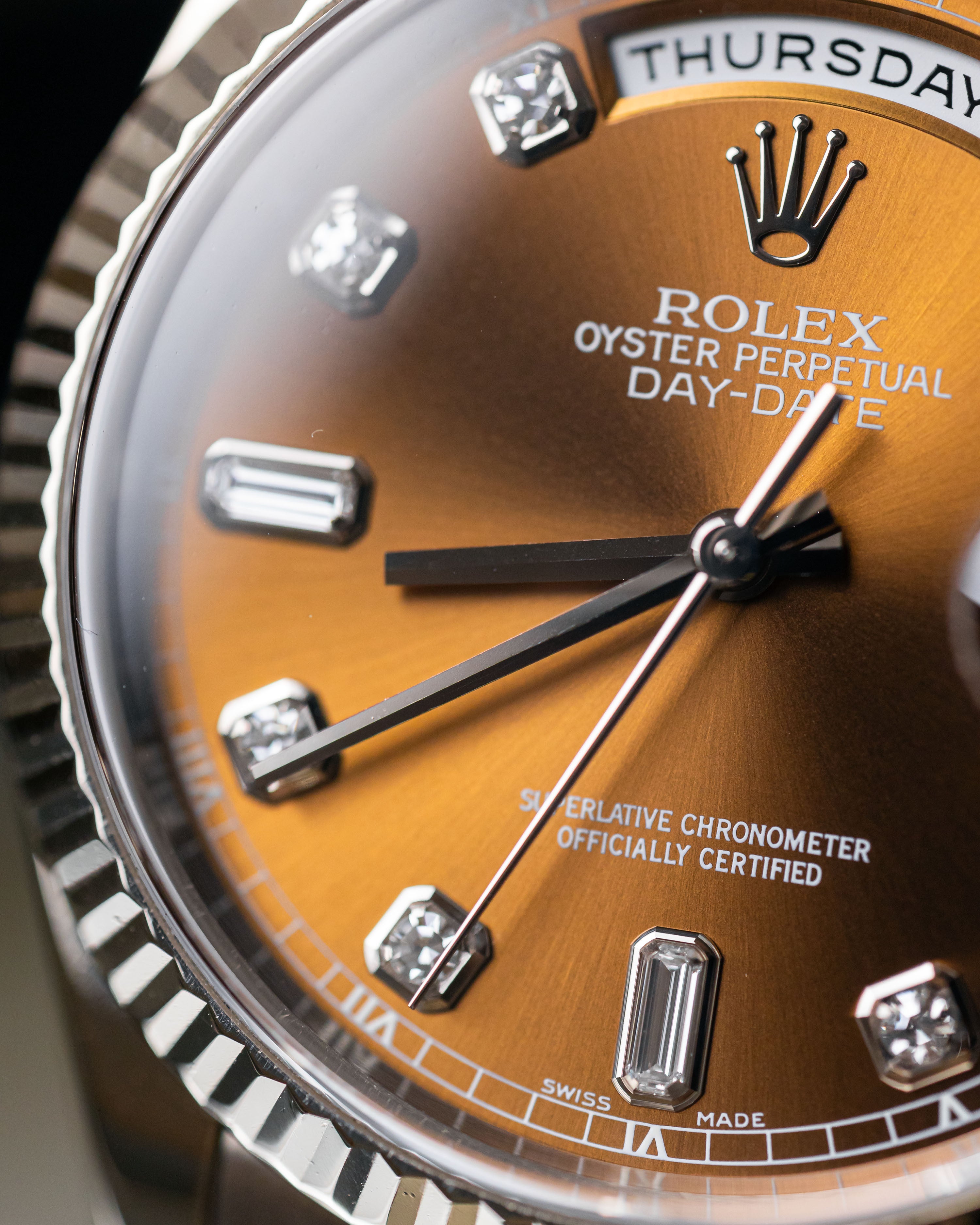 A 36mm Day-Date in white gold with a rare brown sunburst dial featuring brilliant cut and baguette diamonds. We’ve never seen one like this before and it’s quite a stunning combination.