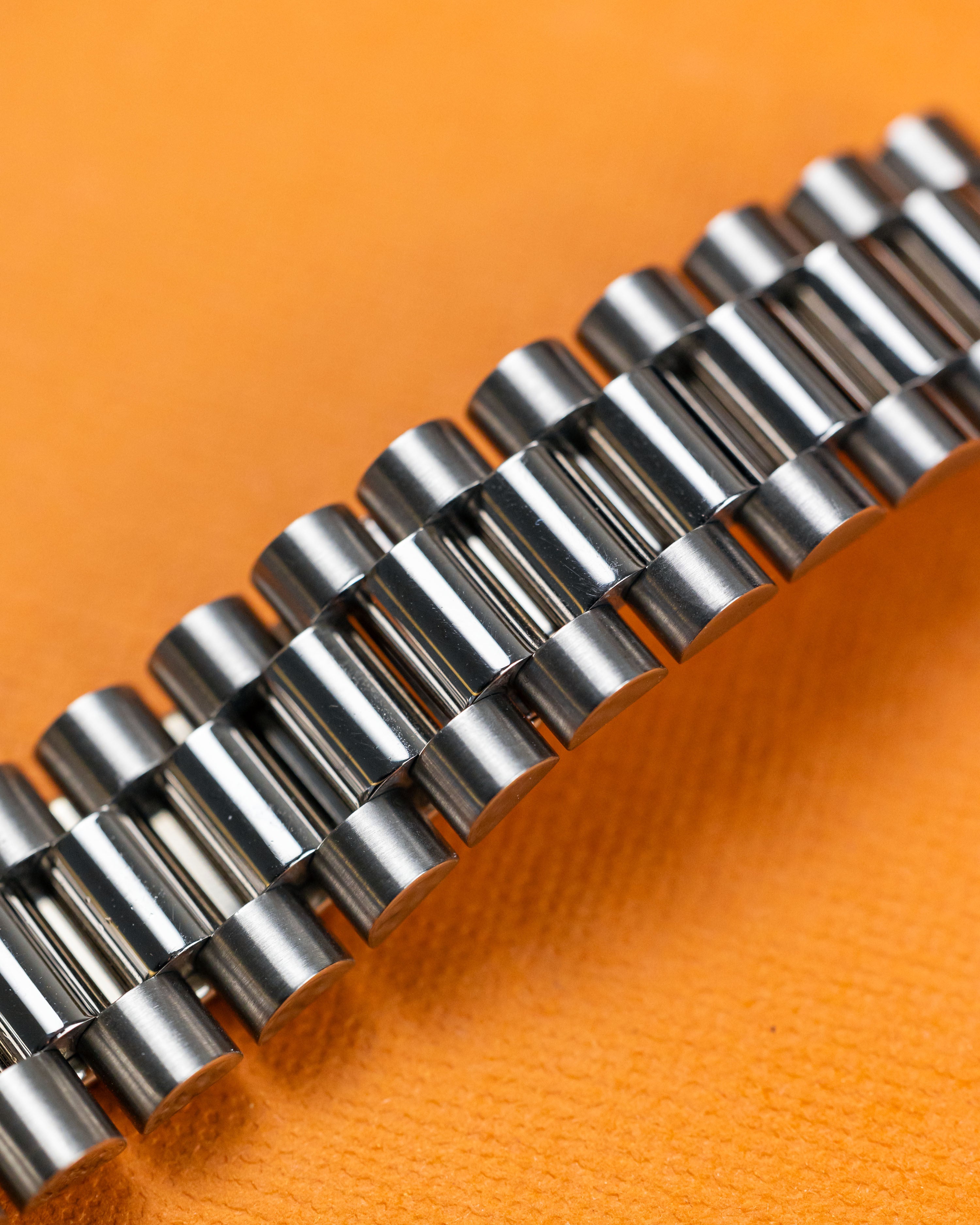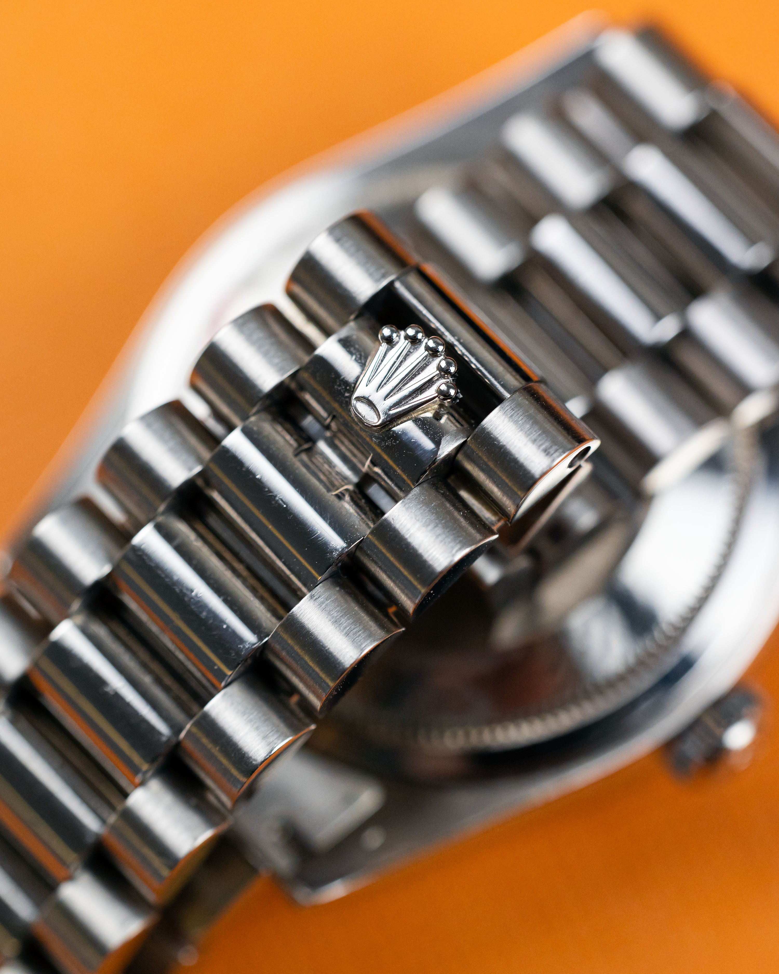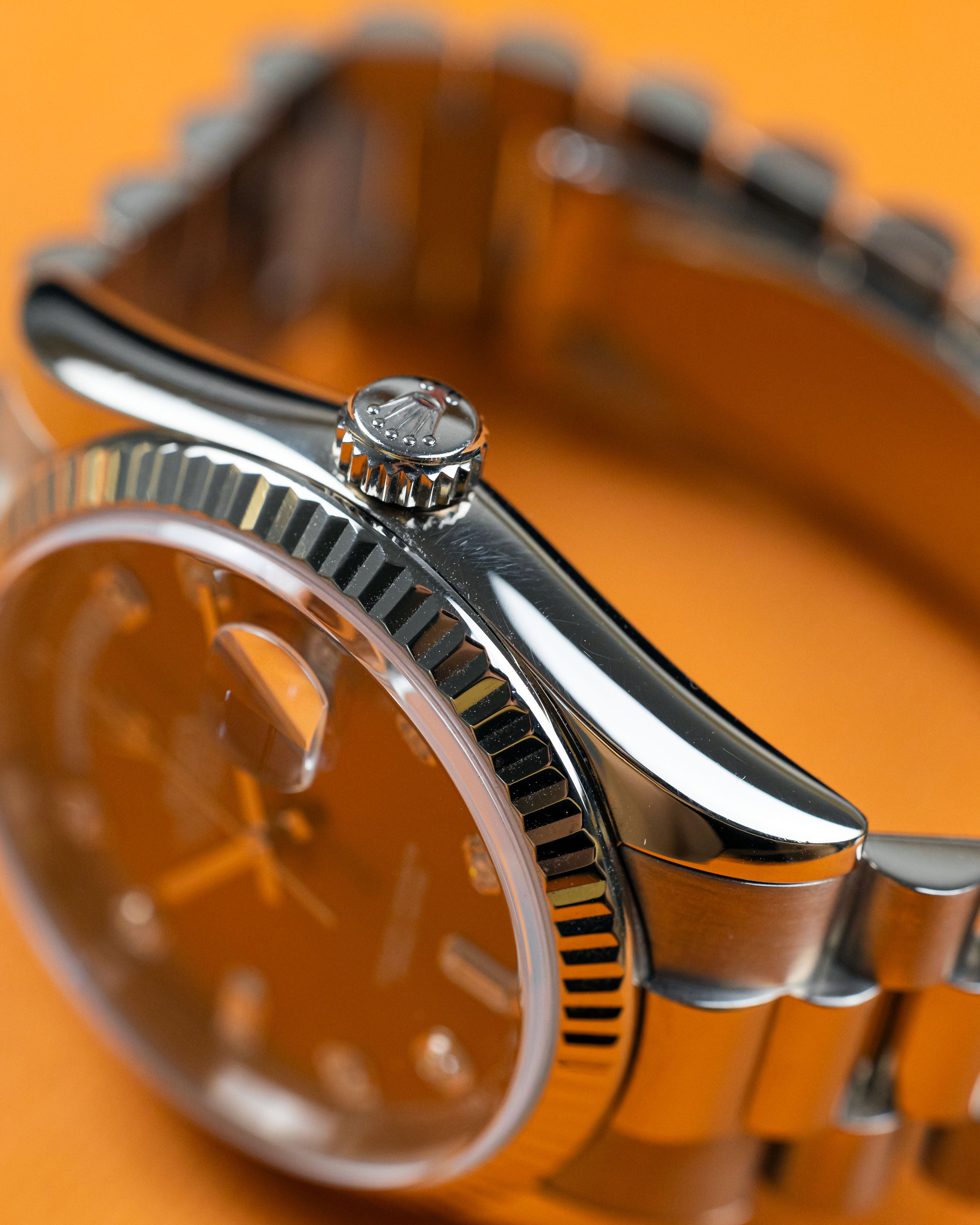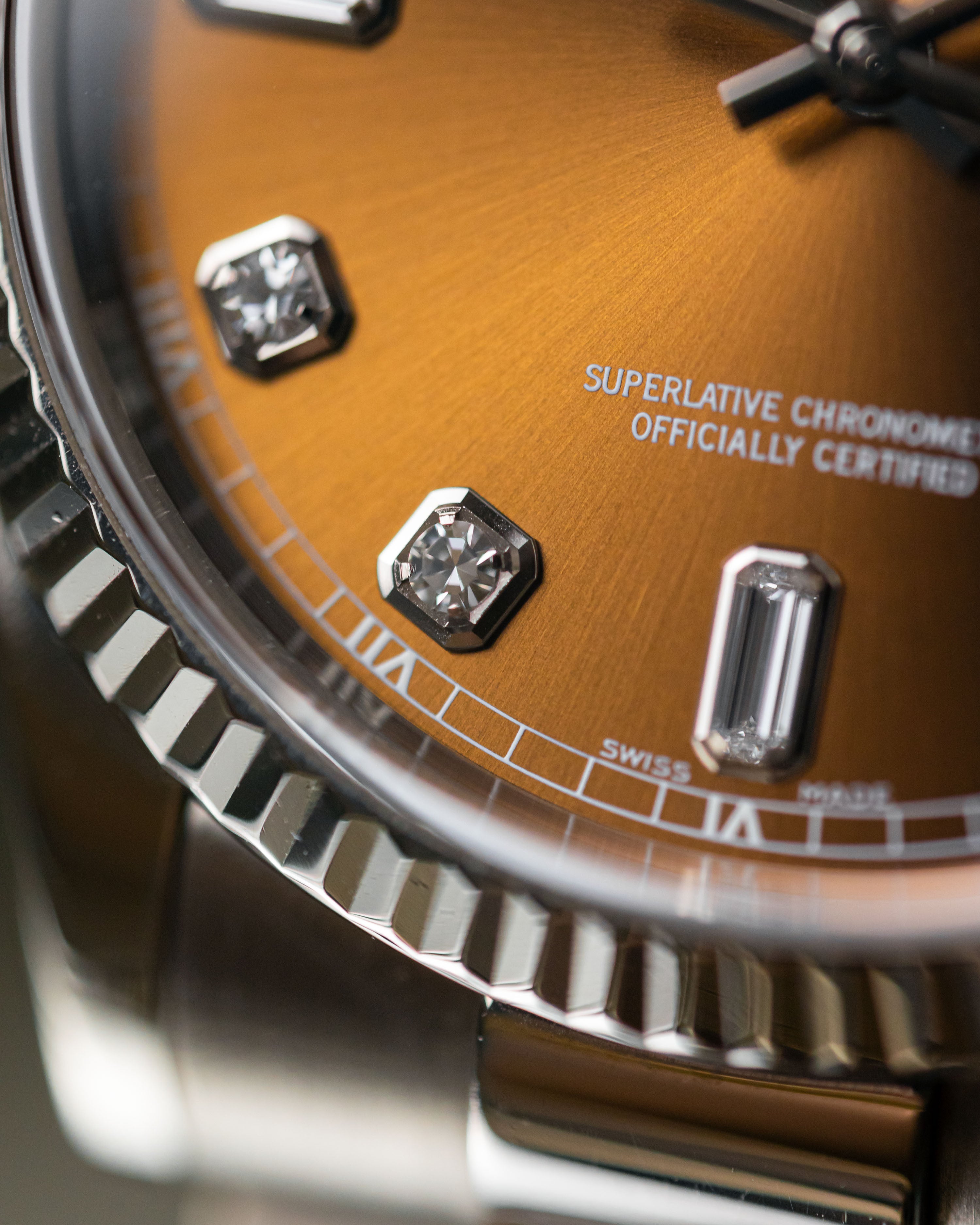 A 36mm Day-Date in white gold with a rare brown sunburst dial featuring brilliant cut and baguette diamonds. We’ve never seen one like this before and it’s quite a stunning combination.