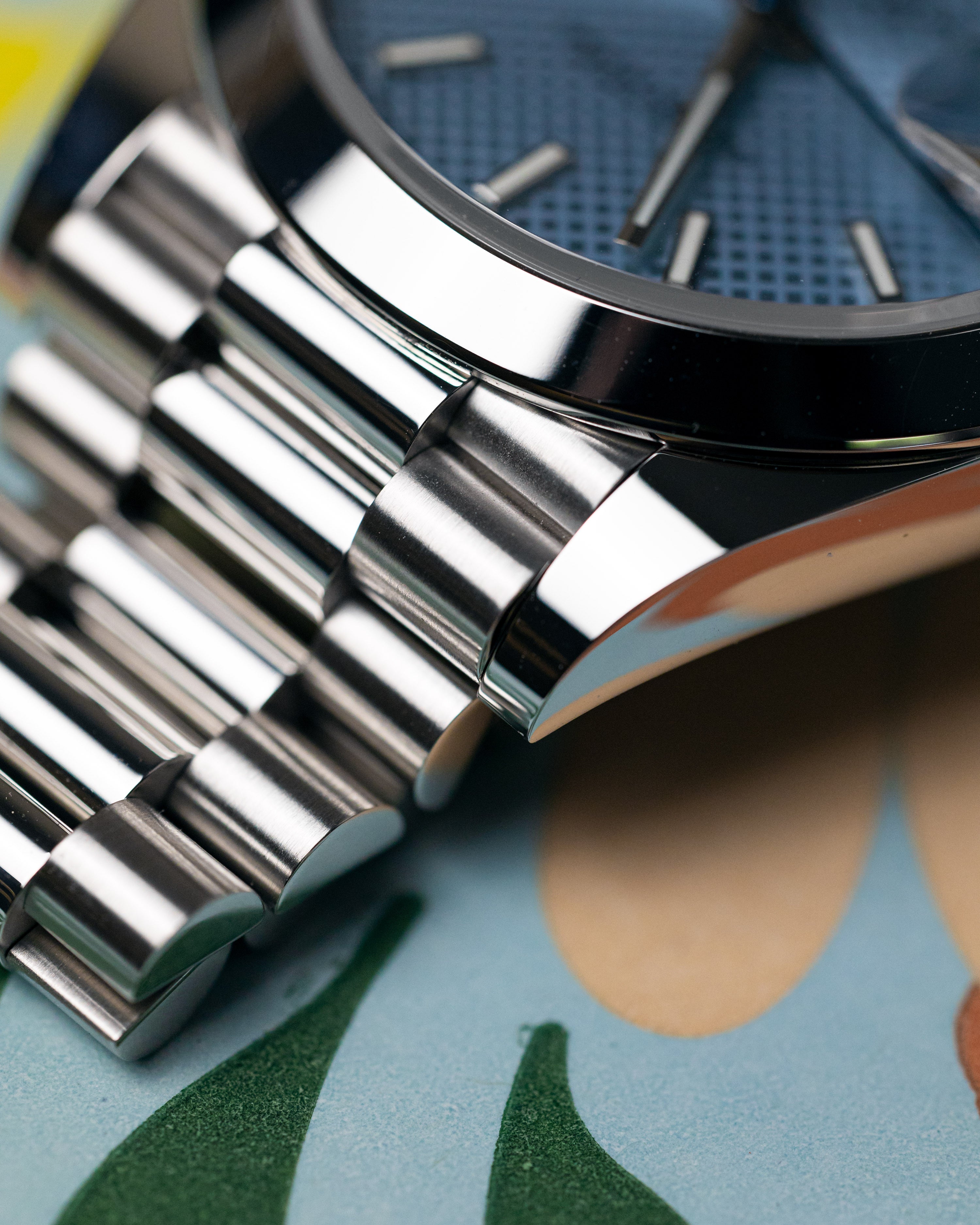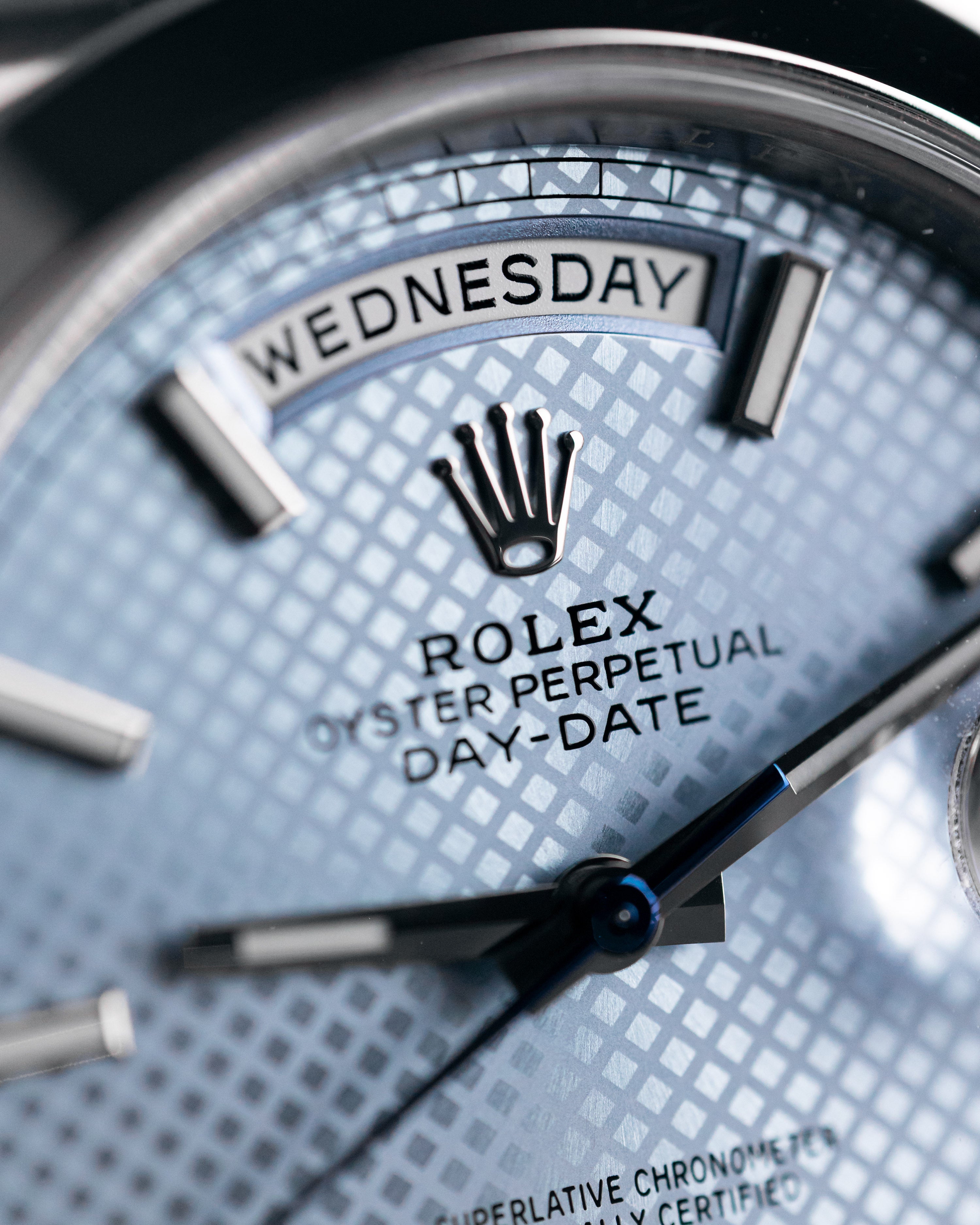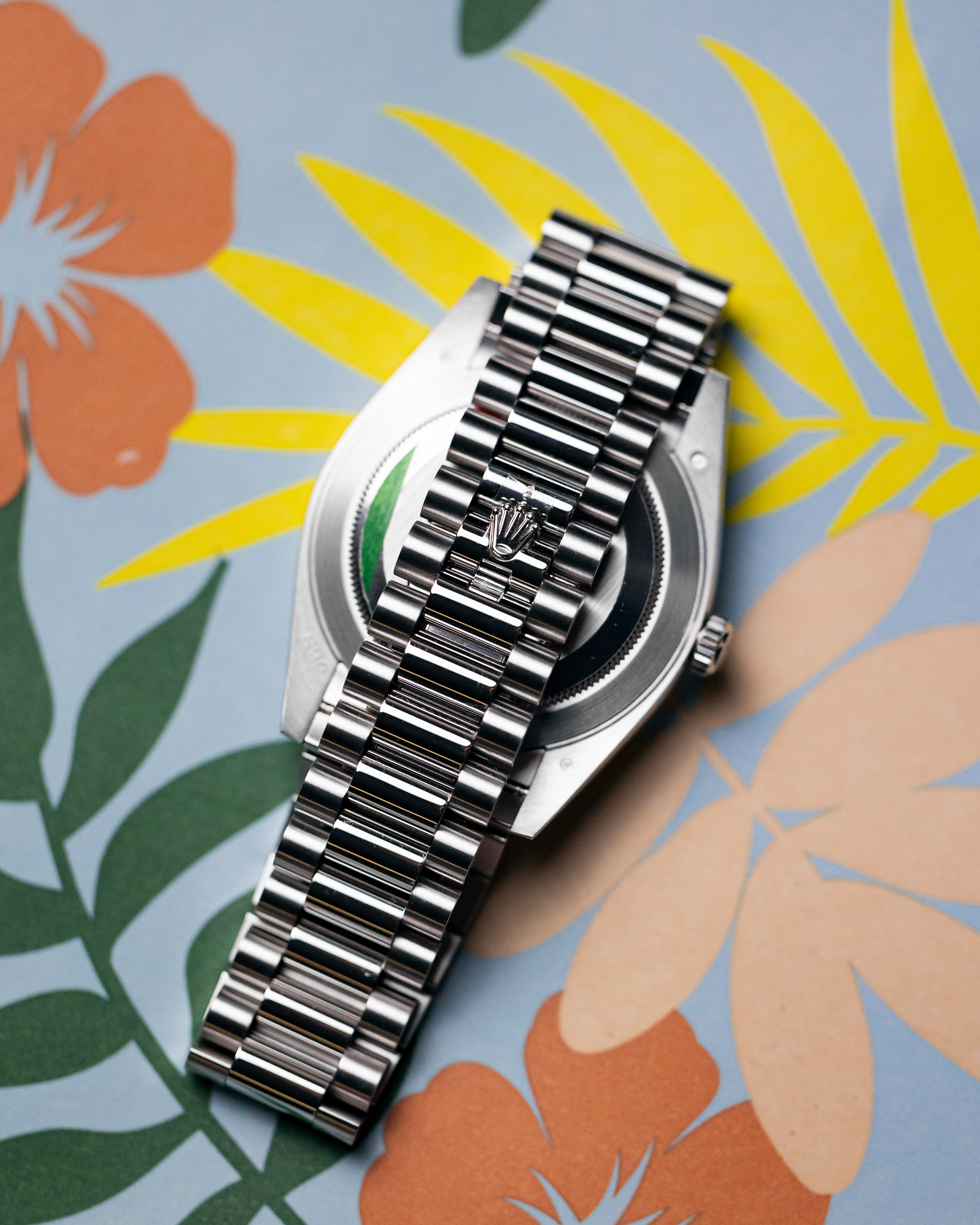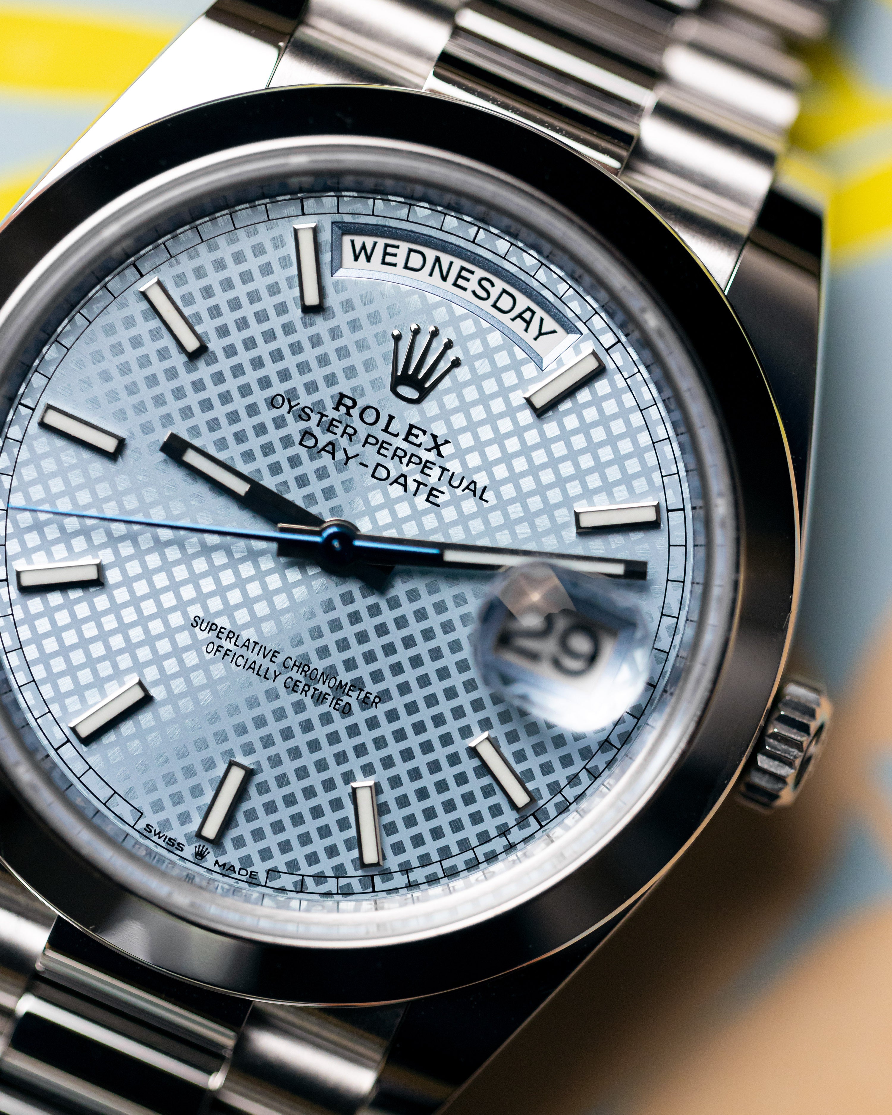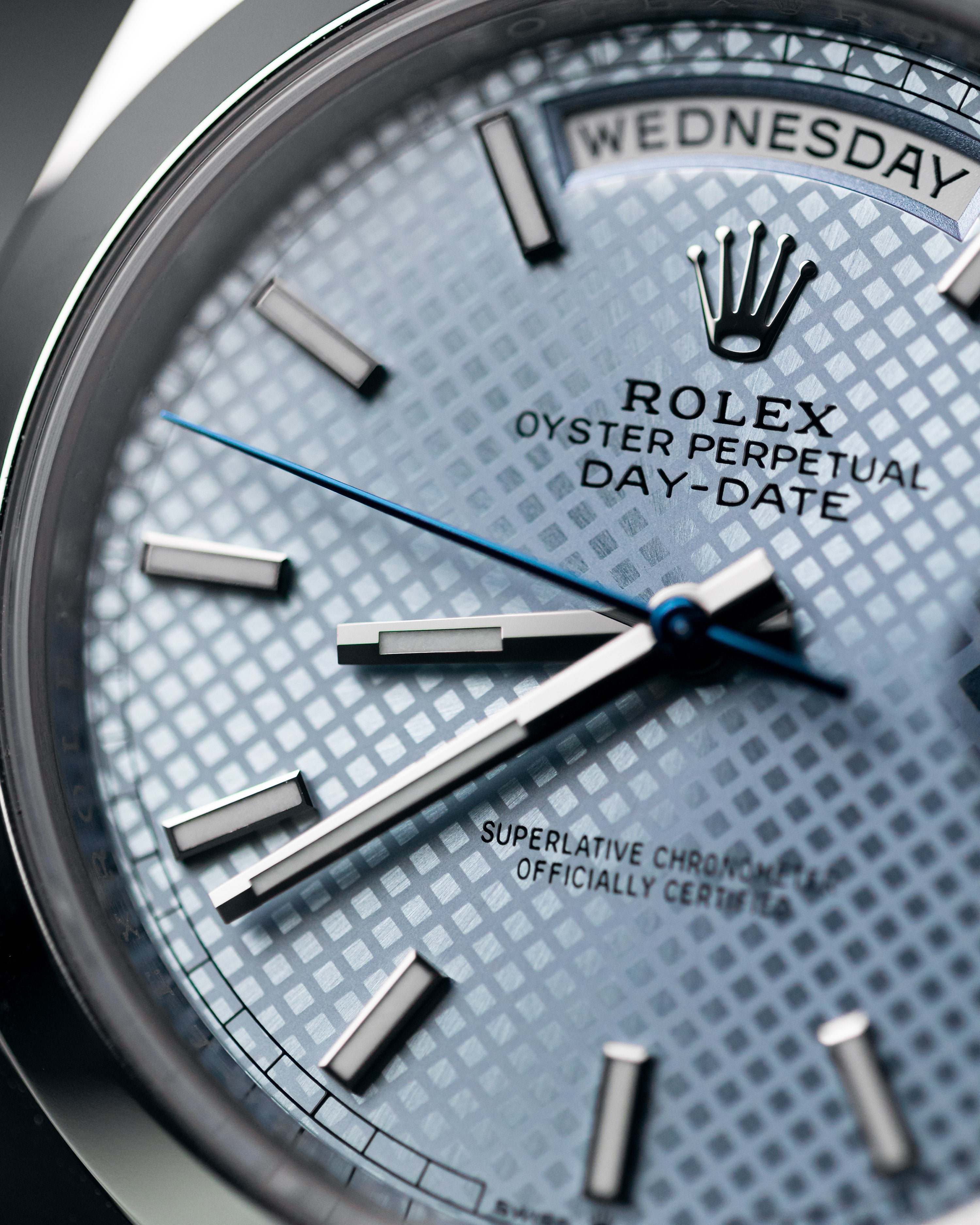 Recently discontinued in 2022, the combination of the ice blue motif dial and smooth bezel platinum day-date is a unique and rare configuration of this watch that is unlikely to be repeated in the near future.