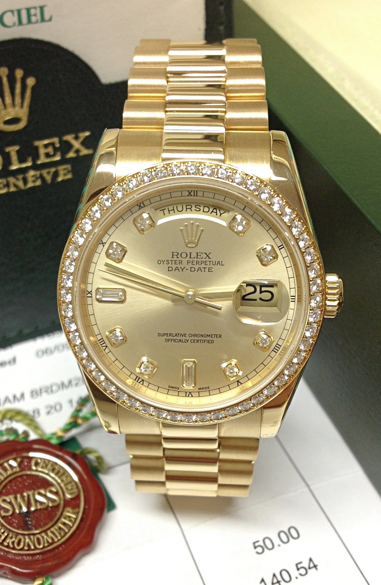 The iconic President bracelet, a hallmark of Rolex's design, not only enhances the watch's allure but also ensures unparalleled comfort on your wrist. The exquisite craftsmanship of the bracelet further accentuates the allure of this elegant timepiece, making it a statement of refinement and sophistication.