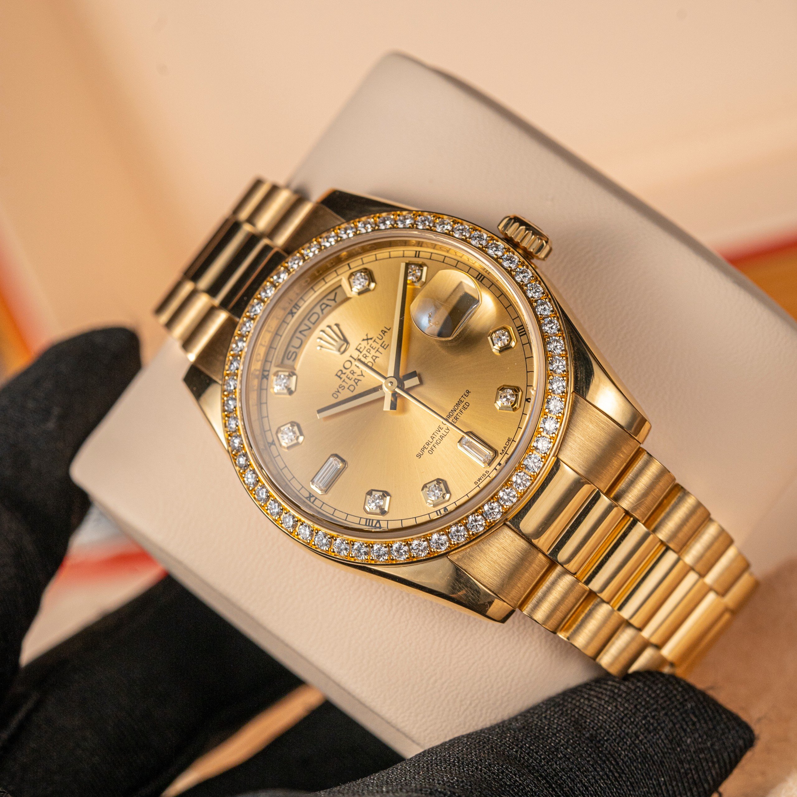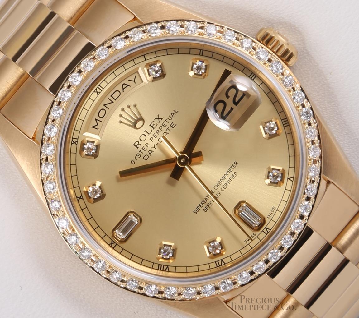 The Oyster Perpetual Day-Date is inlaid in a sophisticated 40mm 18k yellow gold case surrounding a champagne dial set with 10 baguette-cut diamonds. The bezel is exquisitely set with diamonds. The symbolic 18k yellow gold presidential bracelet includes semi-circular three-piece links and concealed Crownclasp, being the most sought-out timepiece to date.