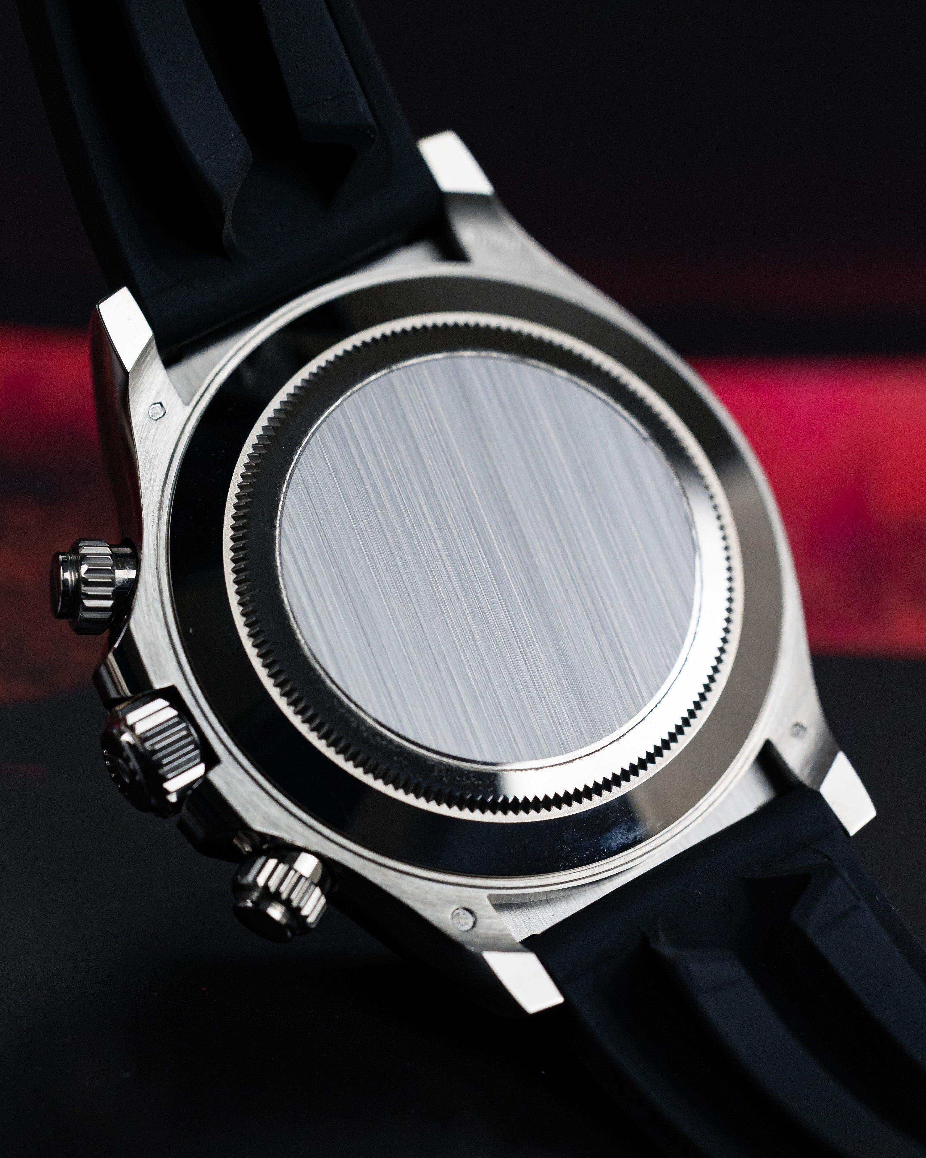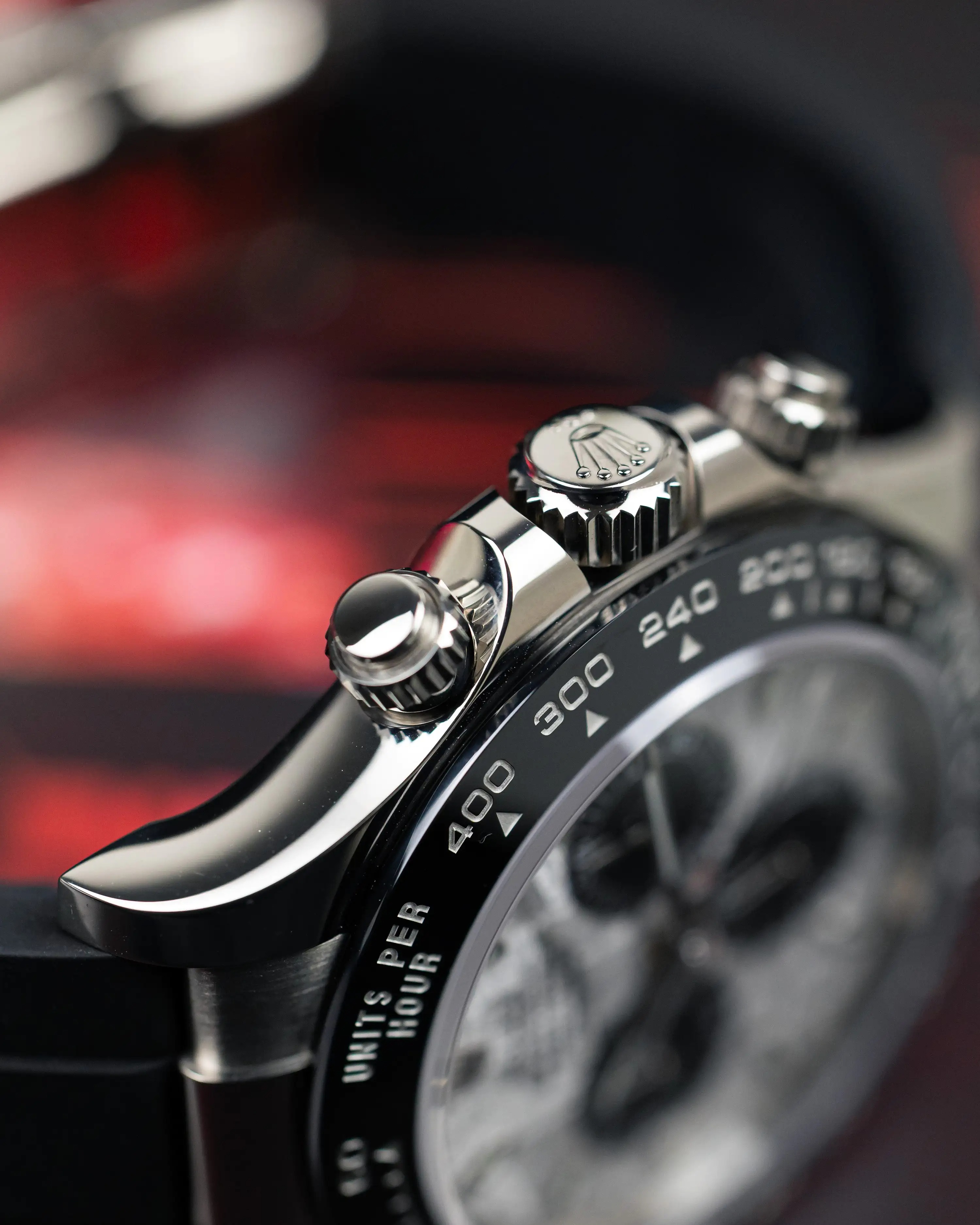 A key part of the model’s identity is the bezel moulded with a tachymetric scale for measuring average speeds of up to 400 miles or kilometres per hour. Blending of high technology with sleek aesthetics, the black bezel is reminiscent of the 1965 model that was fitted with a black Plexiglas bezel insert.
