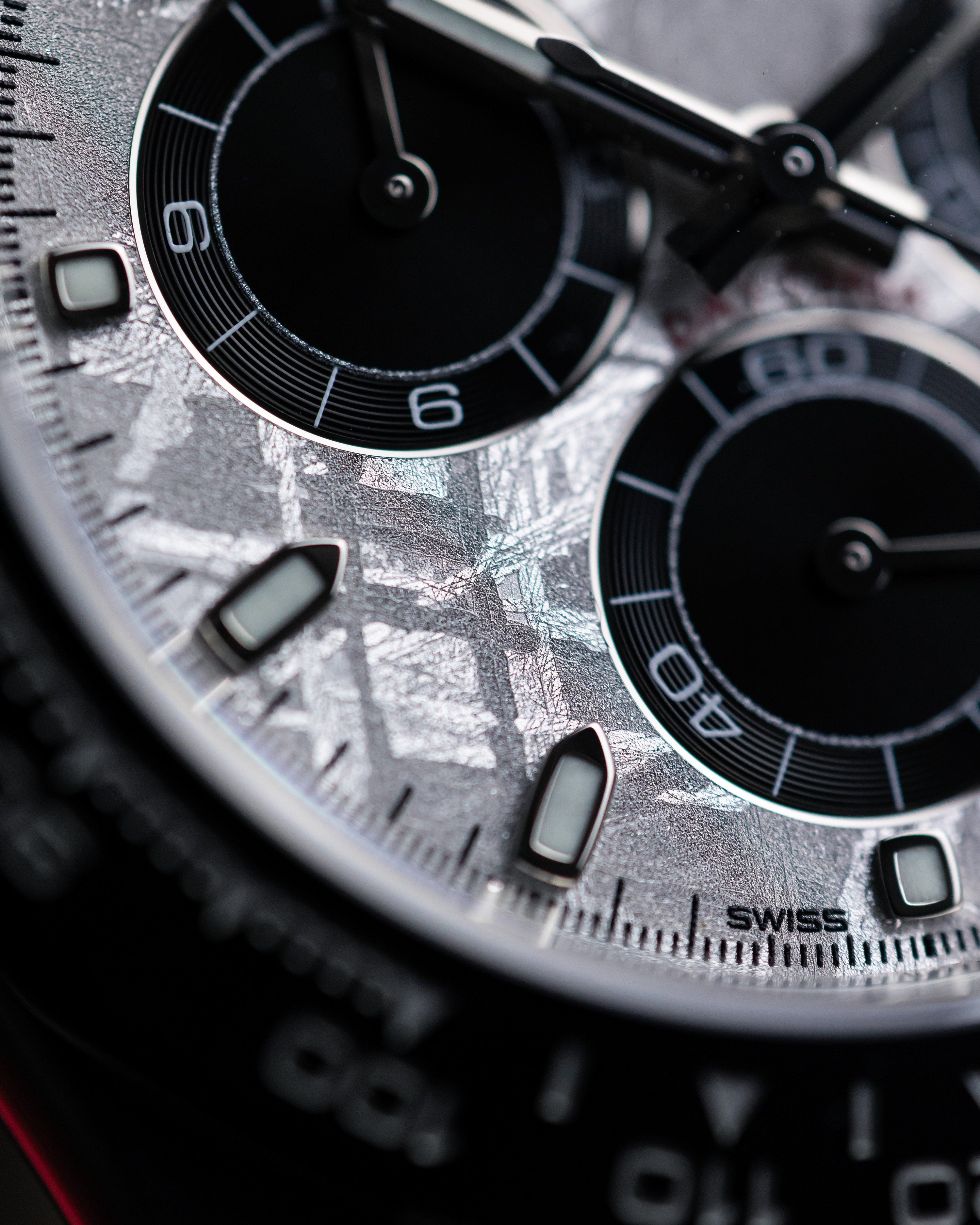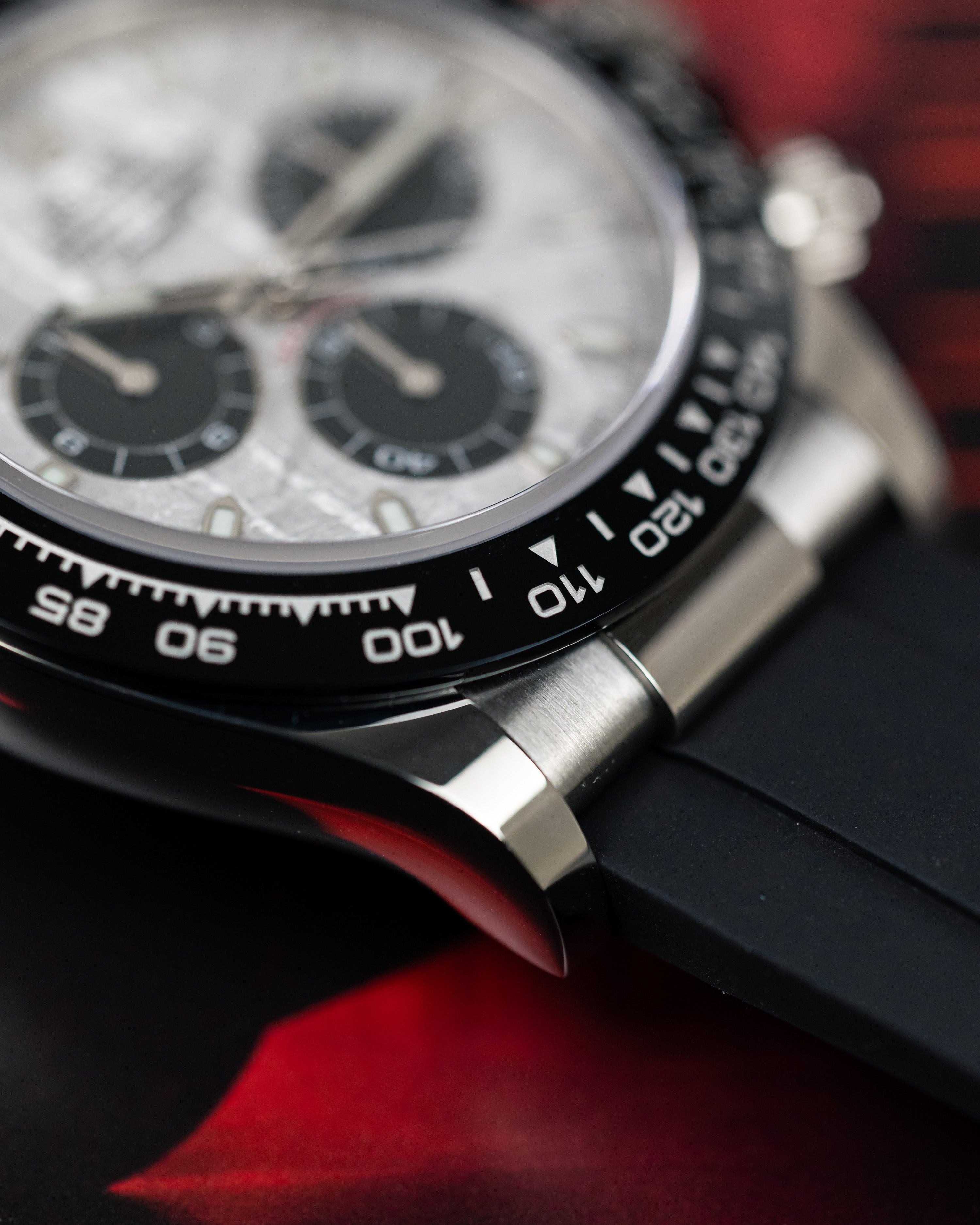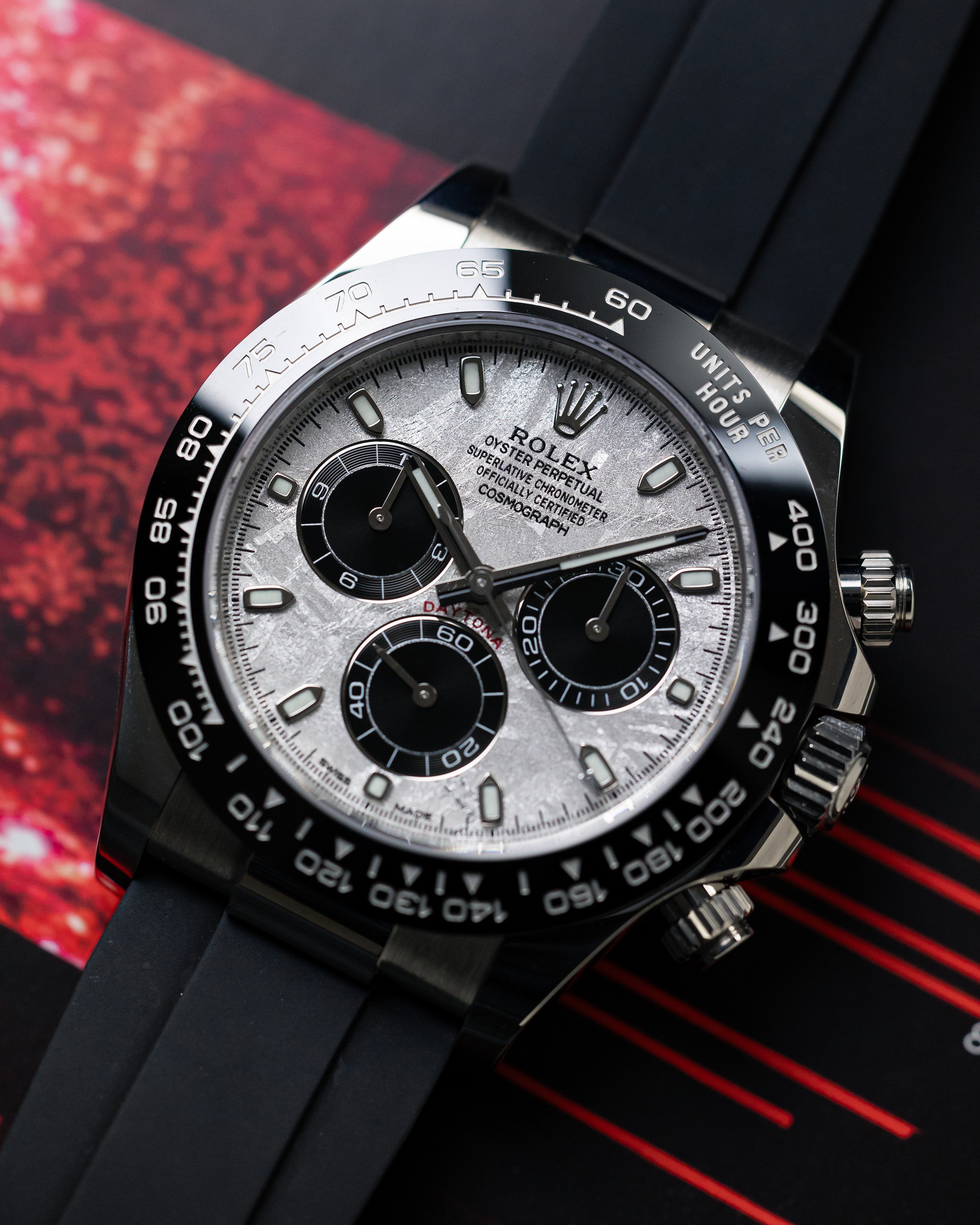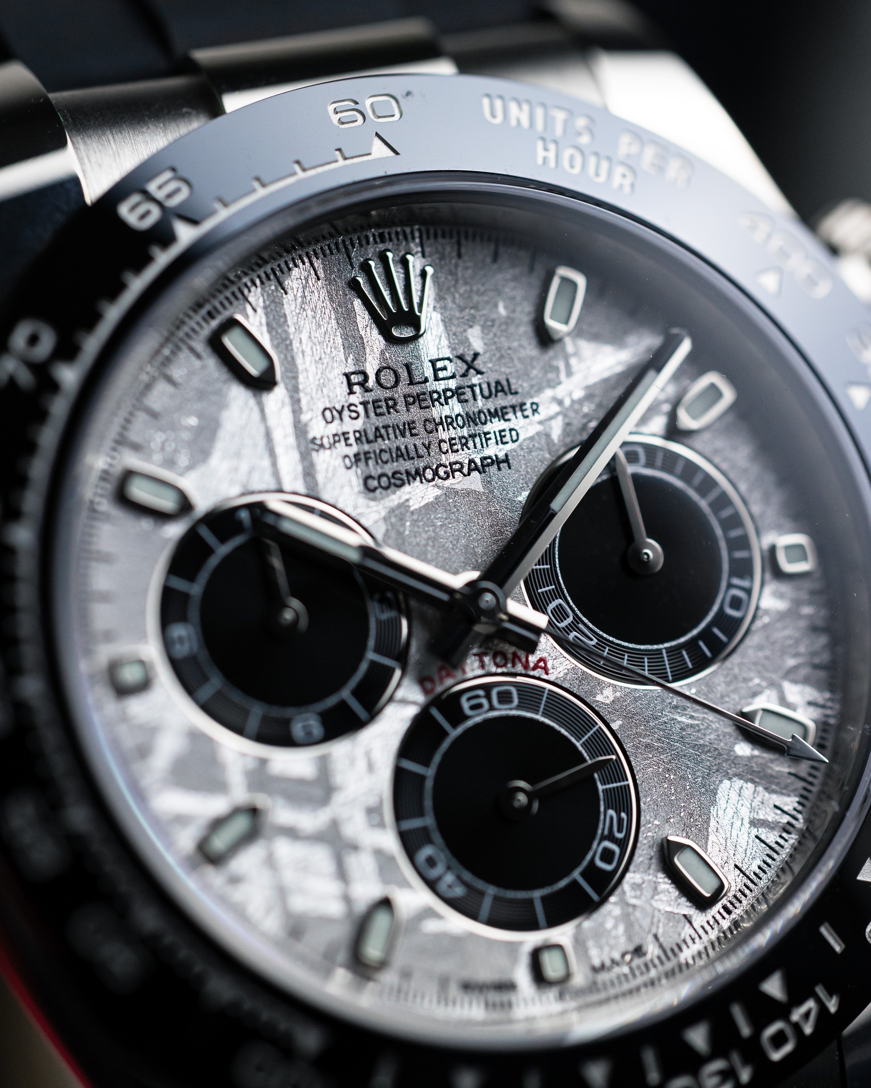 Meteorite comes from the heart of an asteroid or possibly even a planet that has exploded, propelling material across the Solar System until chance brings it into our planet’s orbit and gravity pulls it to Earth. During its journey, the centre of the meteorite is gradually transformed, producing highly unusual metallic patterns, resulting from the very slow cooling of molten asteroid cores. The designers at Rolex create from these configurations a unique treasure for some of the most prestigious models, including this Cosmograph Daytona.