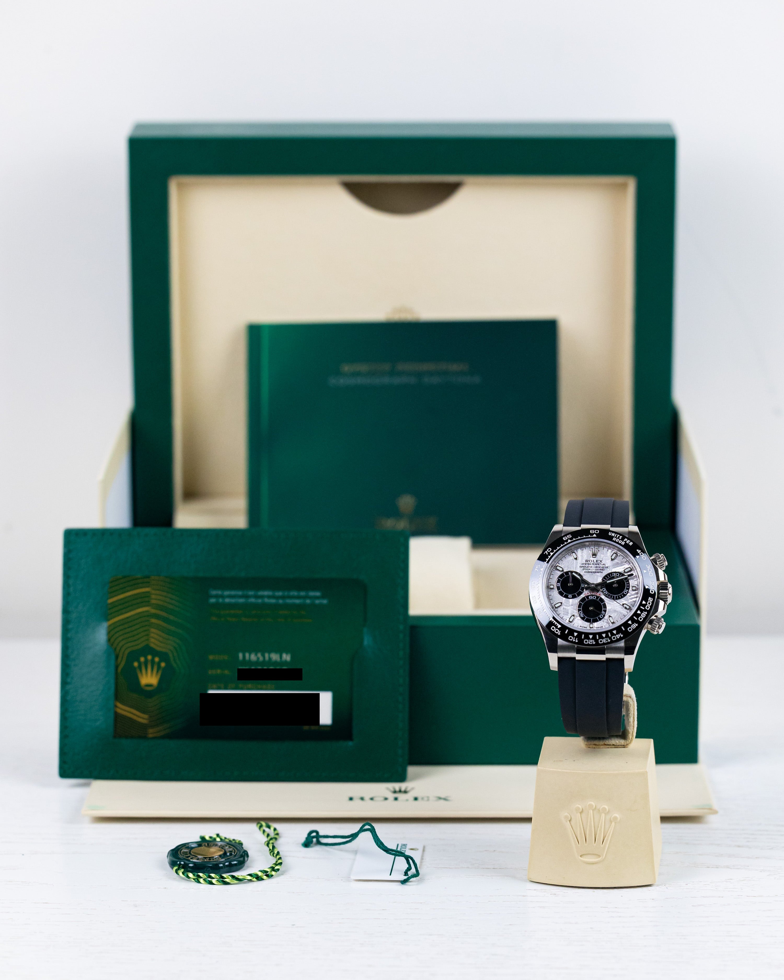 Unworn Rolex Cosmograph Daytona 40mm 18k White Gold Sport Chronograph watch. Solid, polished finished, 18kt white gold case with brushed and polished finished center lugs.