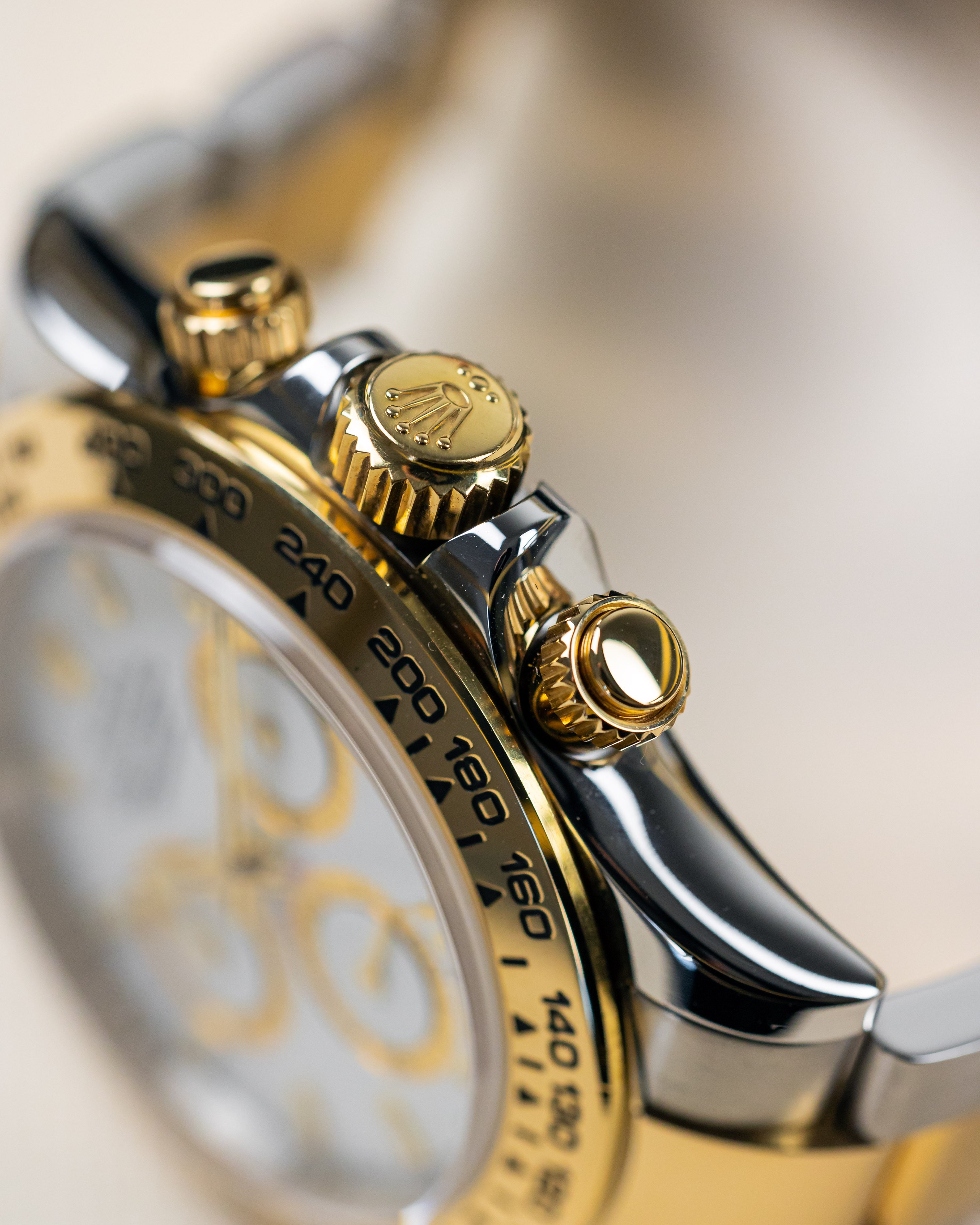 - Solid 18k Yellow Gold Triplock Screw Down Crown & Chronograph Buttons