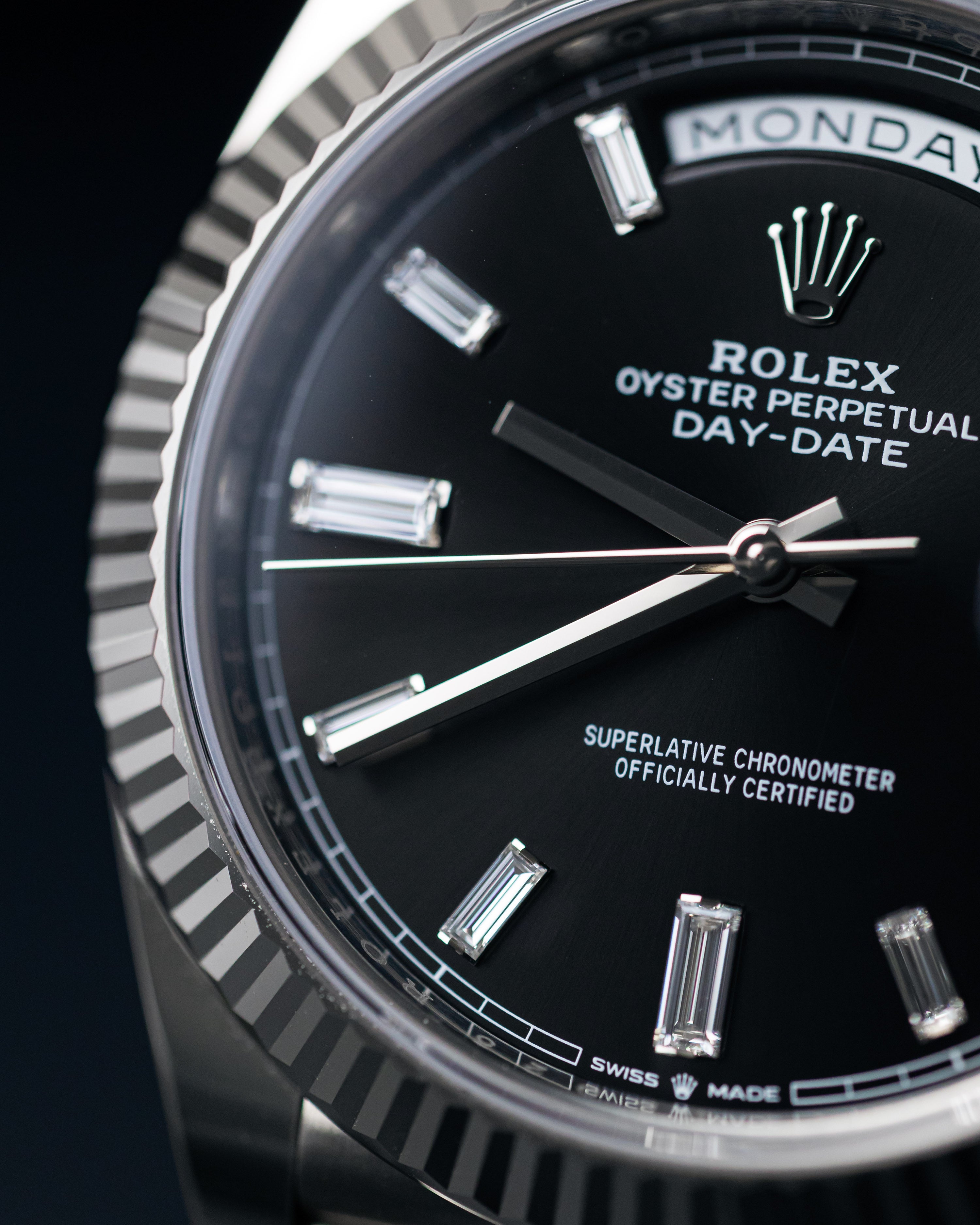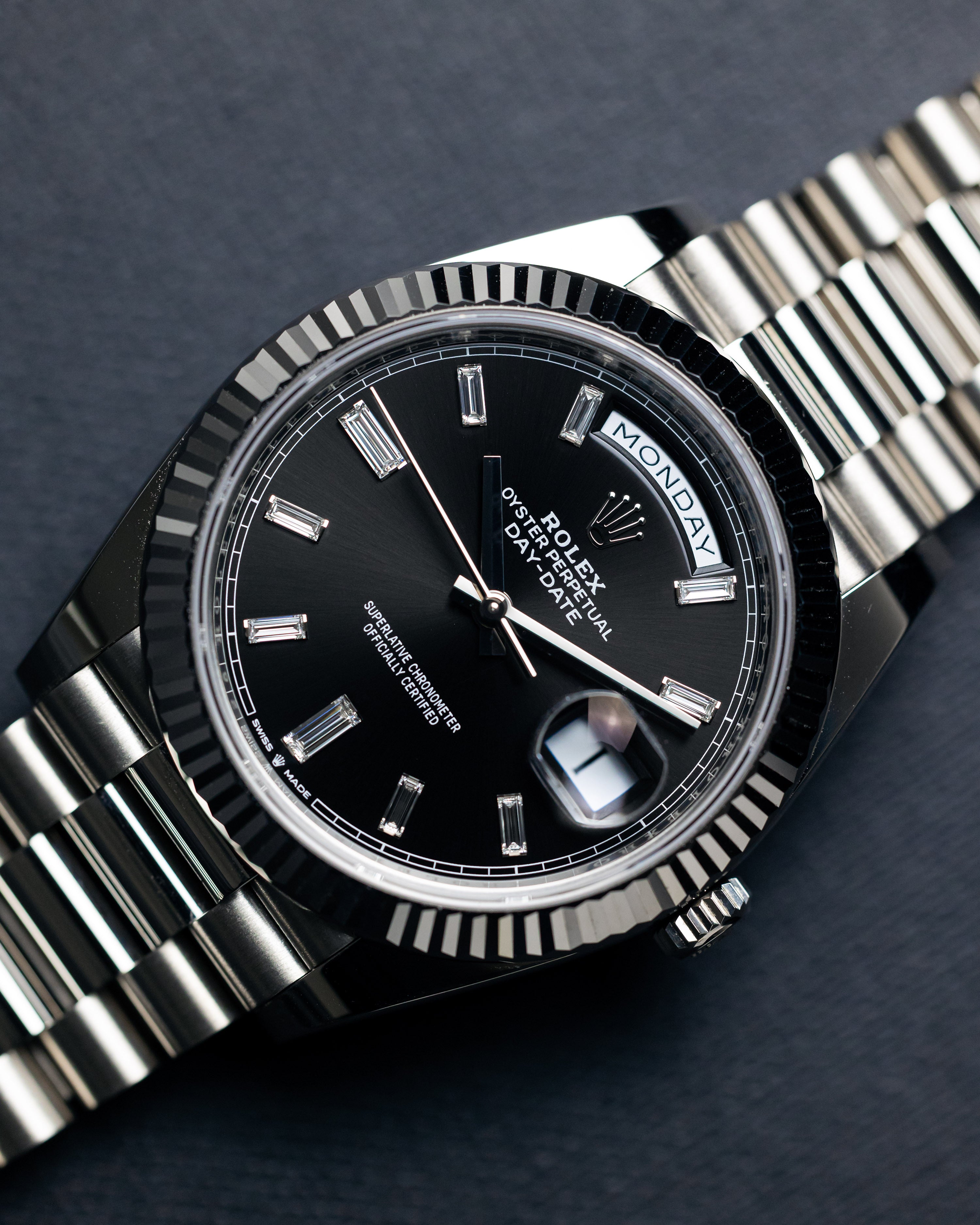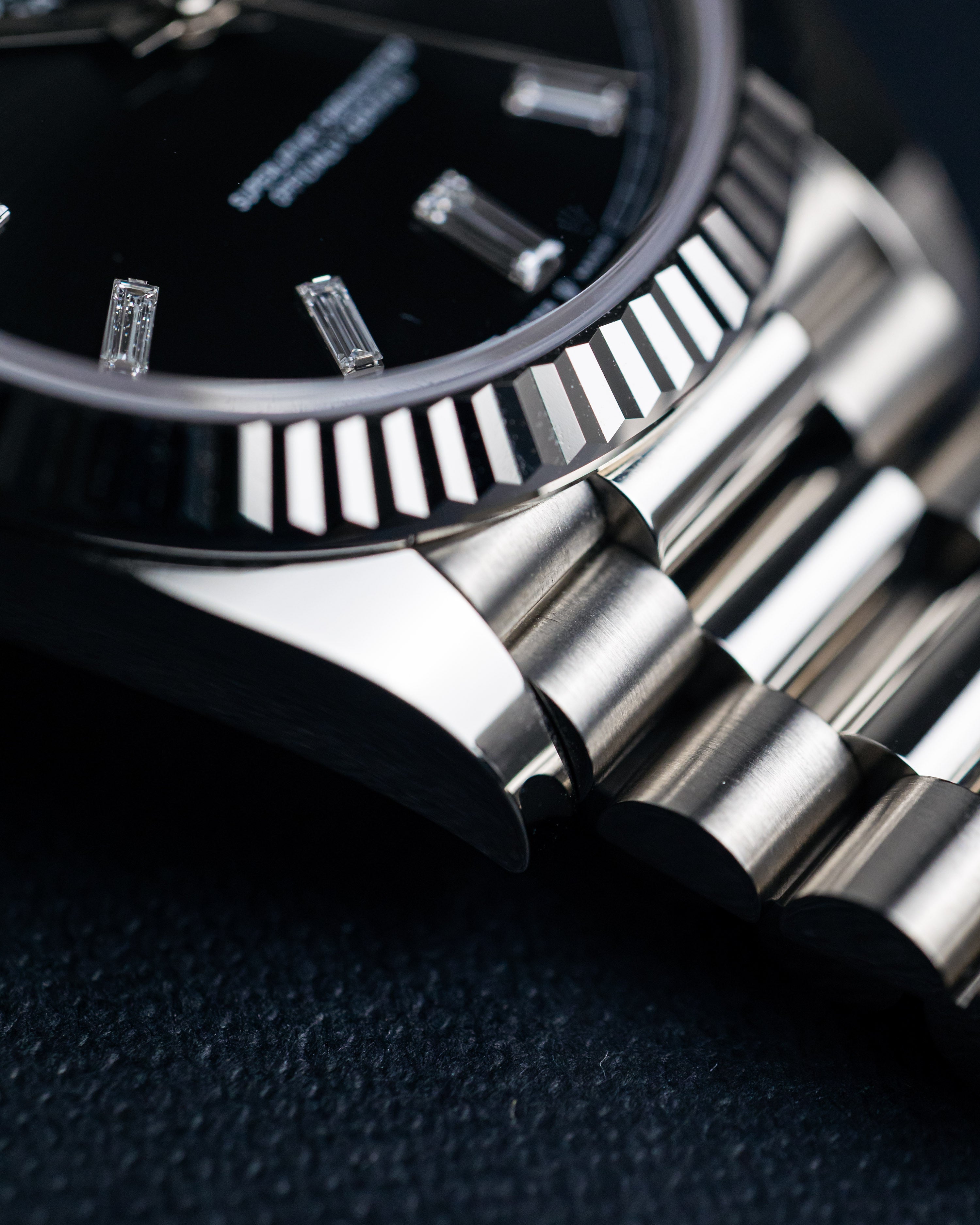 Featuring 10 baguette-cut diamond dial on the bright black dial, paired with the white gold president bracelet is a simple yet classic combination.