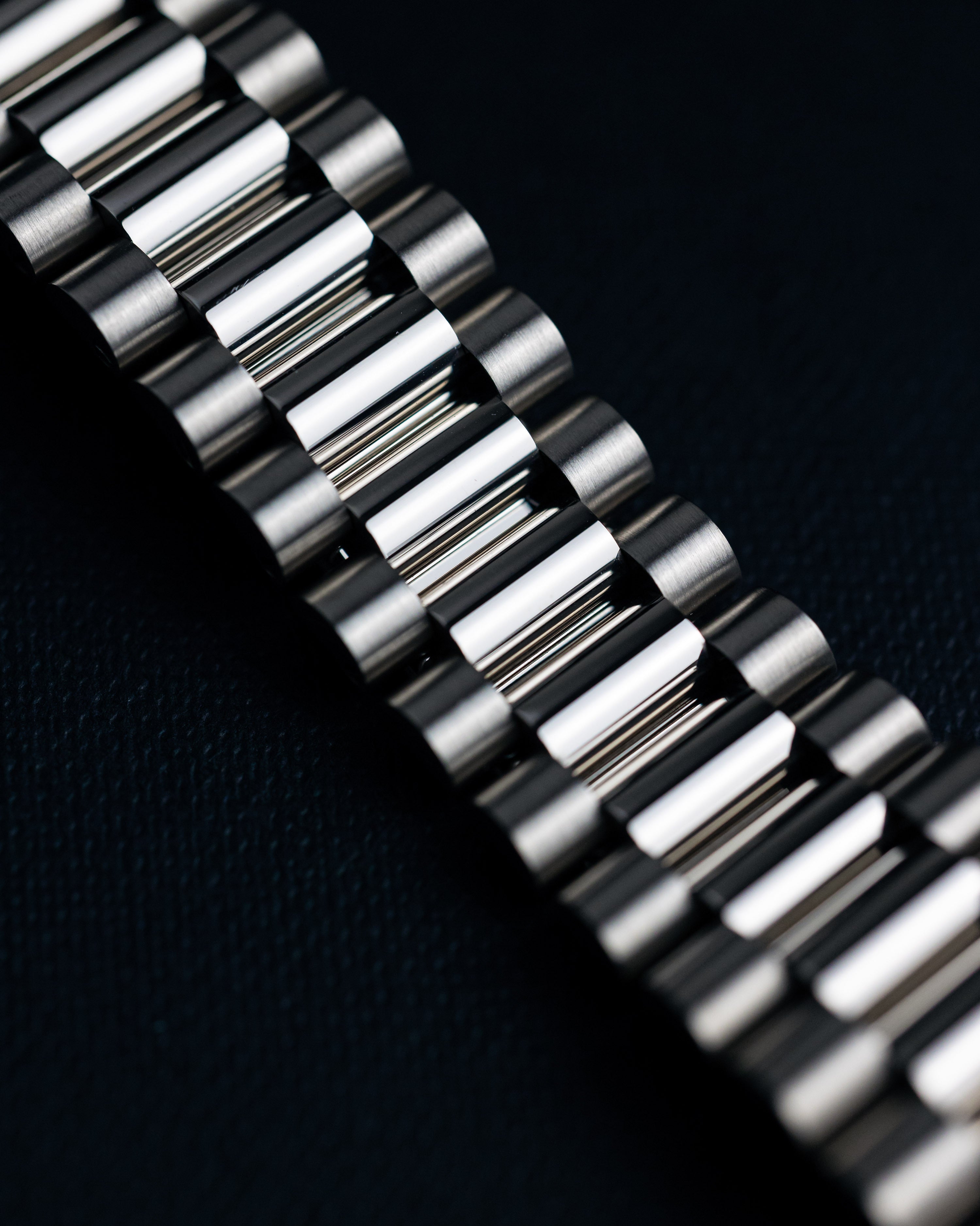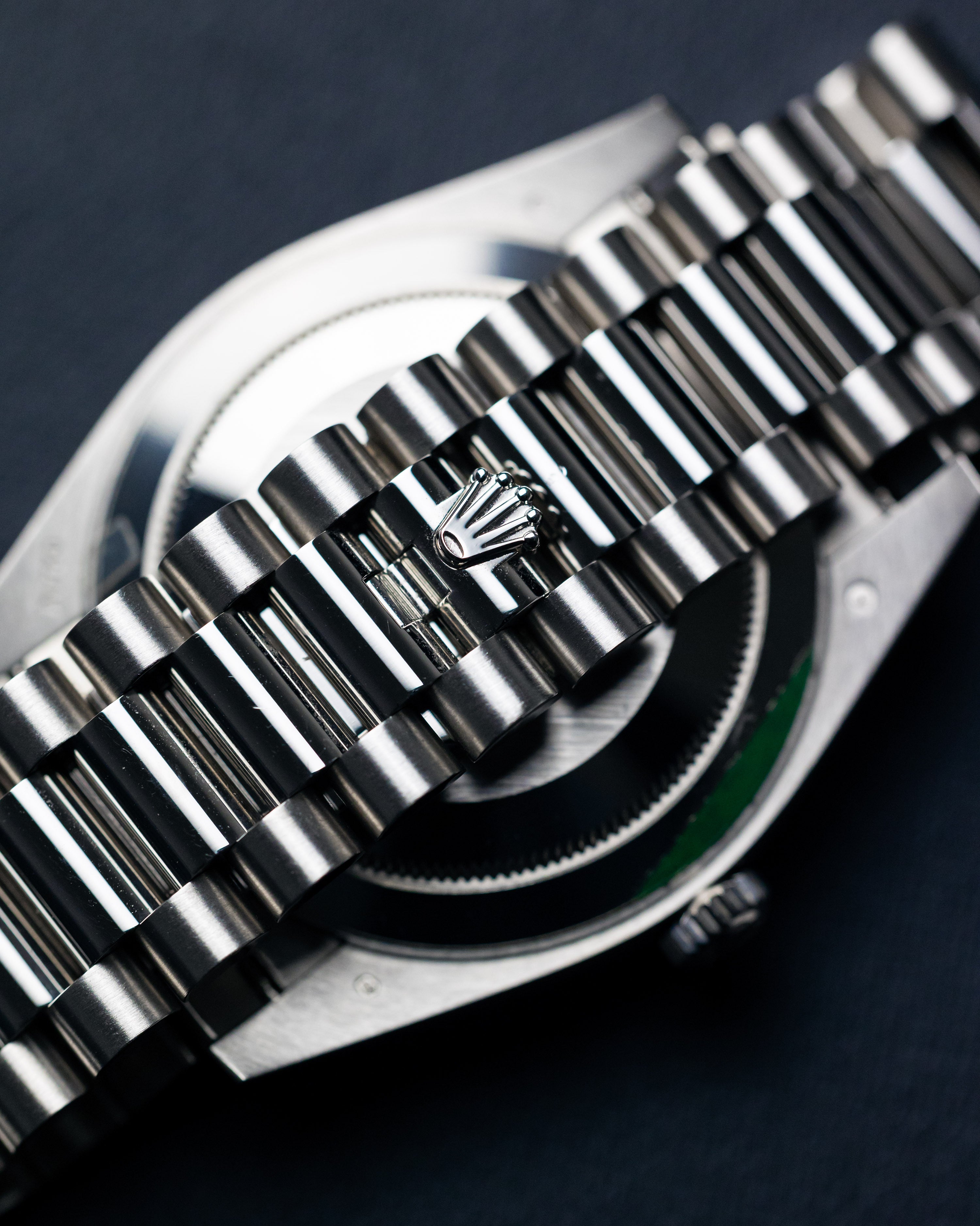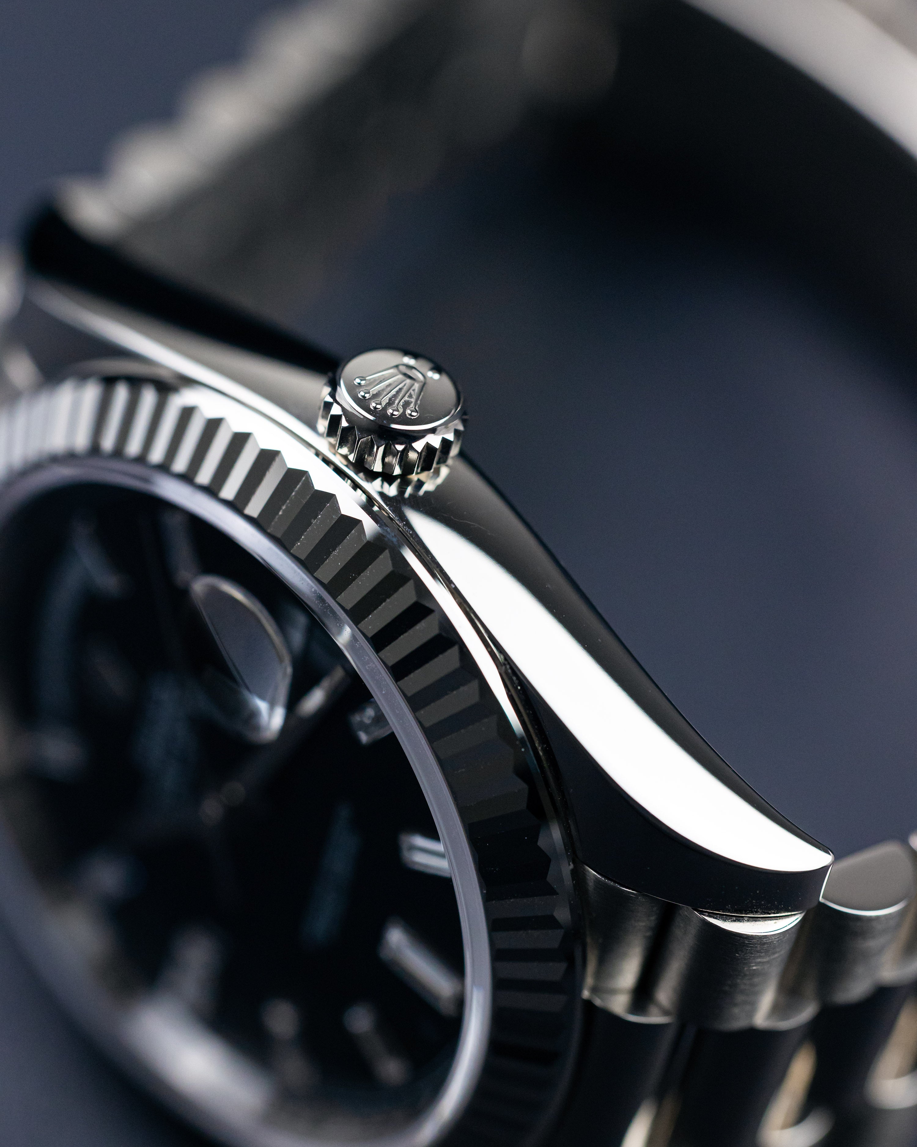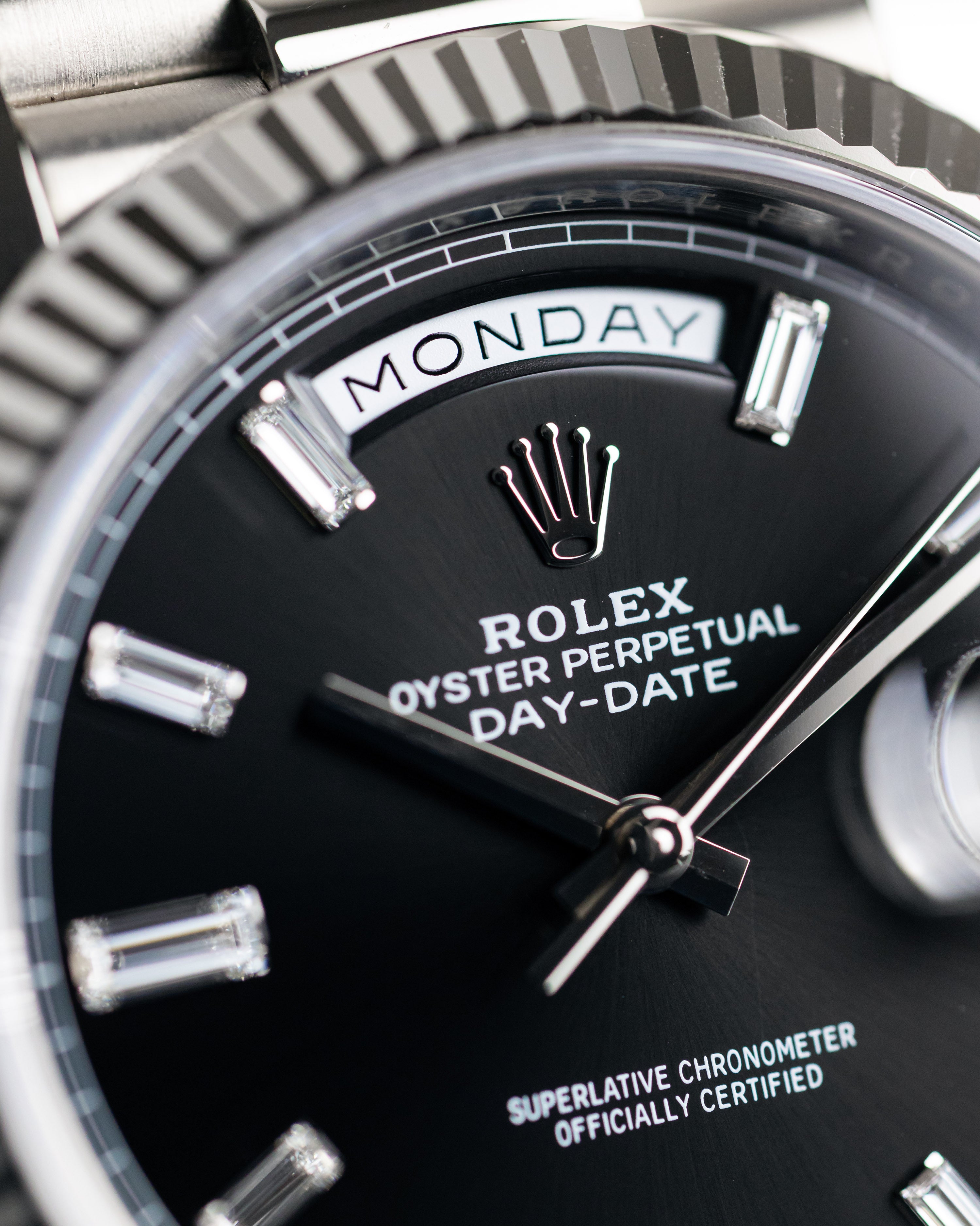 Featuring 10 baguette-cut diamond dial on the bright black dial, paired with the white gold president bracelet is a simple yet classic combination.