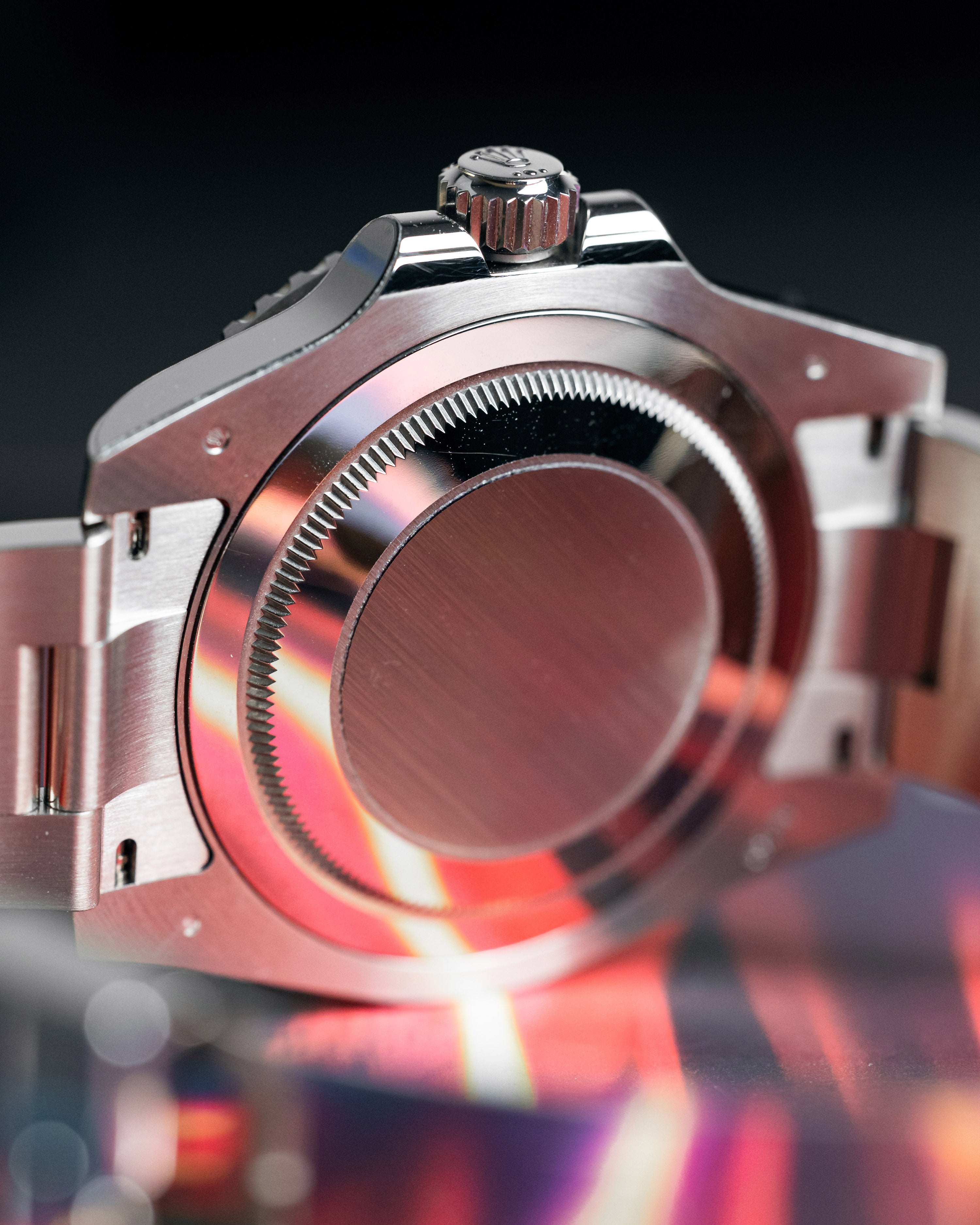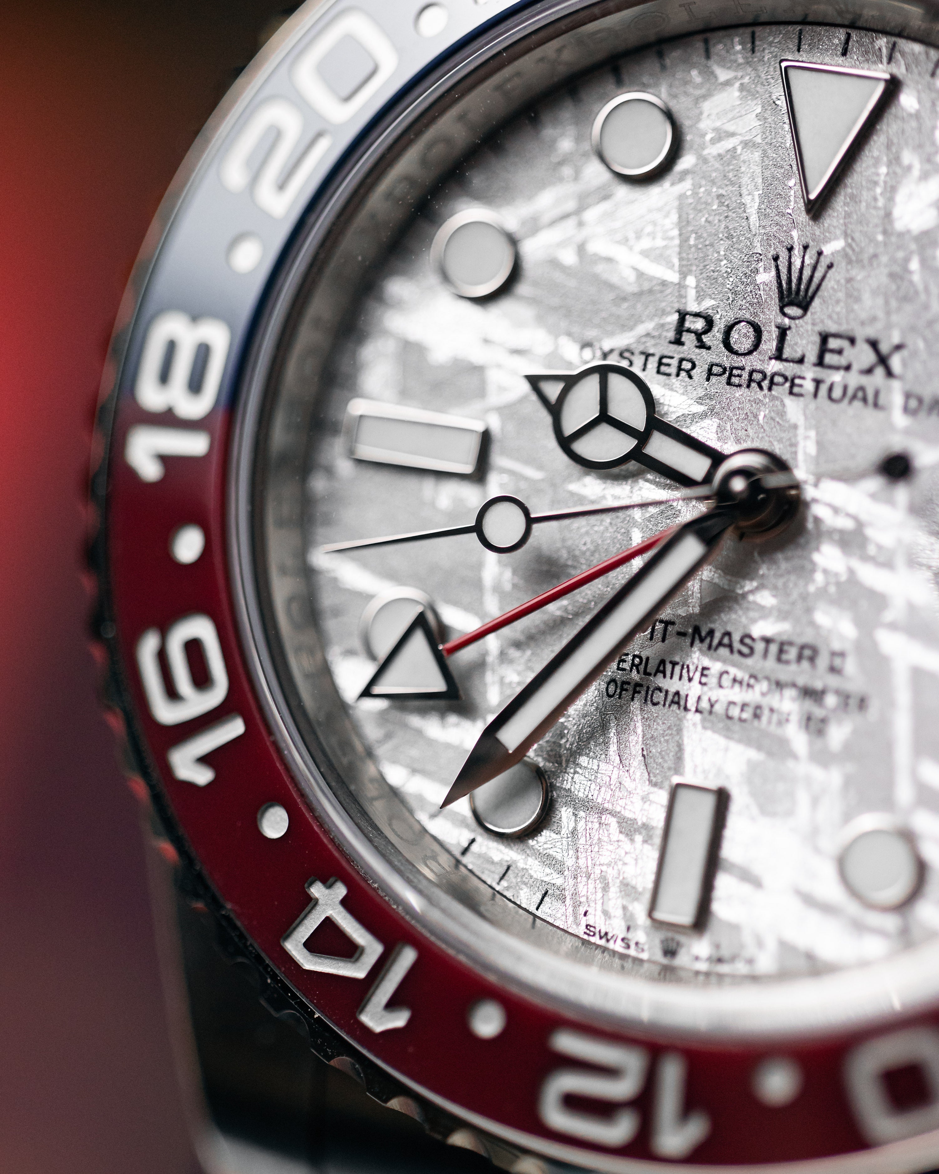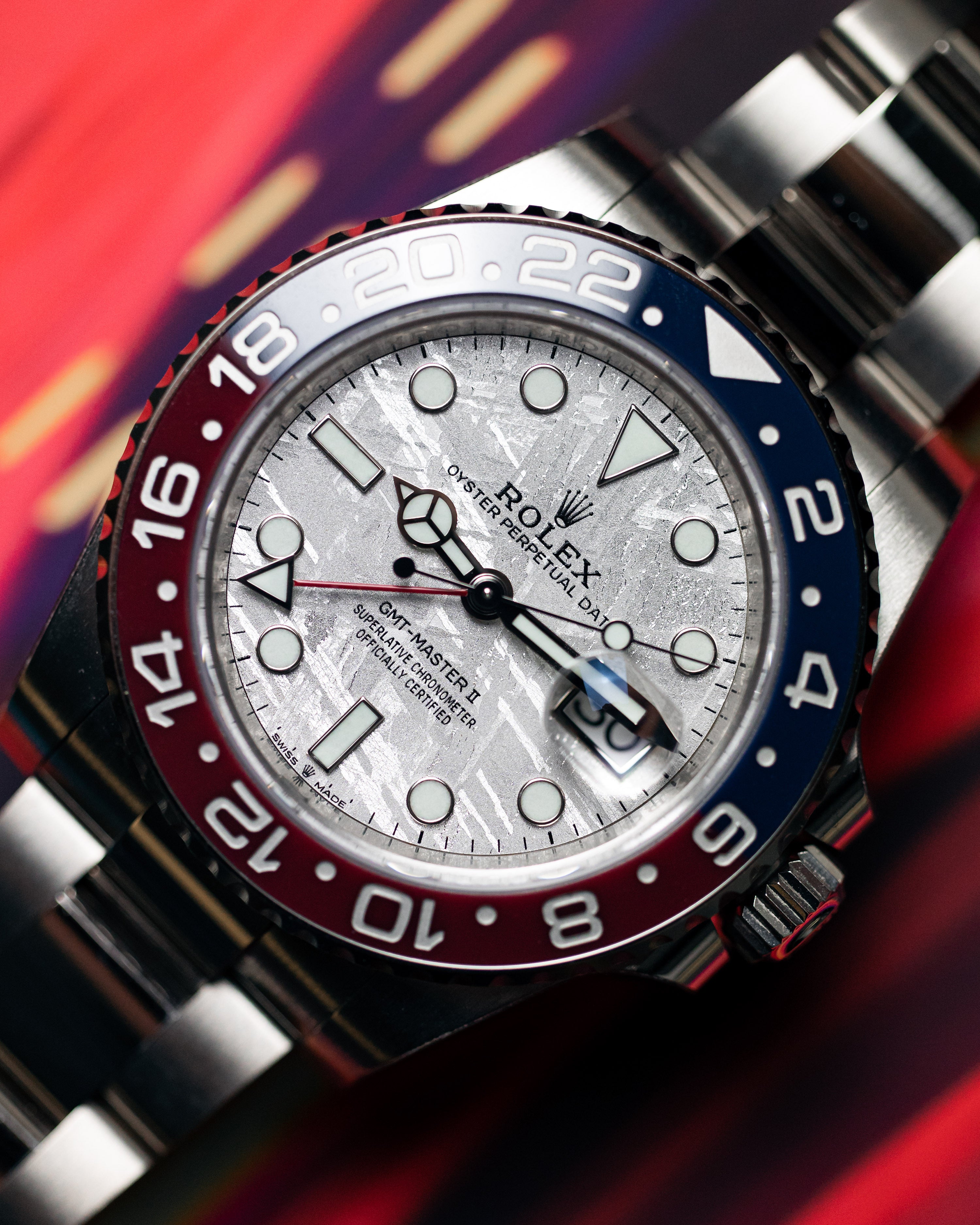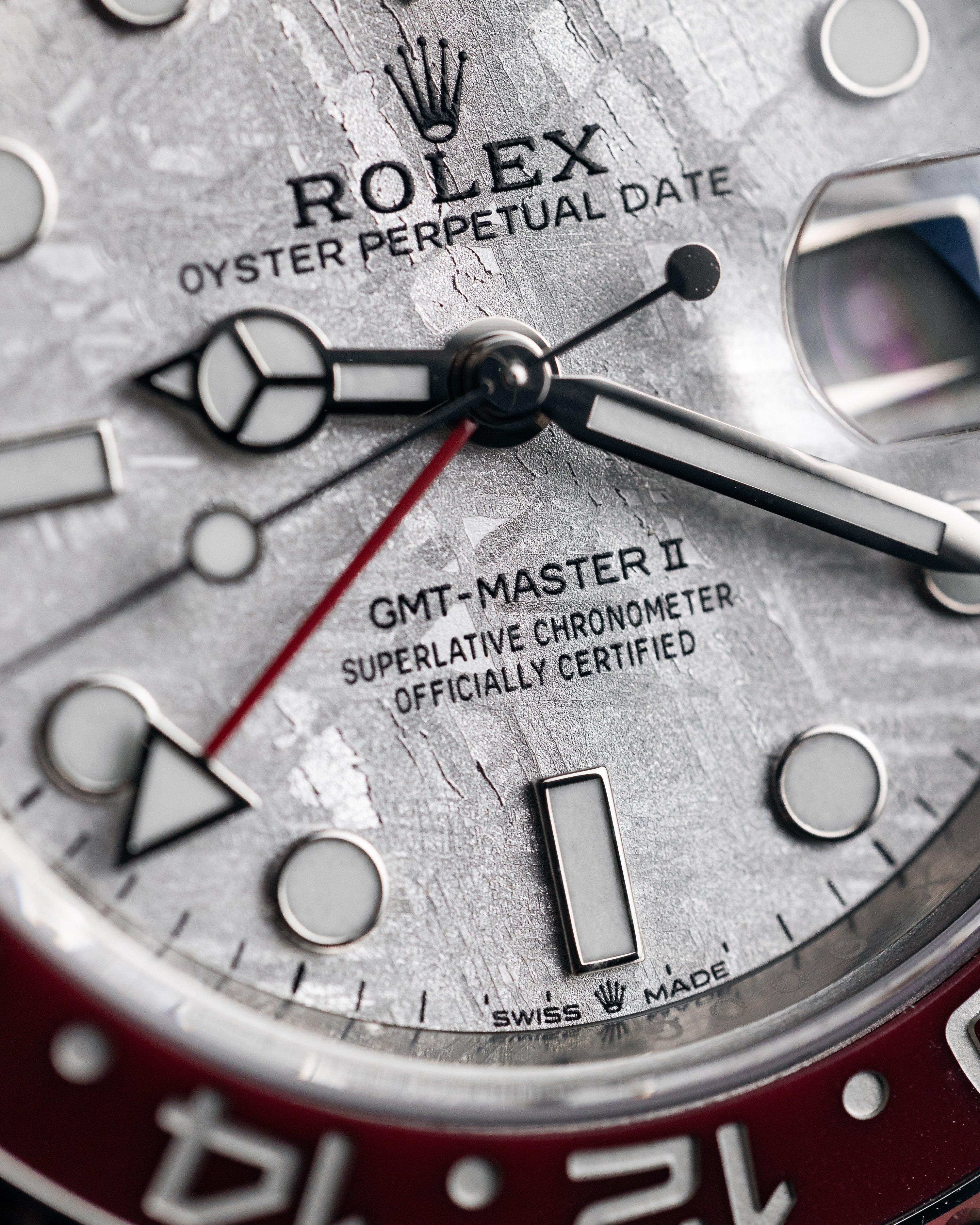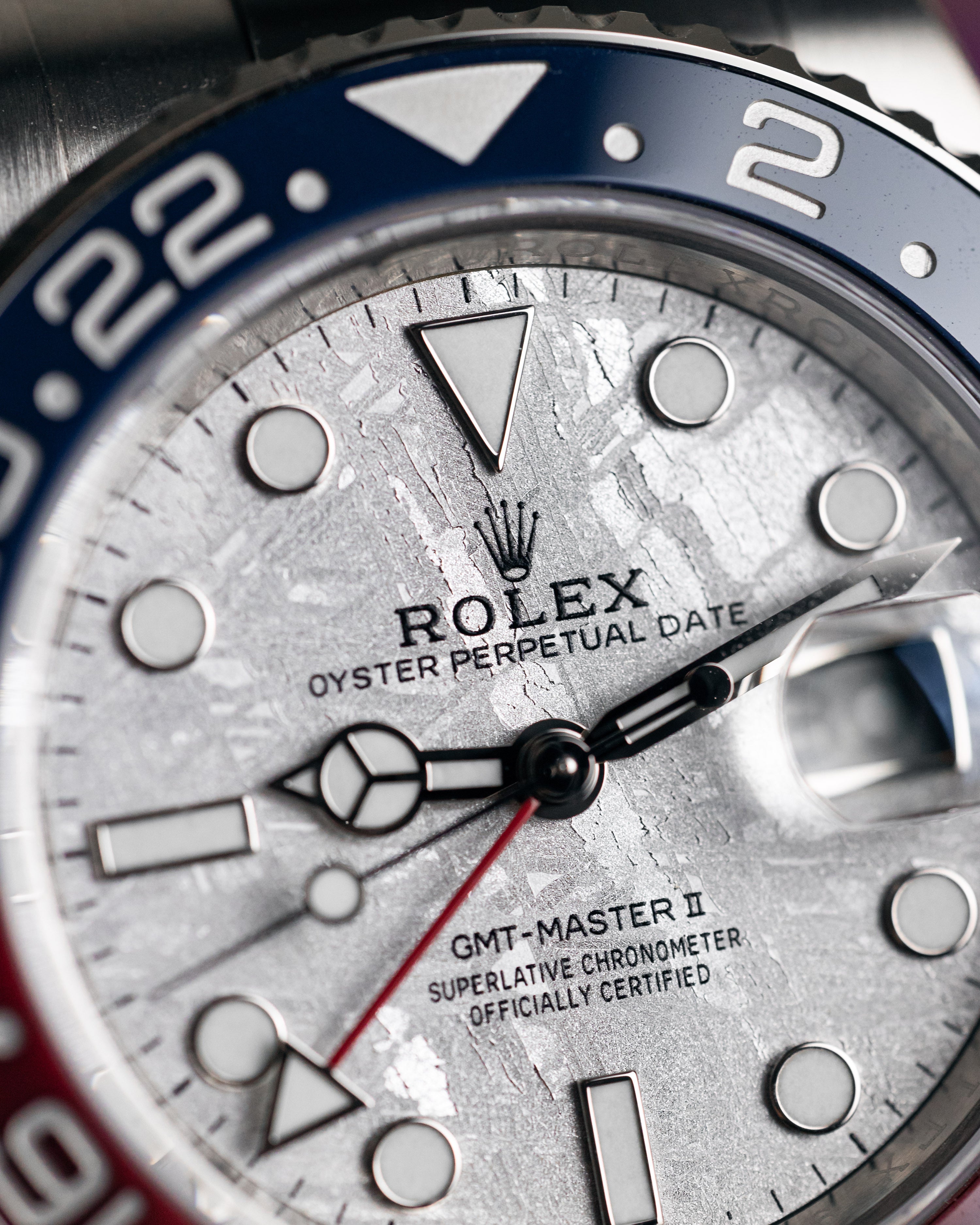 This model is the only GMT-Master II with a meteorite dial. Meteorite comes from the heart of an asteroid or possibly even a planet that has exploded, propelling material across the Solar System until chance brings it into our planet?s orbit and gravity pulls it to Earth. During its journey, the centre of the meteorite is gradually transformed, producing highly unusual metallic patterns, resulting from the very slow cooling of molten asteroid cores. The designers at Rolex create from these configurations a unique treasure for some of the most prestigious models, including this GMT-Master II.
