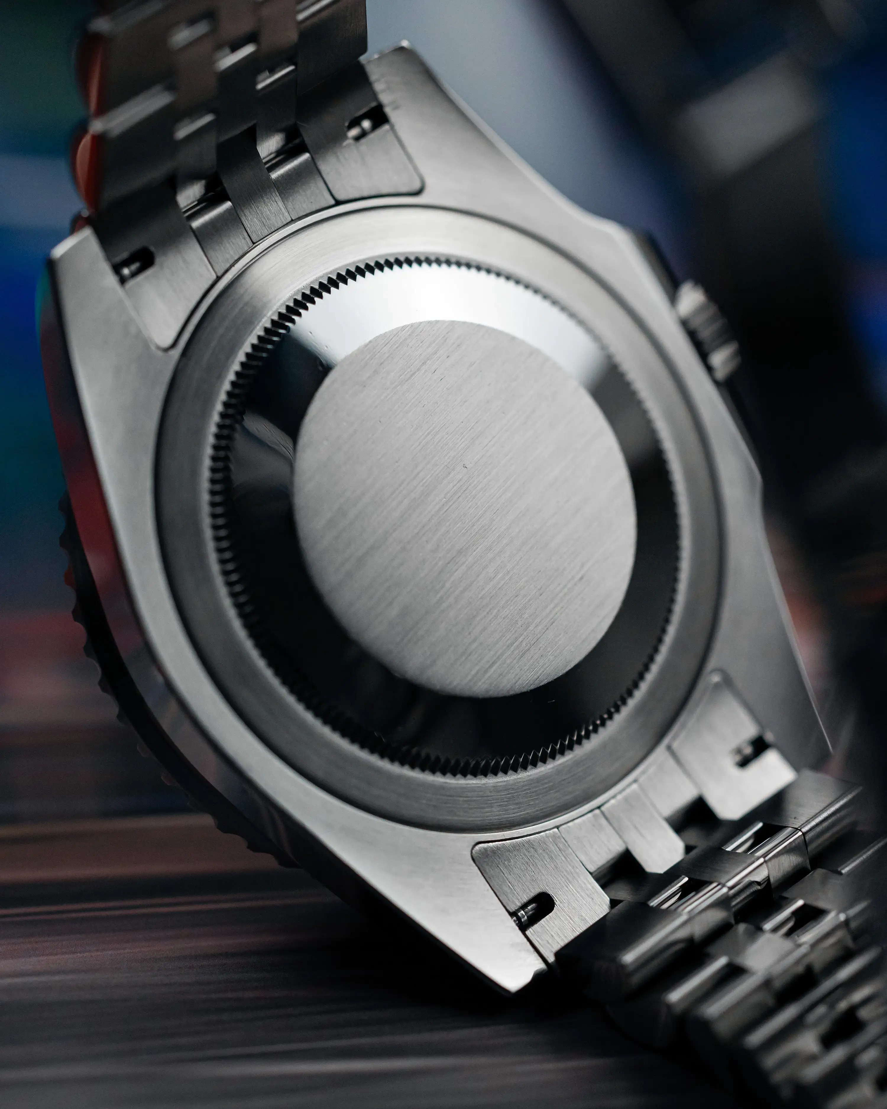 The Rolex GMT-Master II 126710 BLRO has a two-tone red-blue bezel, making the watch instantly recognizable. But the dual colors aren’t just a style element; they divide the bezel into two halves, one for daytime hours and the other for night. The bidirectional bezel is crafted from Rolex’s durable Cerachrom for fade- and scratch-resistance. The numerals are molded into the ceramic alloy and coated in a 1 micron of platinum using Physical Vapor Deposition.