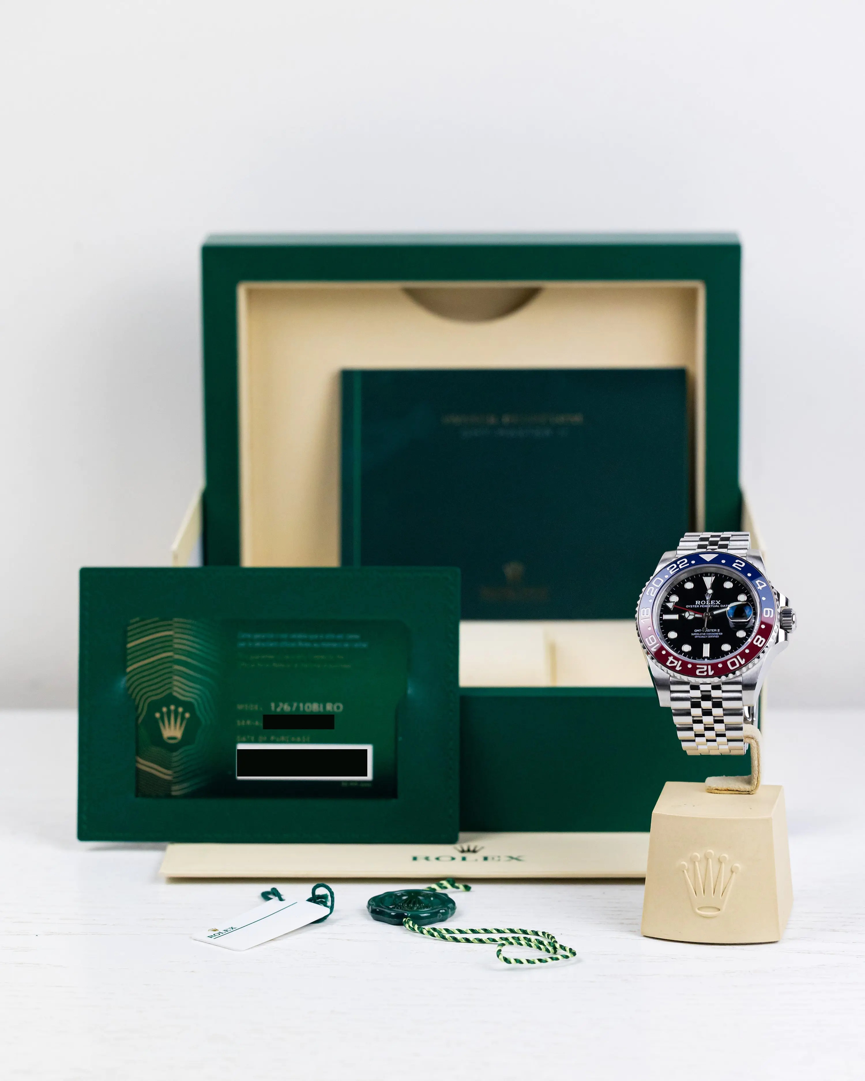 The Rolex GMT-Master II 126710 BLRO is equipped with a new-generation caliber 3285 self-winding movement, which operates at 28,800 (4Hz) vibrations per hour, providing a 70-hour power reserve. It is fitted with a Paraflex anti-shock system and a Paramagnetic Blue Parachrom hairspring for 10 times the timekeeping accuracy of standard watch hairsprings.