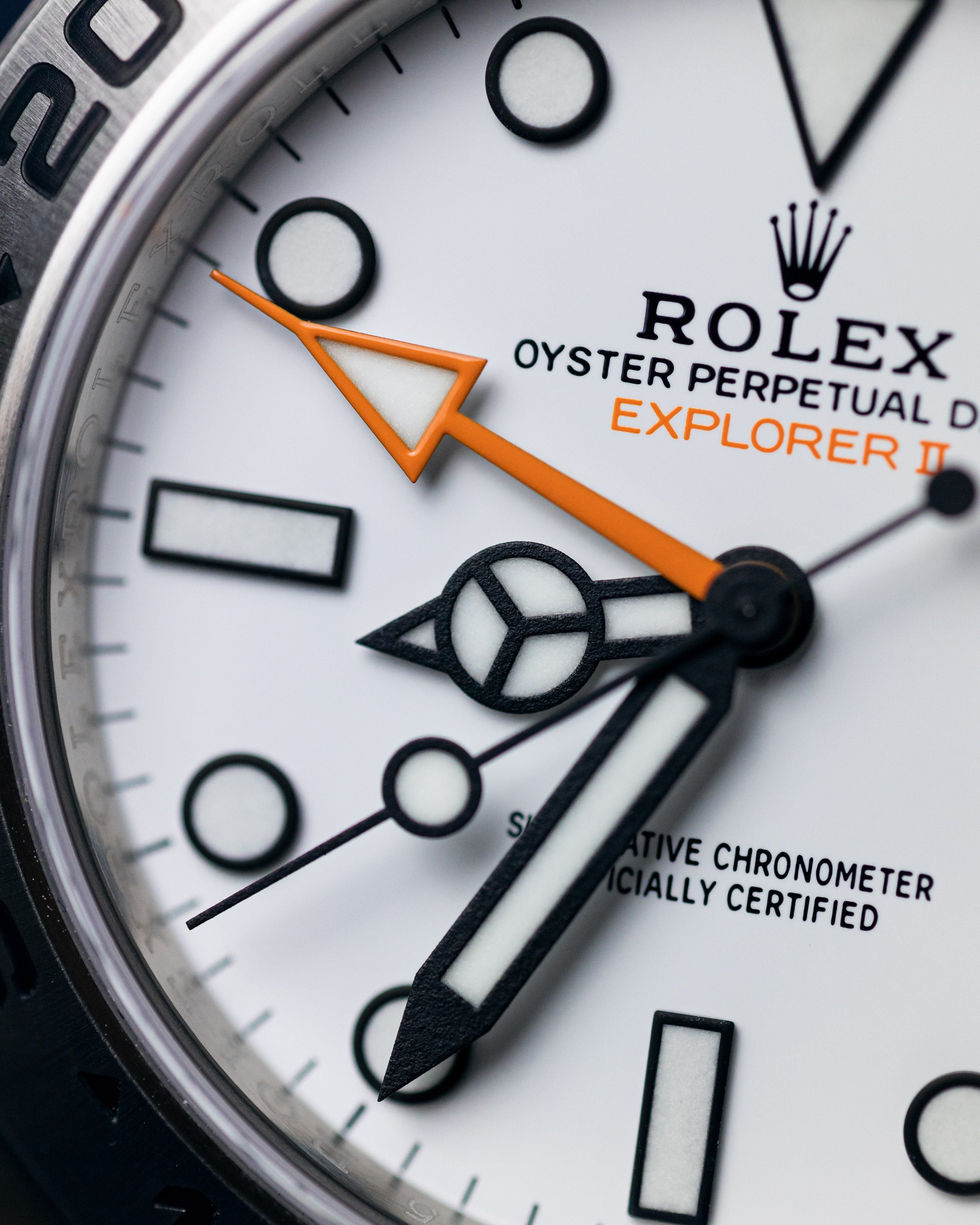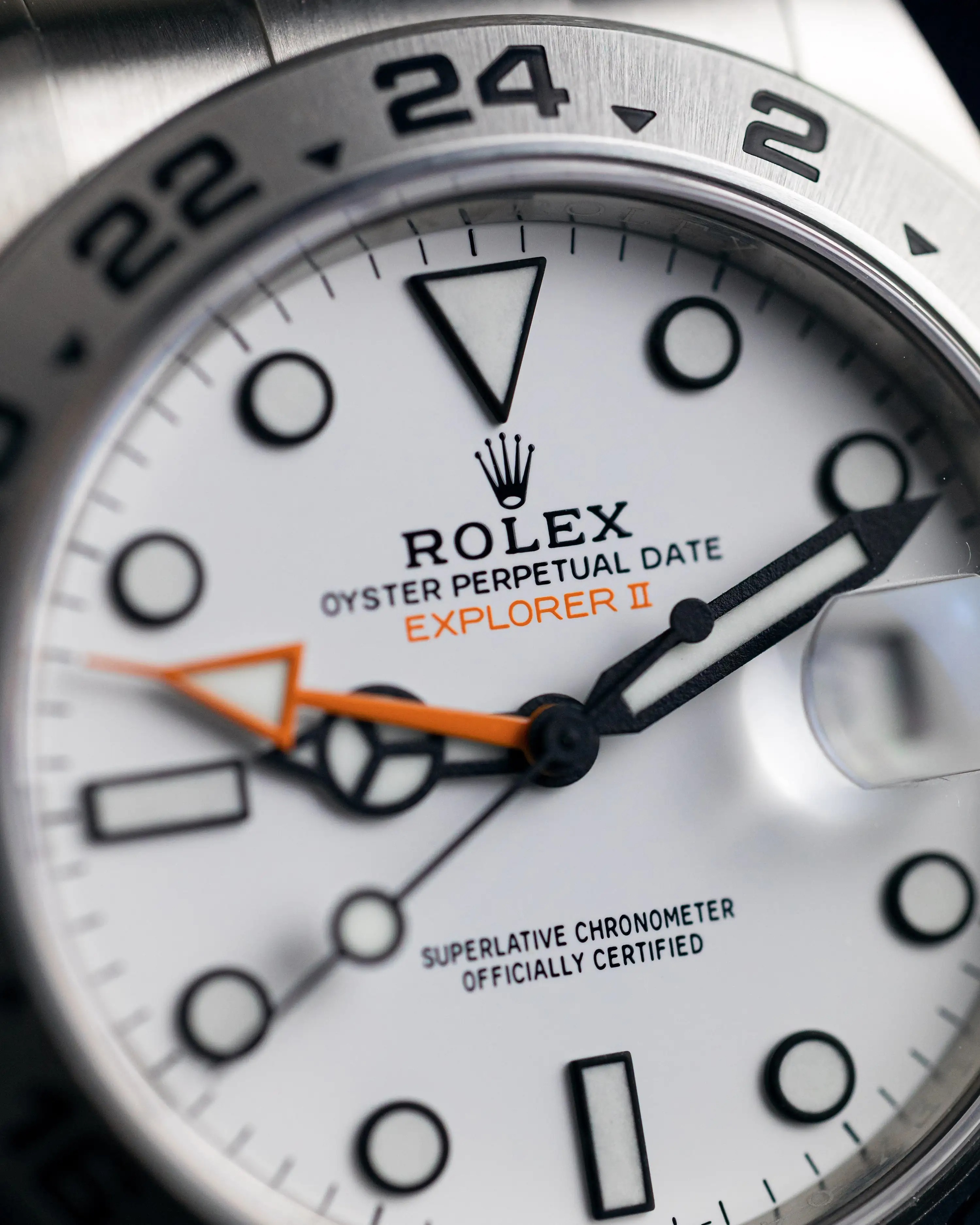 The Explorer II features a date display, an additional orange 24-hour hand and a fixed bezel with 24-hour graduations, enabling day to be distinguished from night. It became the watch of choice for speleologists, volcanologists and polar explorers. Its hour markers and hands feature a highly-legible Chromalight display with long-lasting blue luminescence.