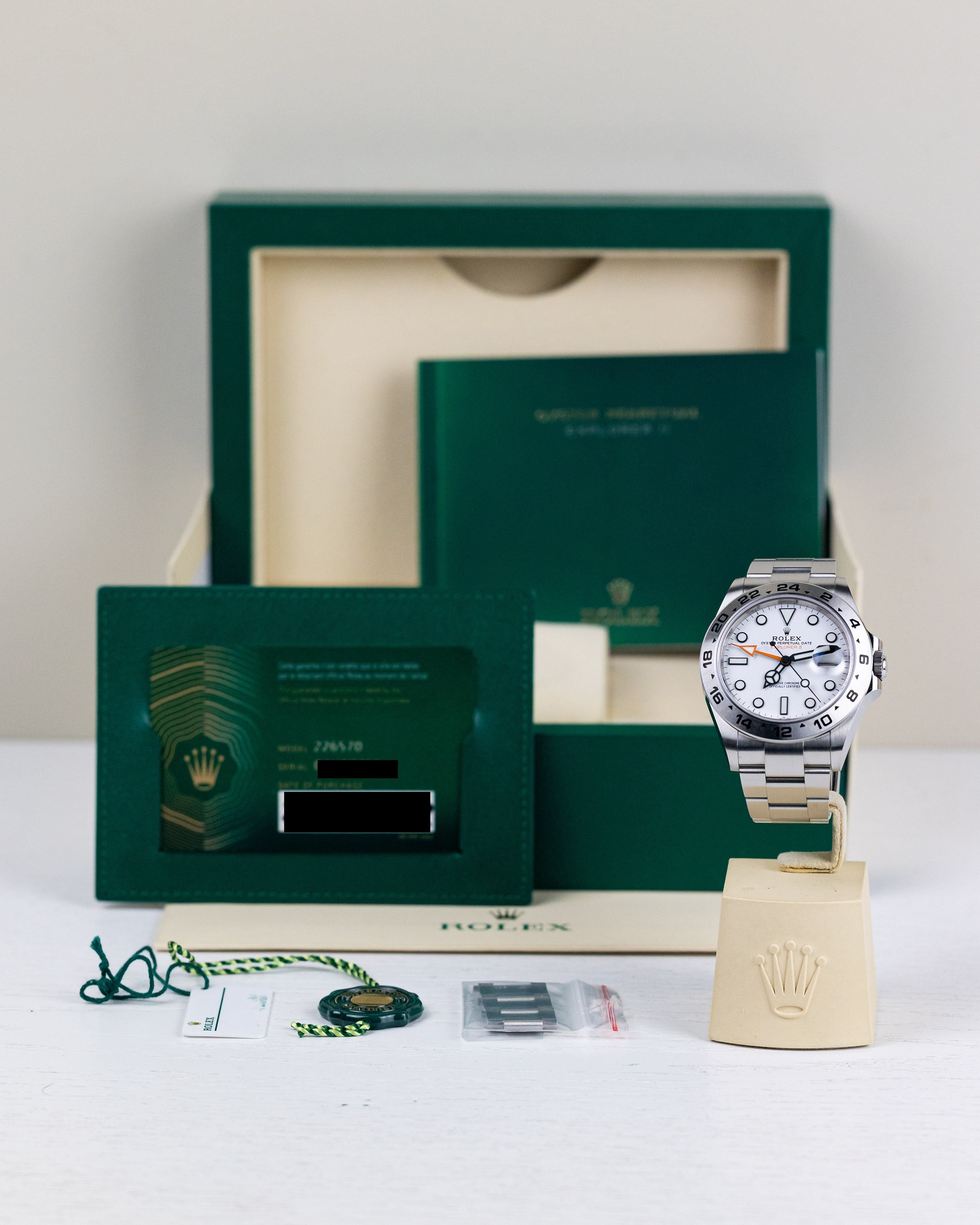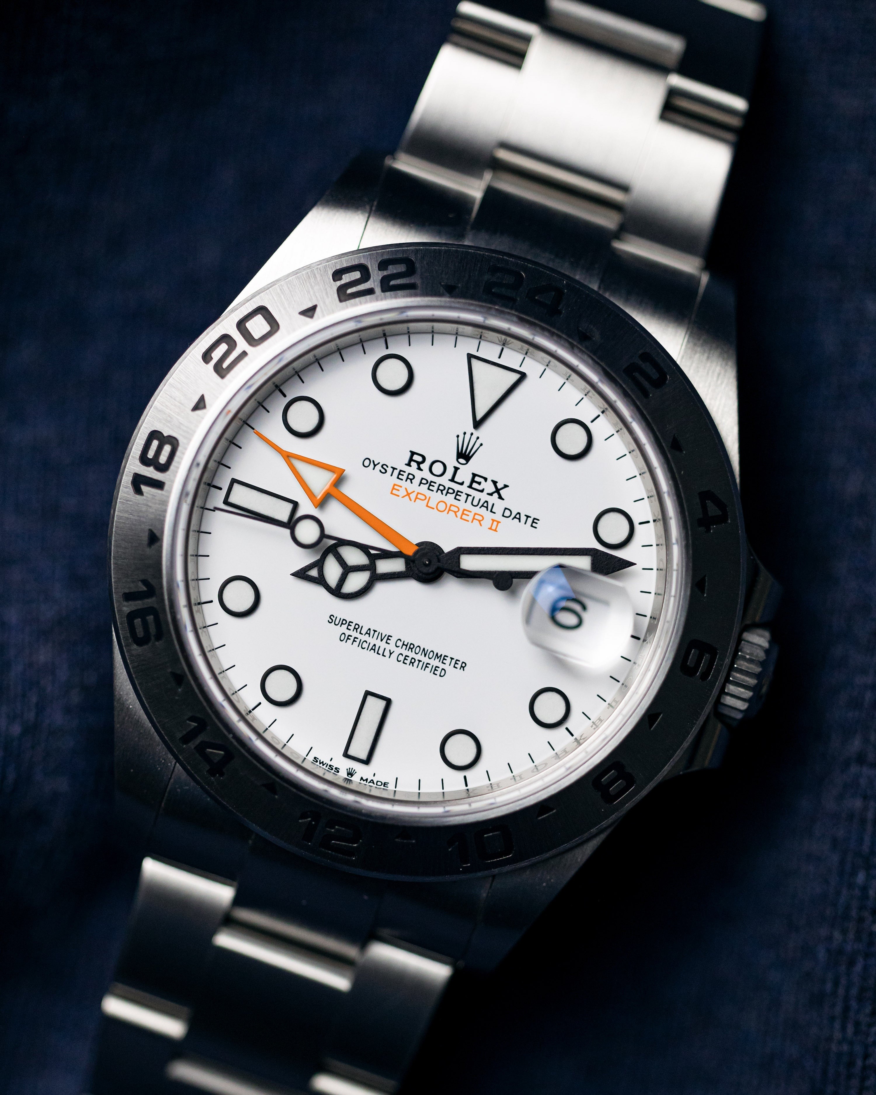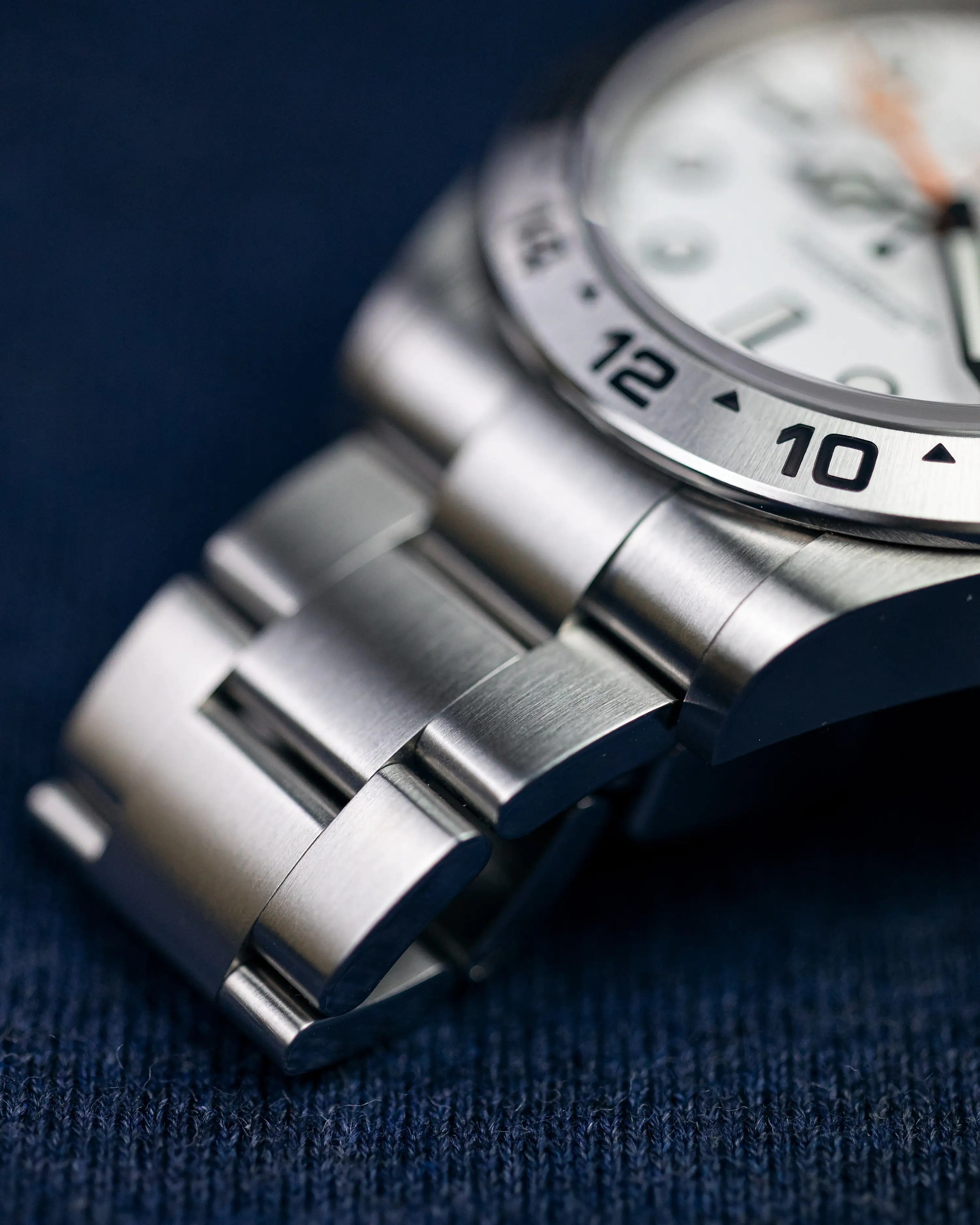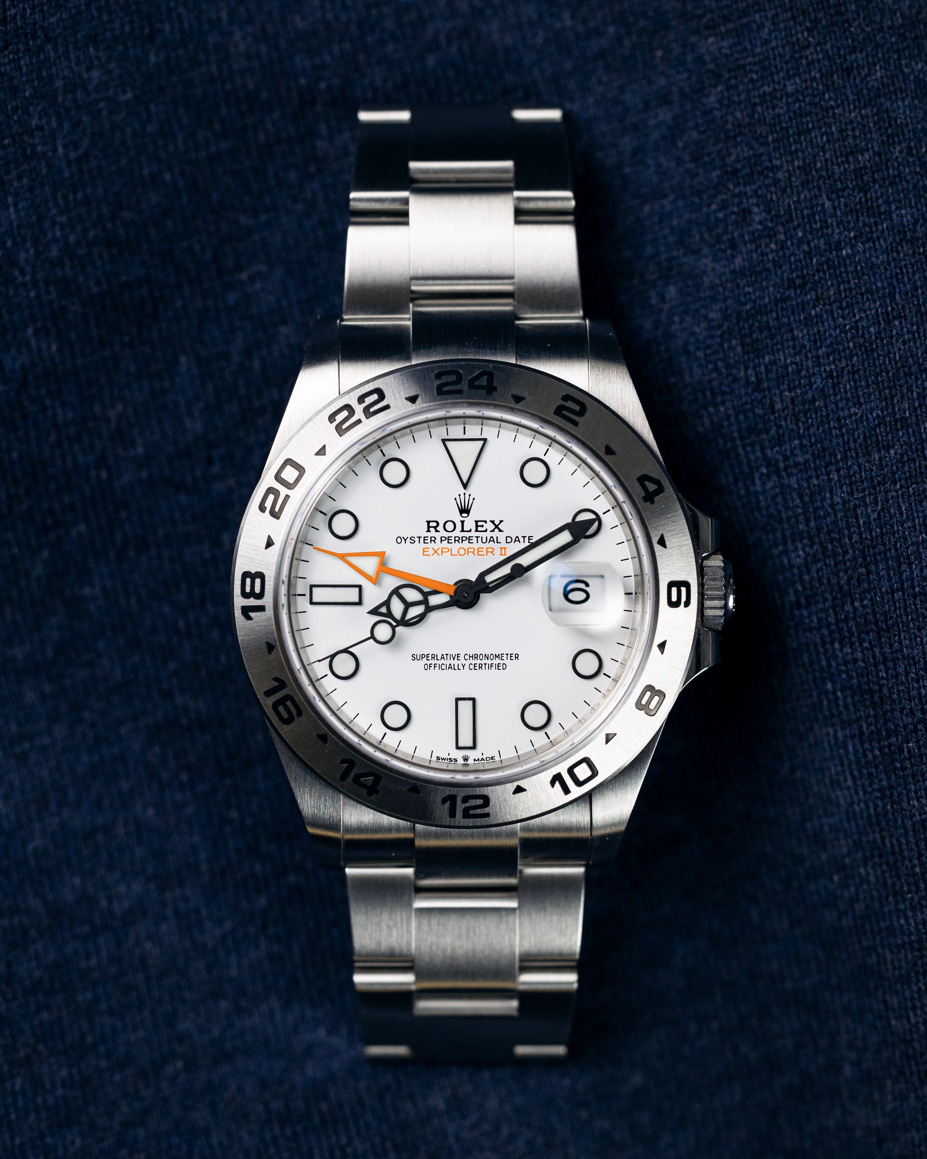 This Oyster Perpetual Explorer II in Oystersteel with an Oyster bracelet features a white dial with an arrow-shaped 24-hour hand and hour markers with a Chromalight display.