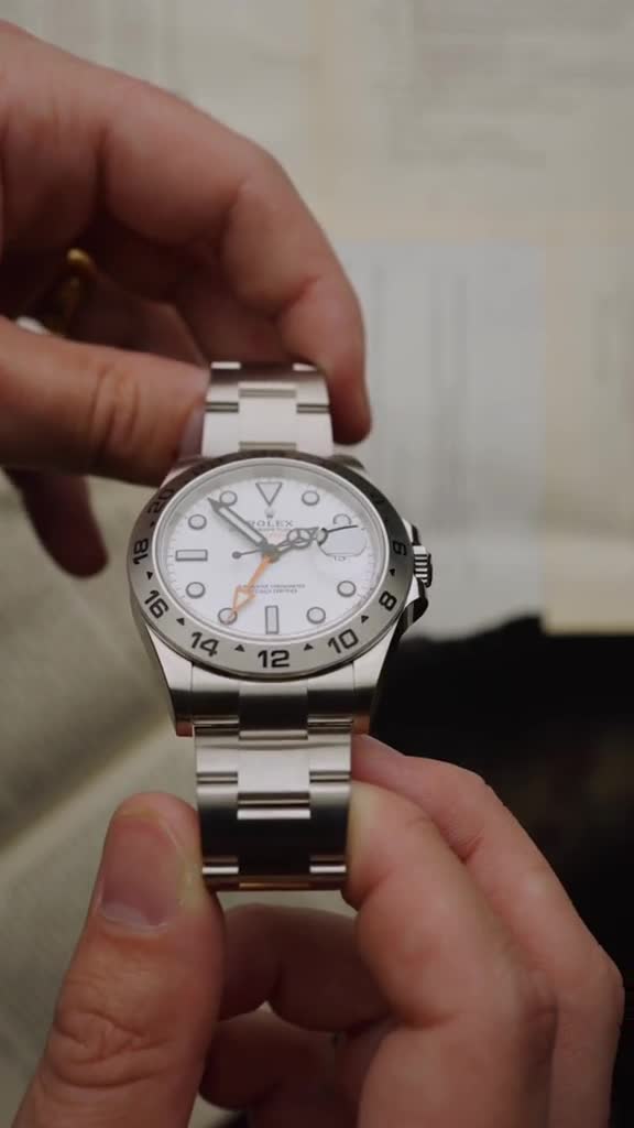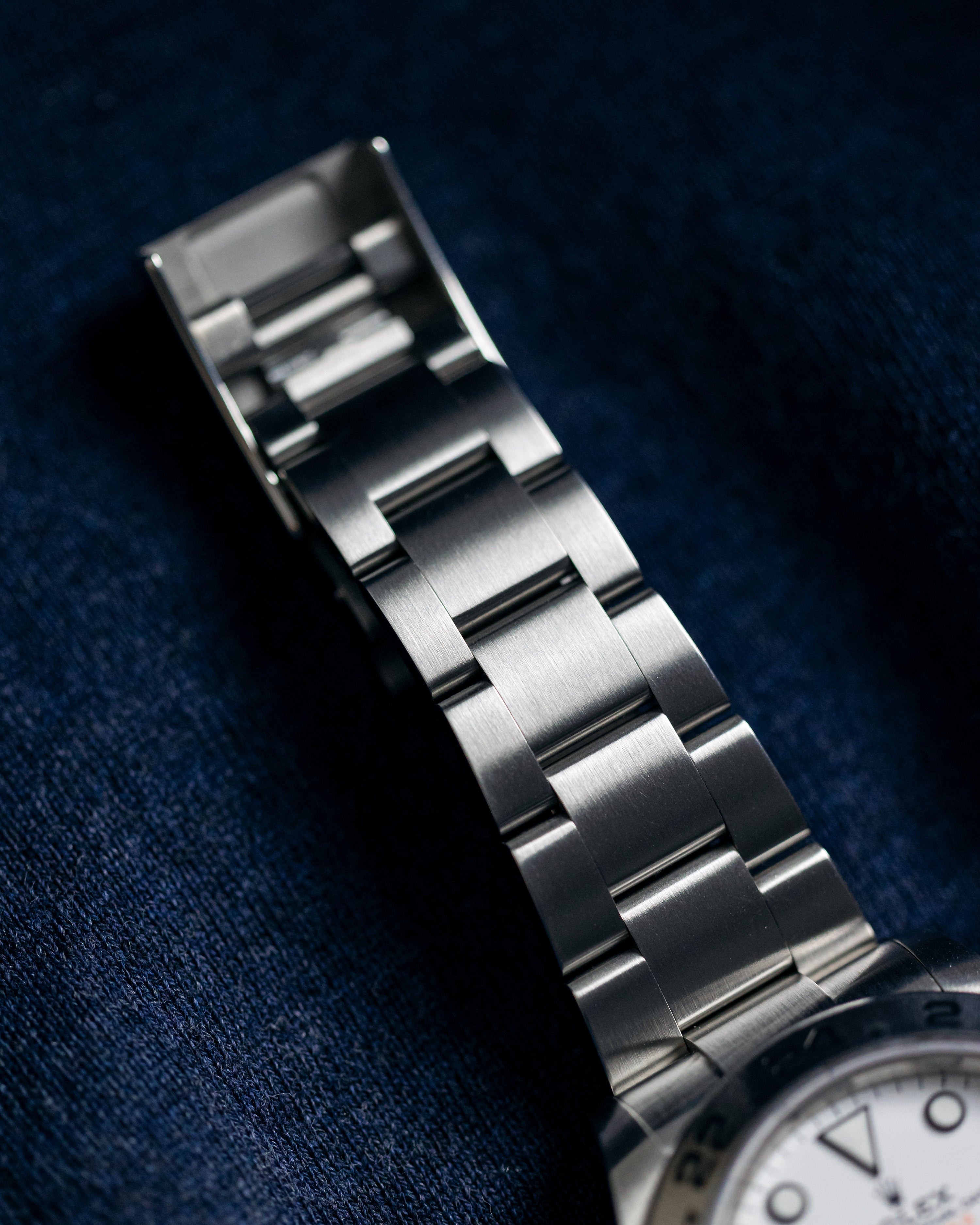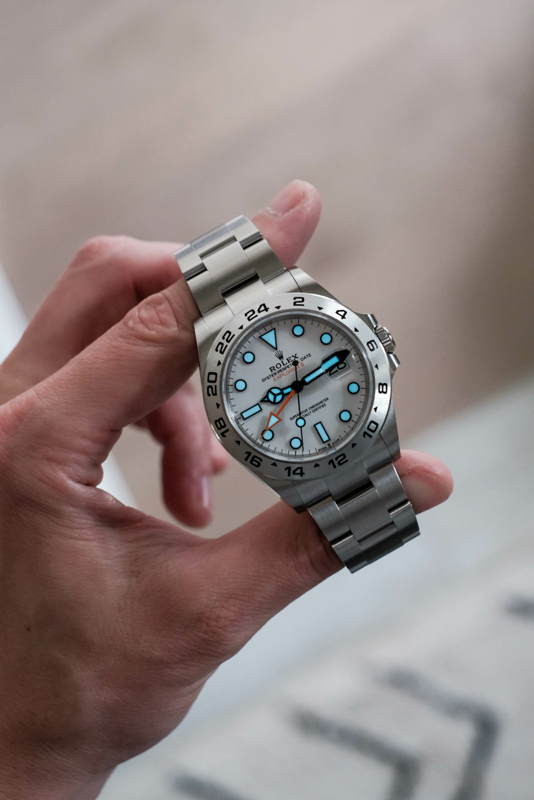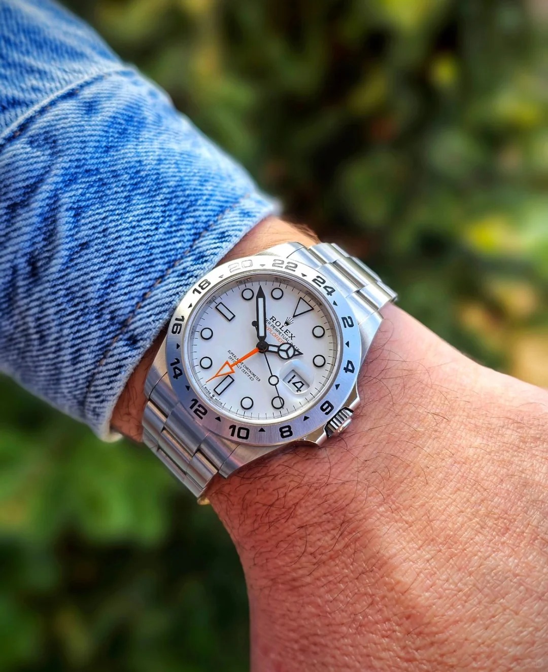 The Explorer II is equipped with an additional 24-hour display; a dedicated hand circles the dial in 24 hours rather than the usual 12, pointing to a fixed bezel with 24 hour graduations.