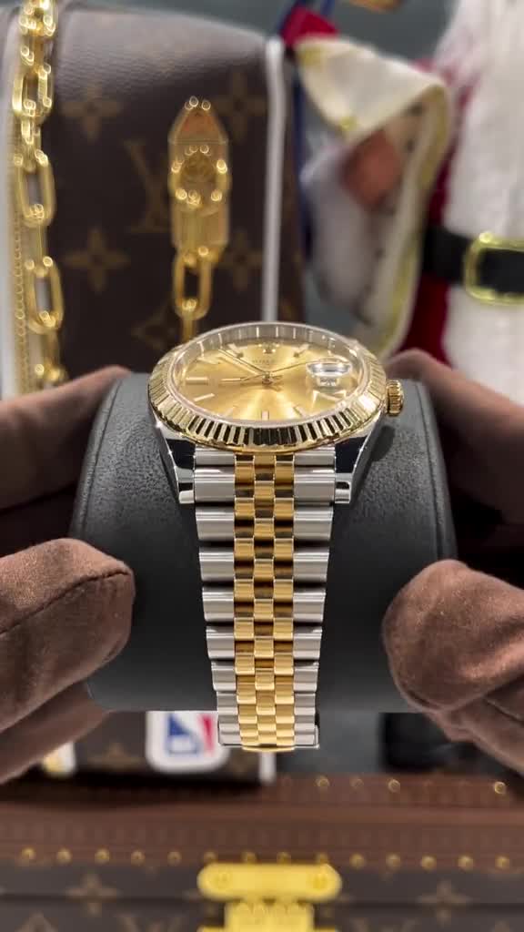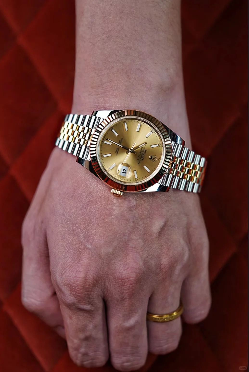 41mm Yellow Rolesor case with 904L steel monobloc middle case, screw-down steel back, 18K yellow gold screw-down crown, 18K yellow gold fluted bezel, scratch-resistant double anti-reflective sapphire crystal with cyclops lens over the date, champagne dial, index hour markers, Rolex caliber 3235 perpetual self-winding movement with date at 3 o'clock that changes instantaneously at midnight in a few thousandths of a second, approximately 70 hours of power reserve, yellow Rolesor Jubilee bracelet made from a combination of 904L steel and 18K yellow gold with five-piece links, folding Oysterclasp buckle with Easylink 5mm comfort extension link. Waterproof to 100 meters.