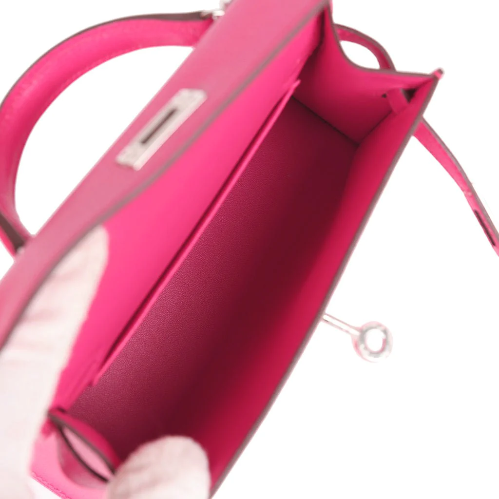 This tinyKelly is in Rose Extreme Chevre Chamkila with palladium hardware and has tonal stitching, front toggle closure, single rolled handle, removable strap.
