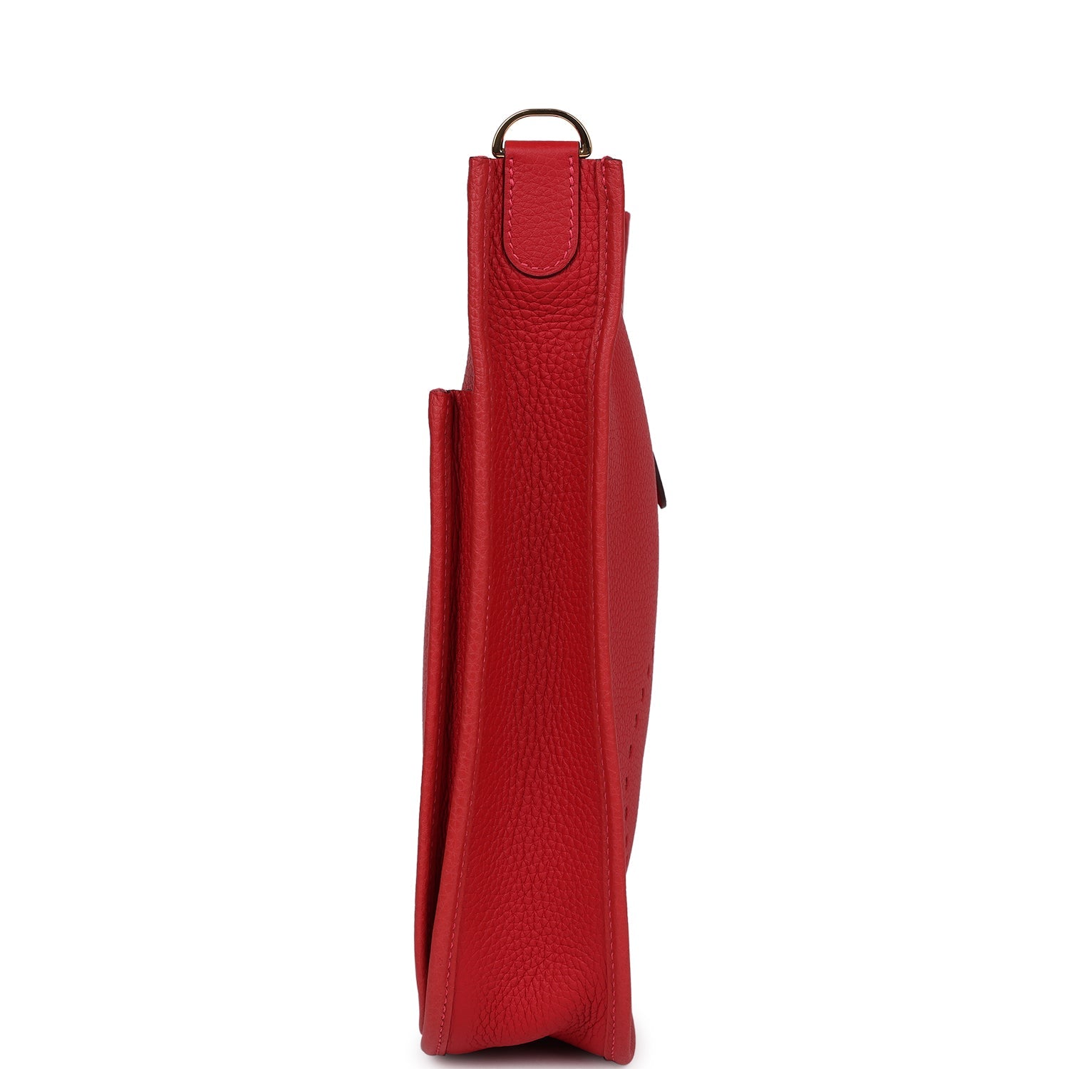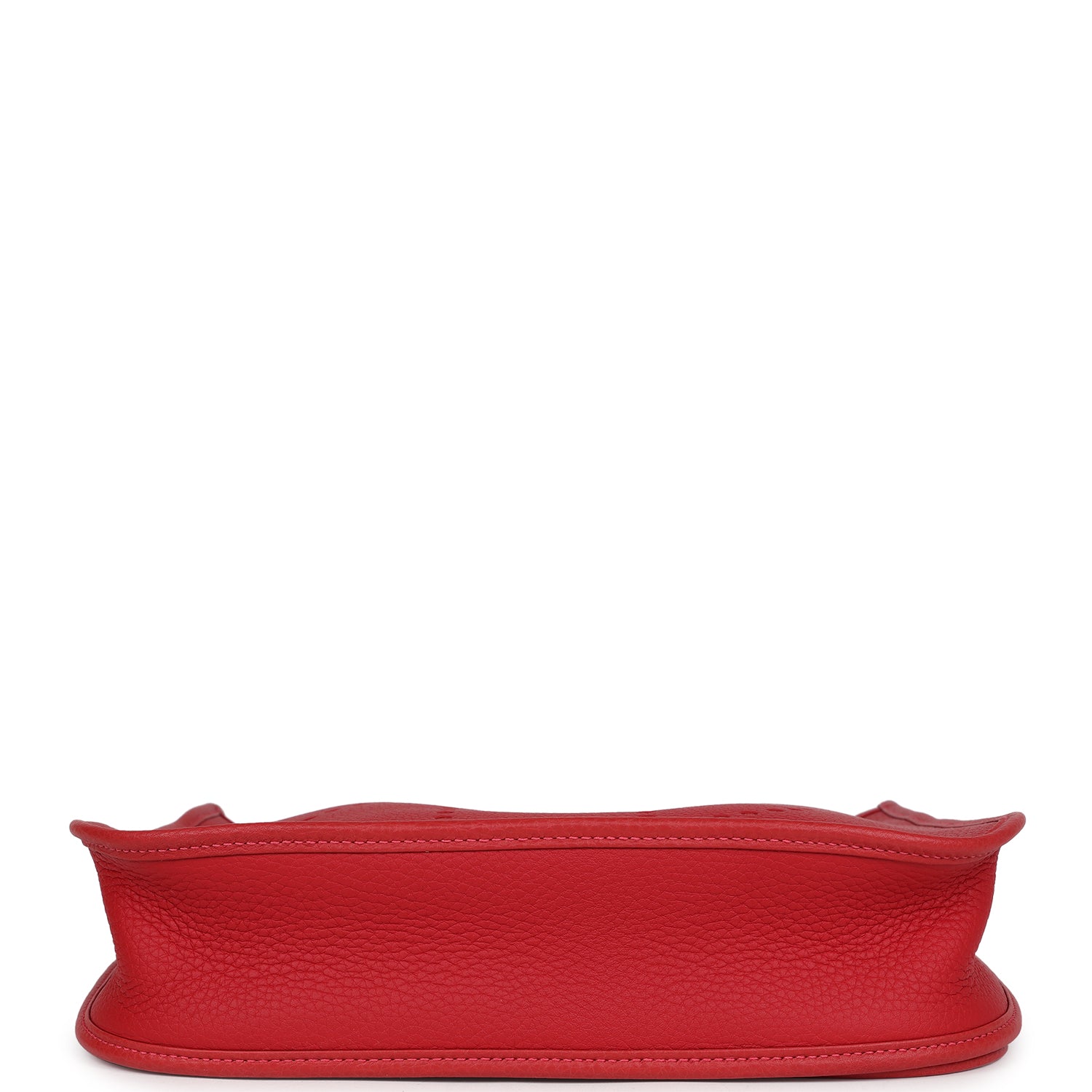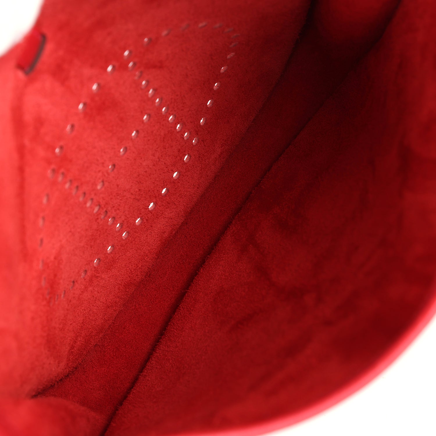 This Evelyne PM is in Vermillon clemence leather with gold hardware, has tonal stitching, pull tab top closure, and Vermillon removable canvas and leather shoulder/crossbody strap.