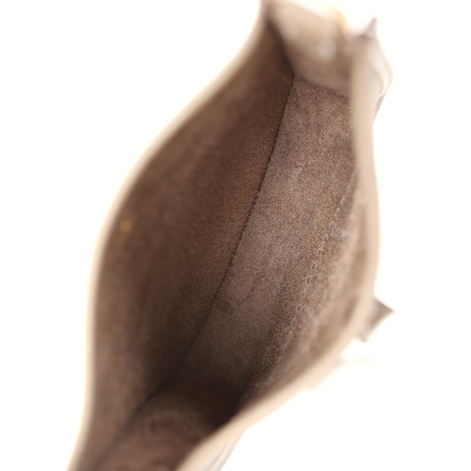 This Evelyne TPM is in Etoupe clemence leather with gold hardware and has contrast stitching, pull tab top closure and a removable canvas and leather shoulder/crossbody strap.