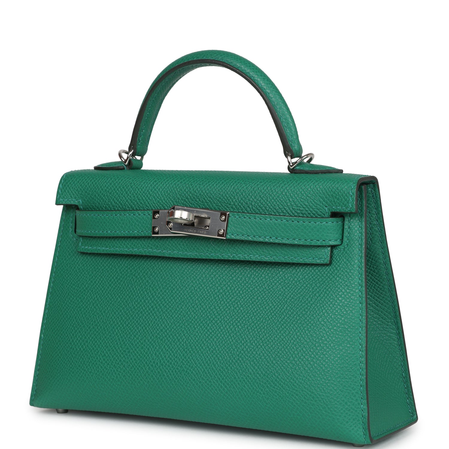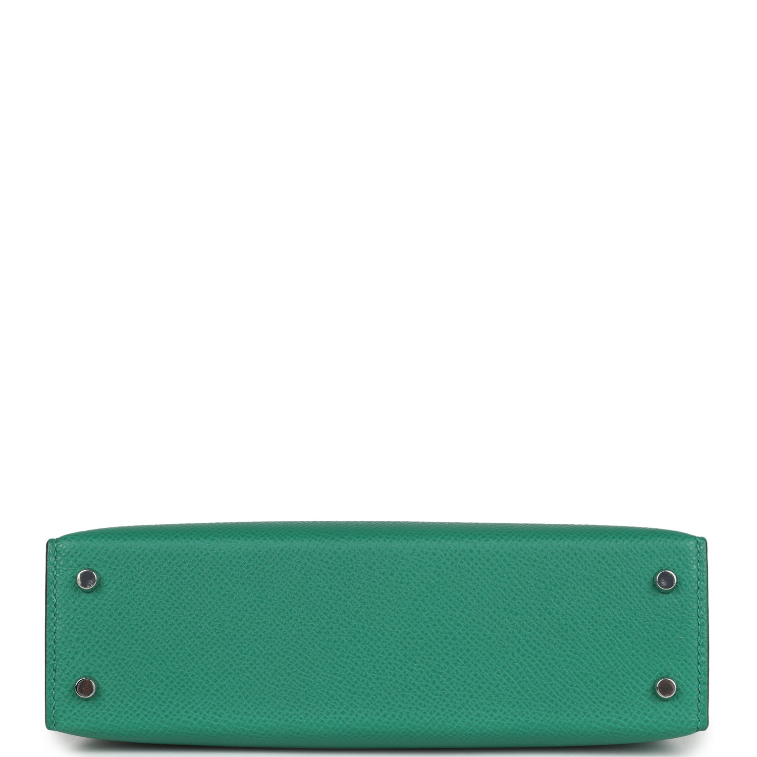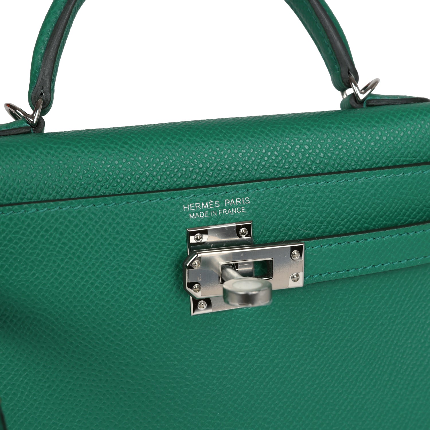 This Kelly, in the Sellier style, is in Vert Vertigo epsom leather with palladium hardware, has tonal stitching, two front straps with front toggle closure, single rolled handle and removable shoulder strap.