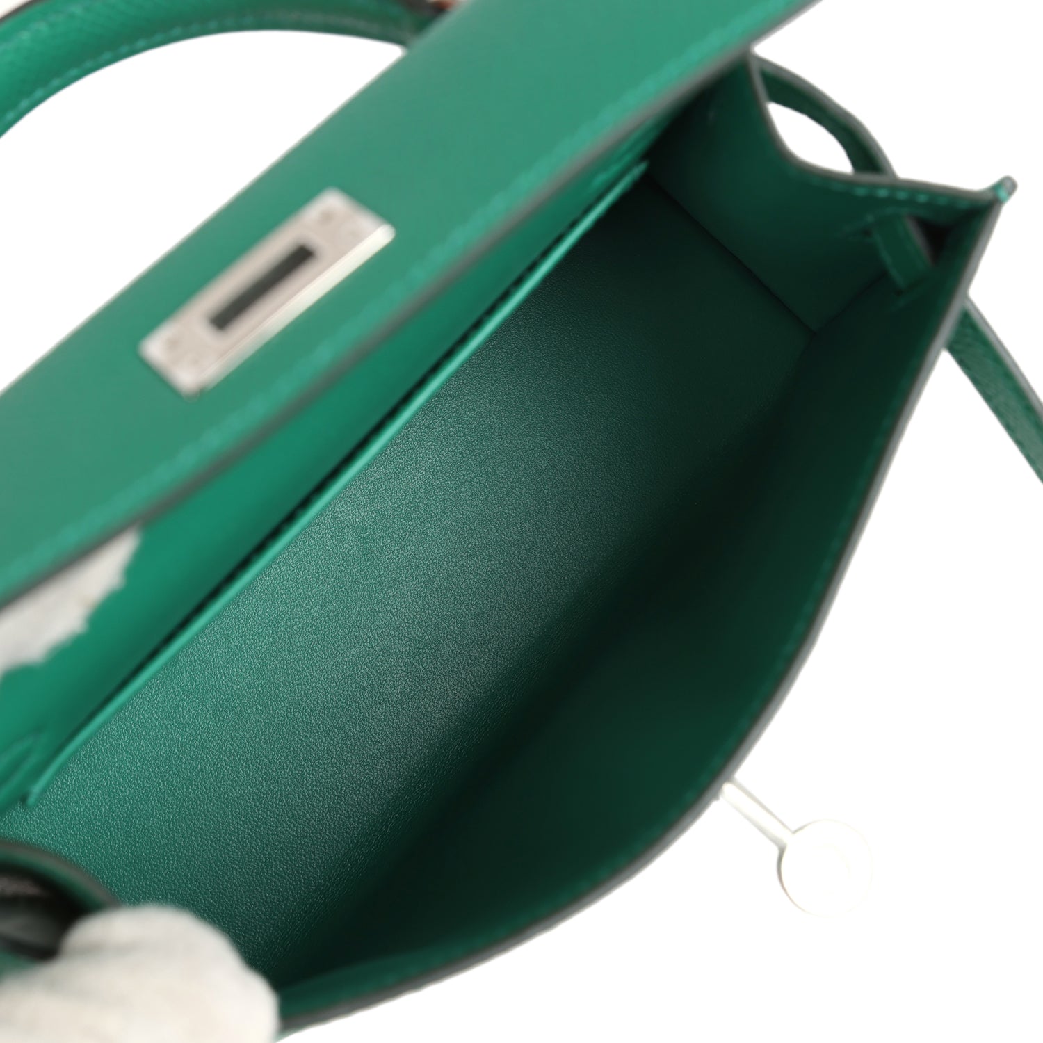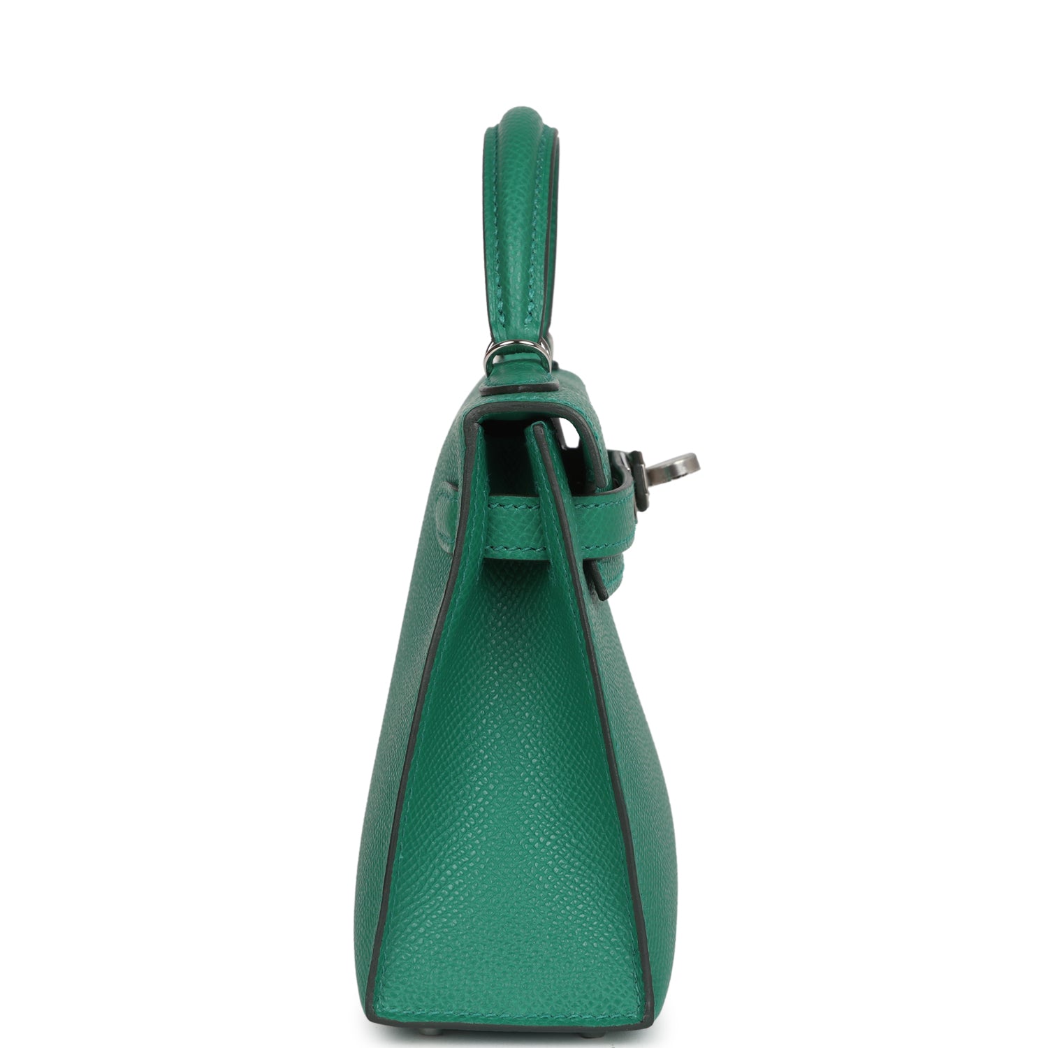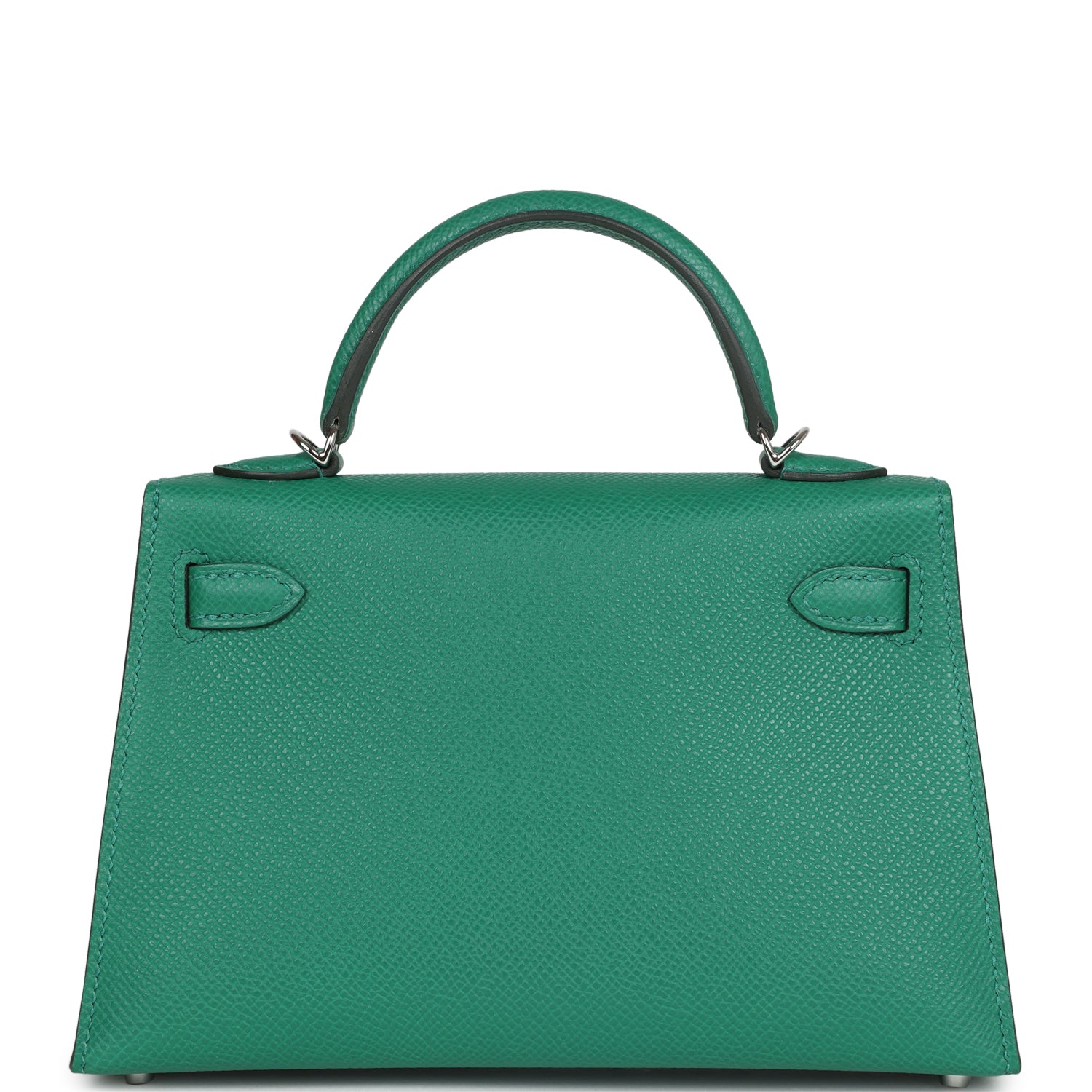 This Kelly, in the Sellier style, is in Vert Vertigo epsom leather with palladium hardware, has tonal stitching, two front straps with front toggle closure, single rolled handle and removable shoulder strap.