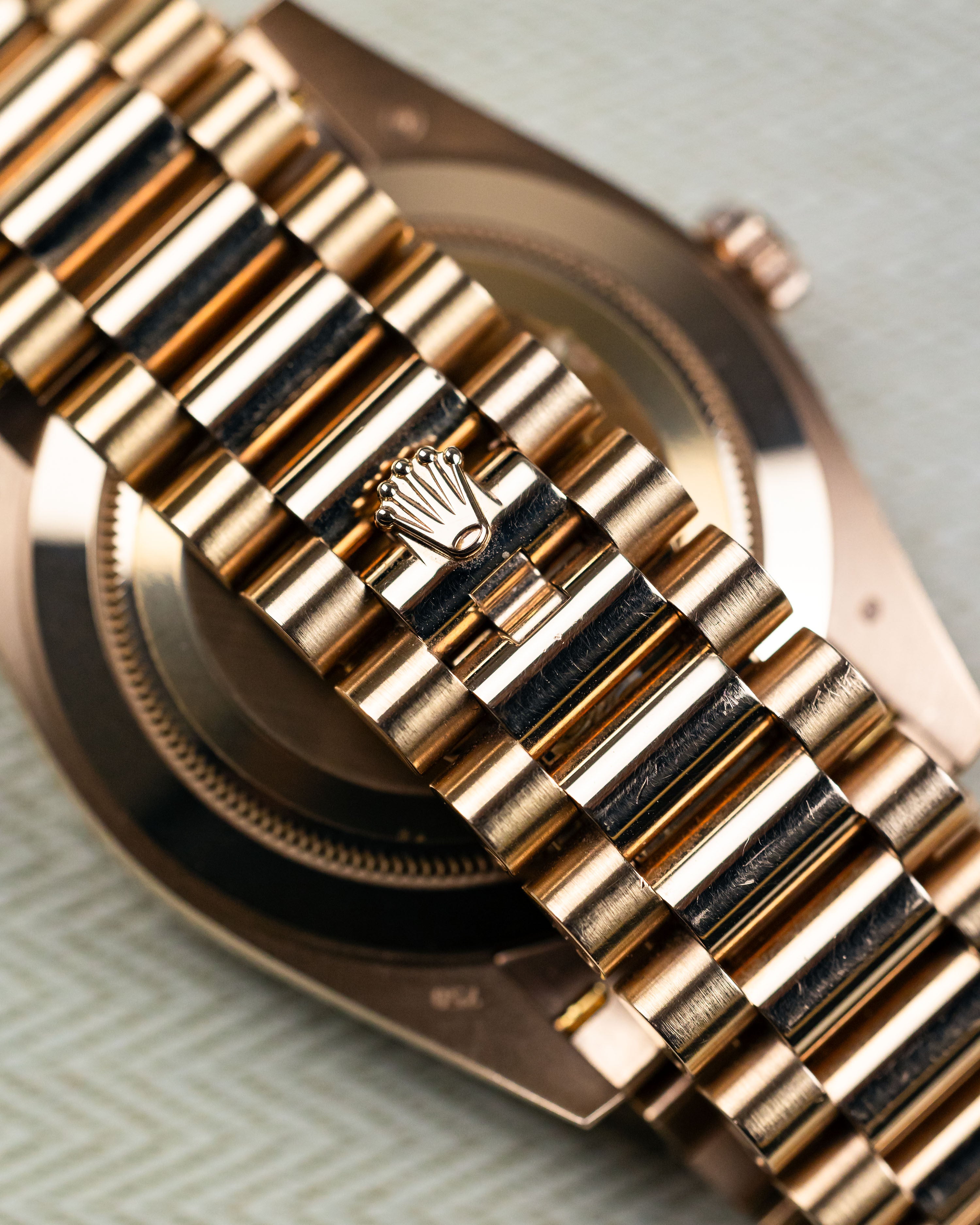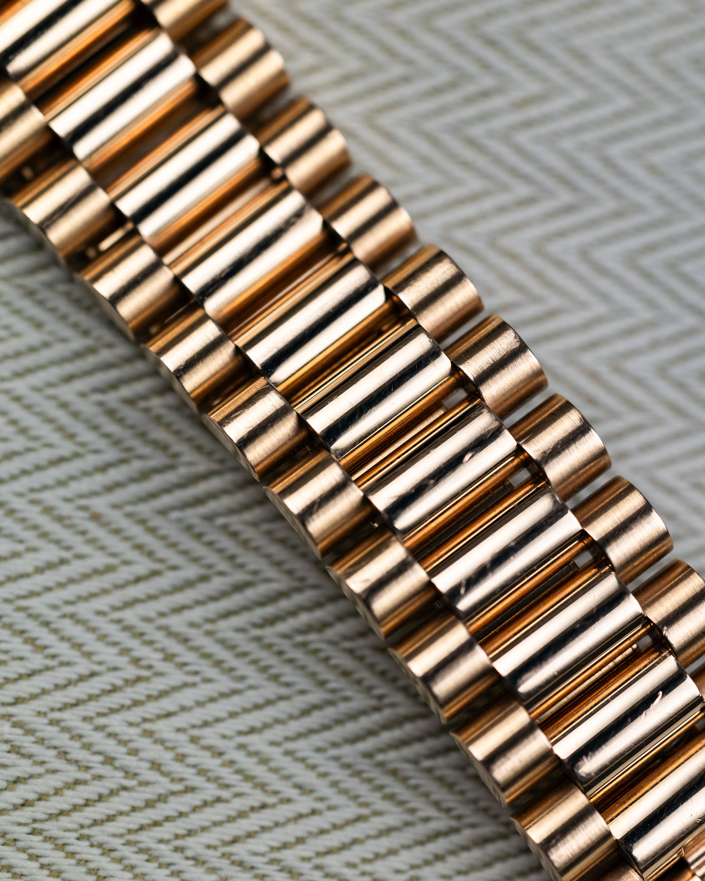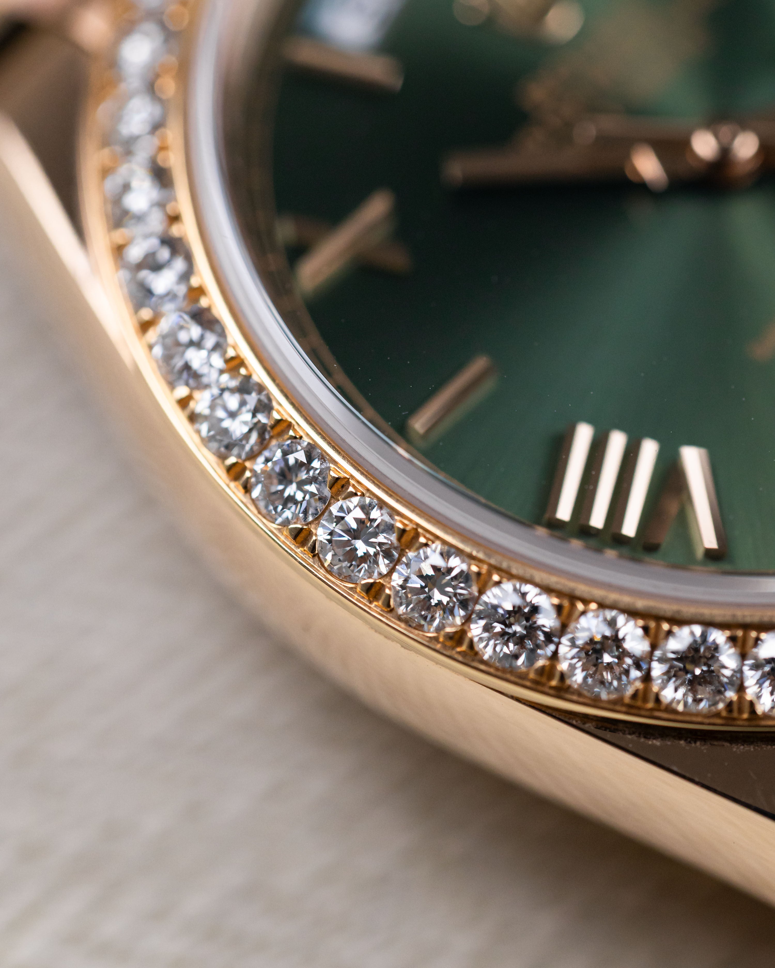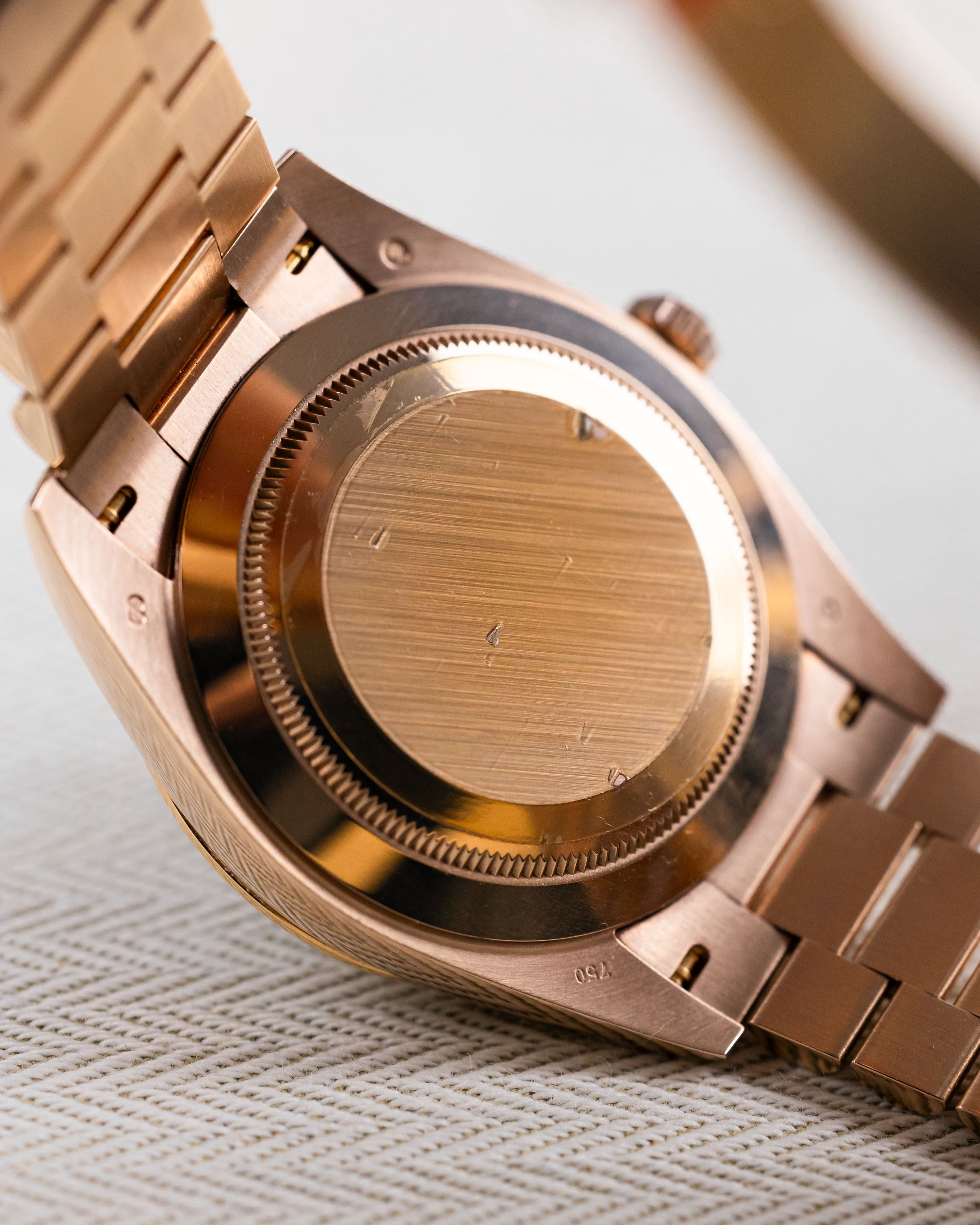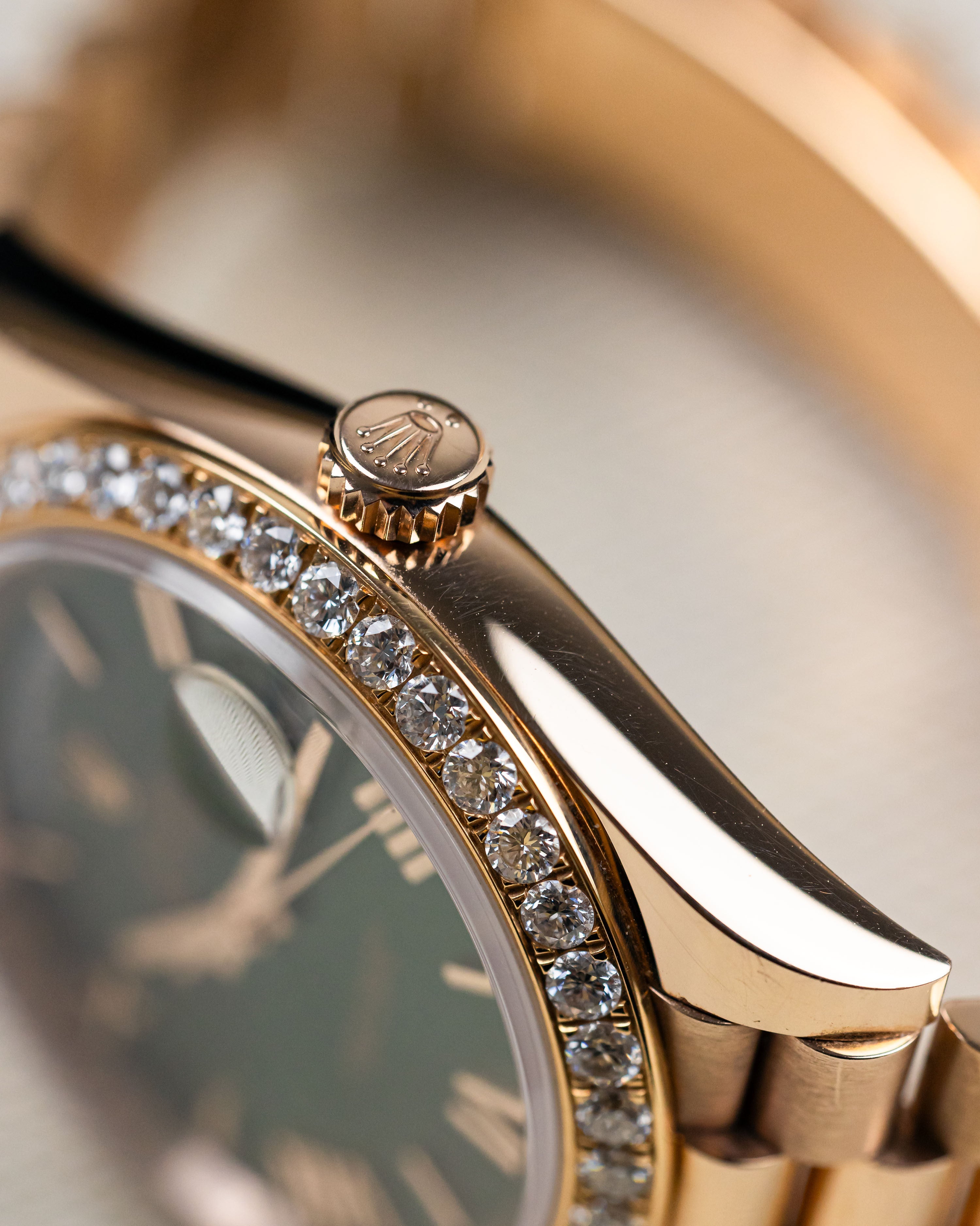 One of the highly sought-after pairing of the rose gold day-date complimented with an aftermarket diamond bezel.