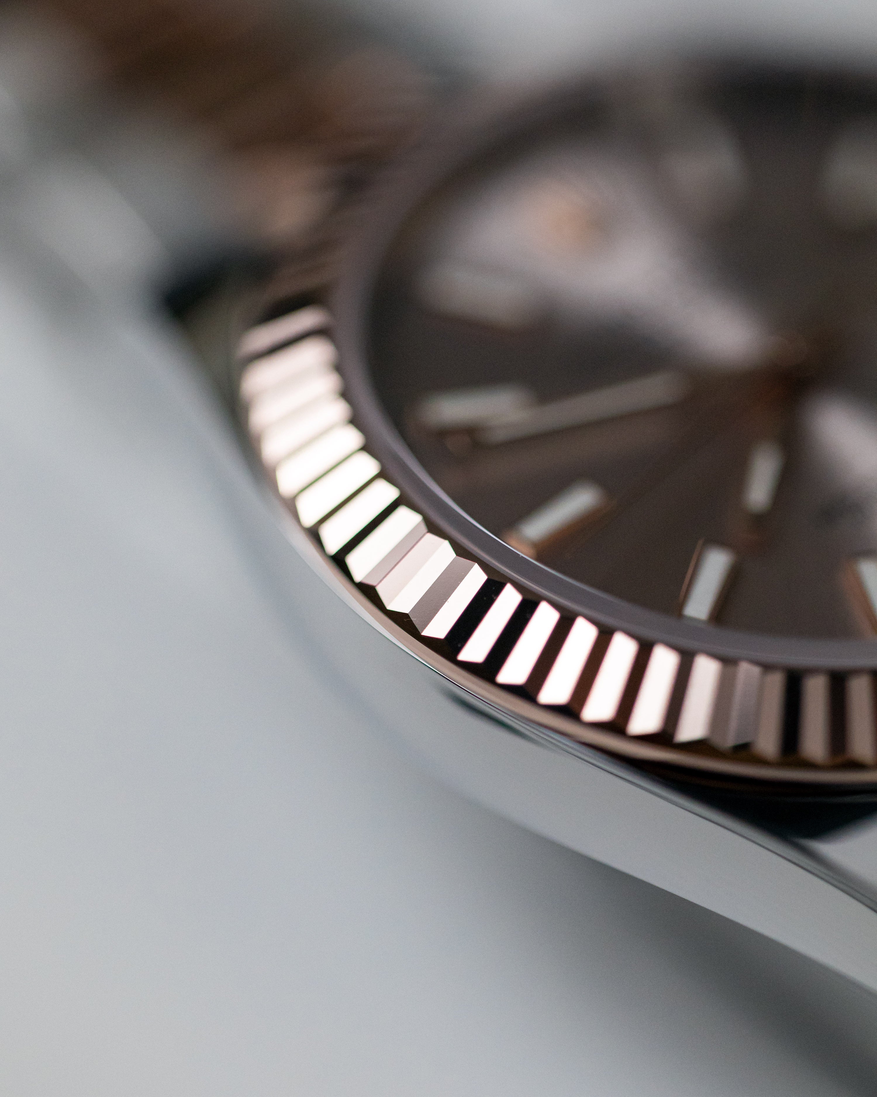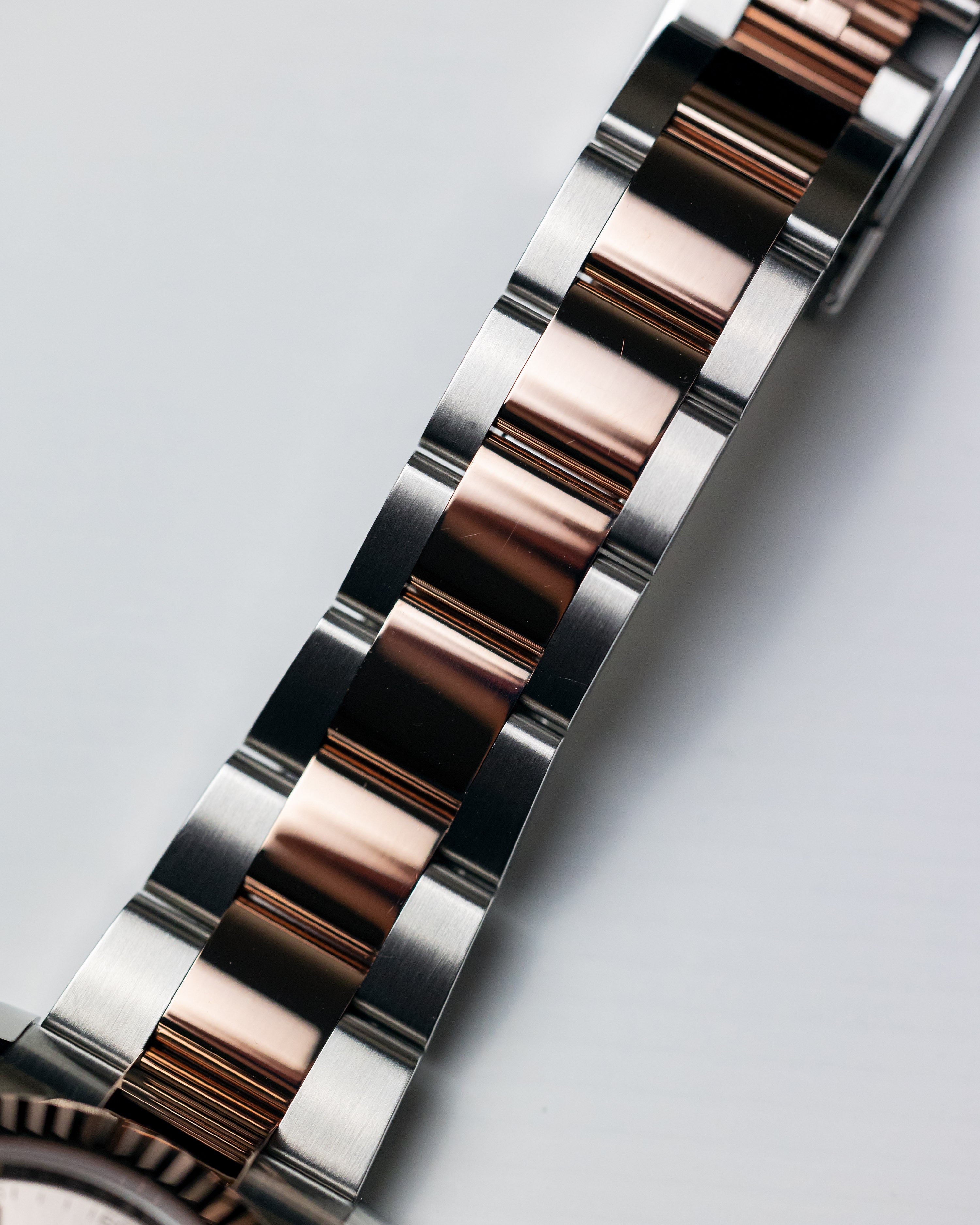 A classic combination of rose gold/steel with a complimentary sundust dial. This example features a masculine oyster bracelet with fluted bezel.