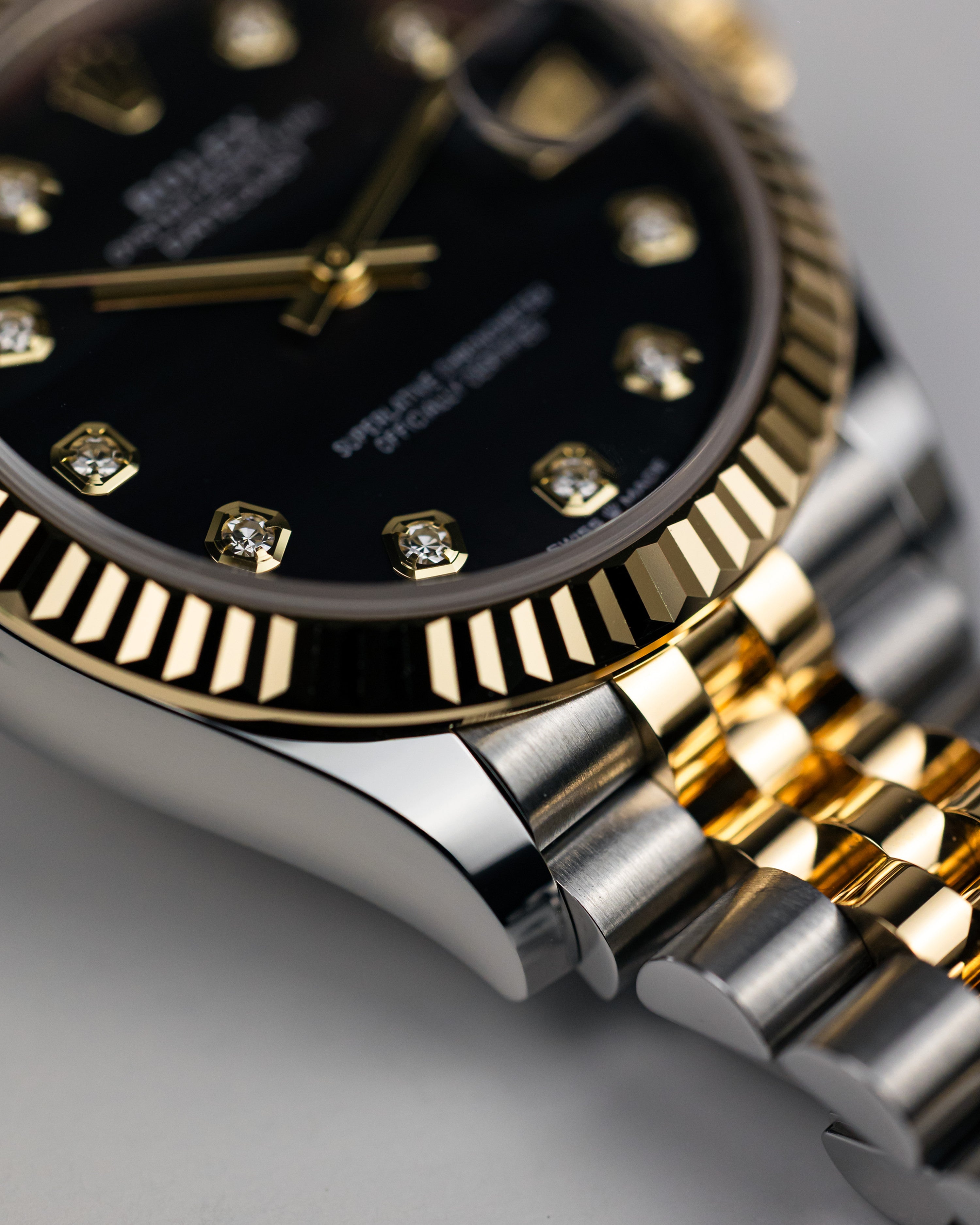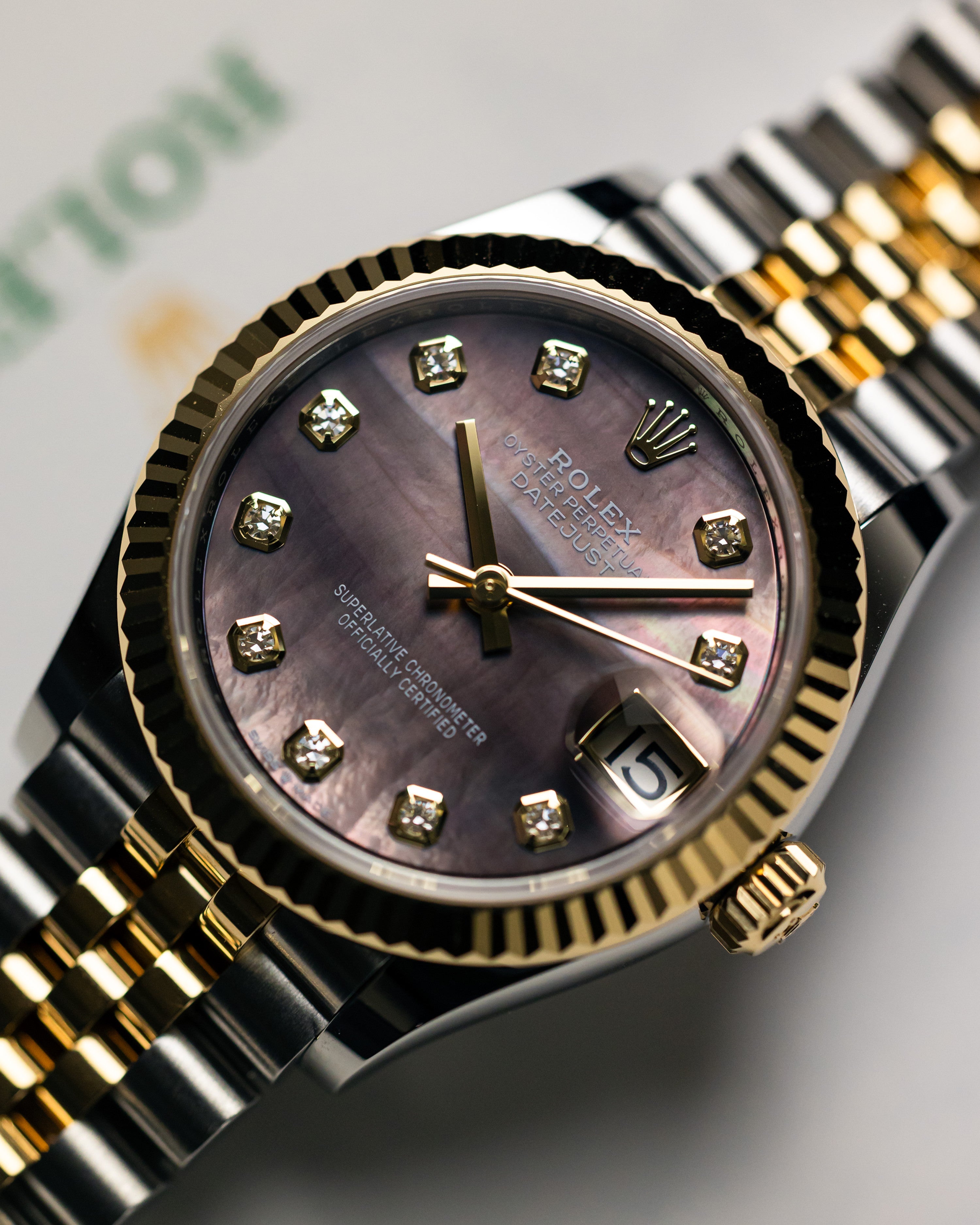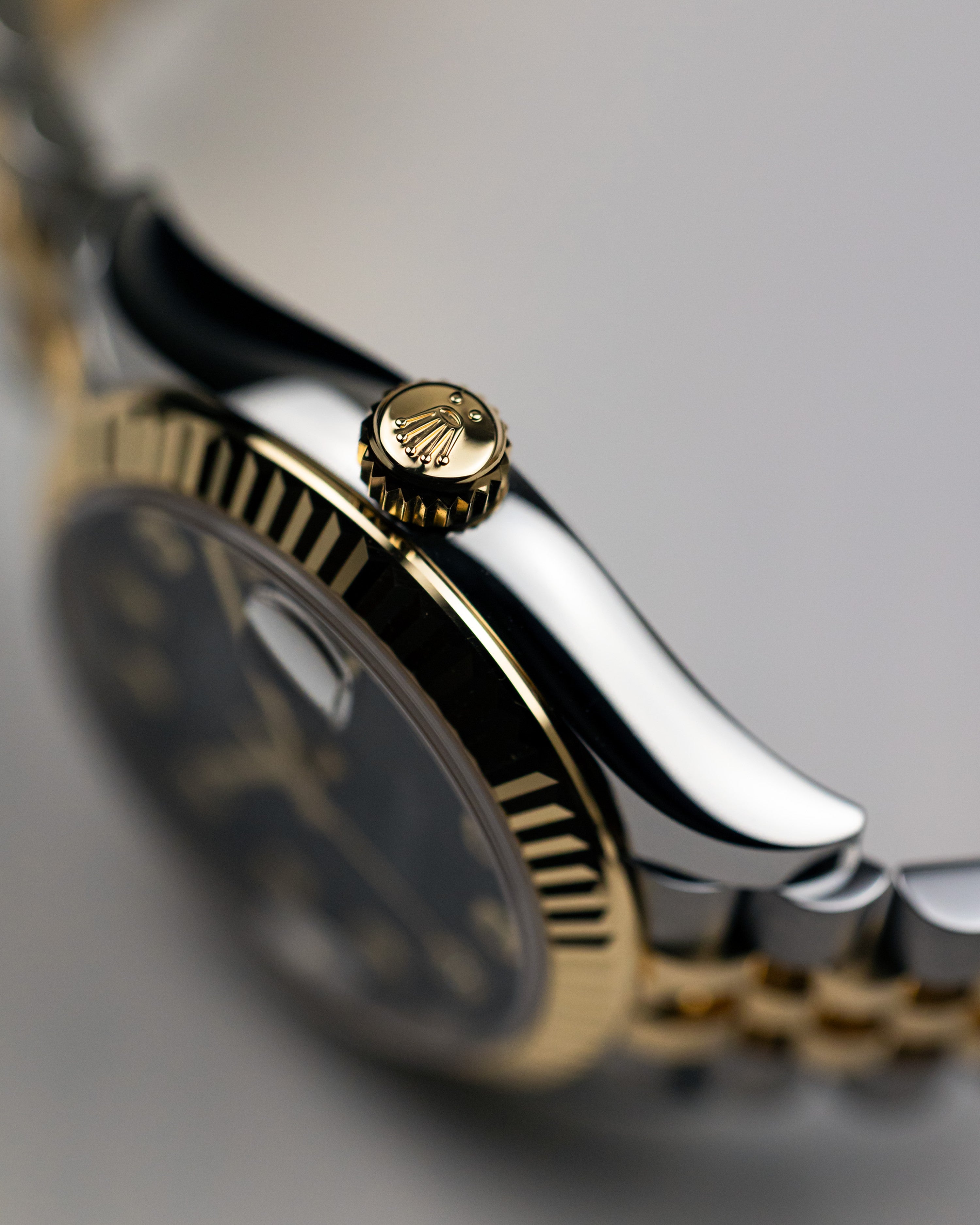 A classic ladies watch with the favourable gold and steel combination, fluted bezel paired with the unique black mother of pearl dial. Each dial having its unique colour and pattern, you will never find an identical one on another wrist.