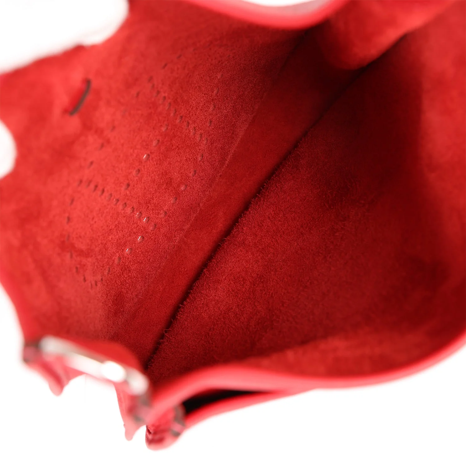 This Evelyne PM is inVermillon clemence leather with palladium hardware, hastonal stitching, pull tab top closure, and gold removable canvas and leather shoulder/crossbody strap.
