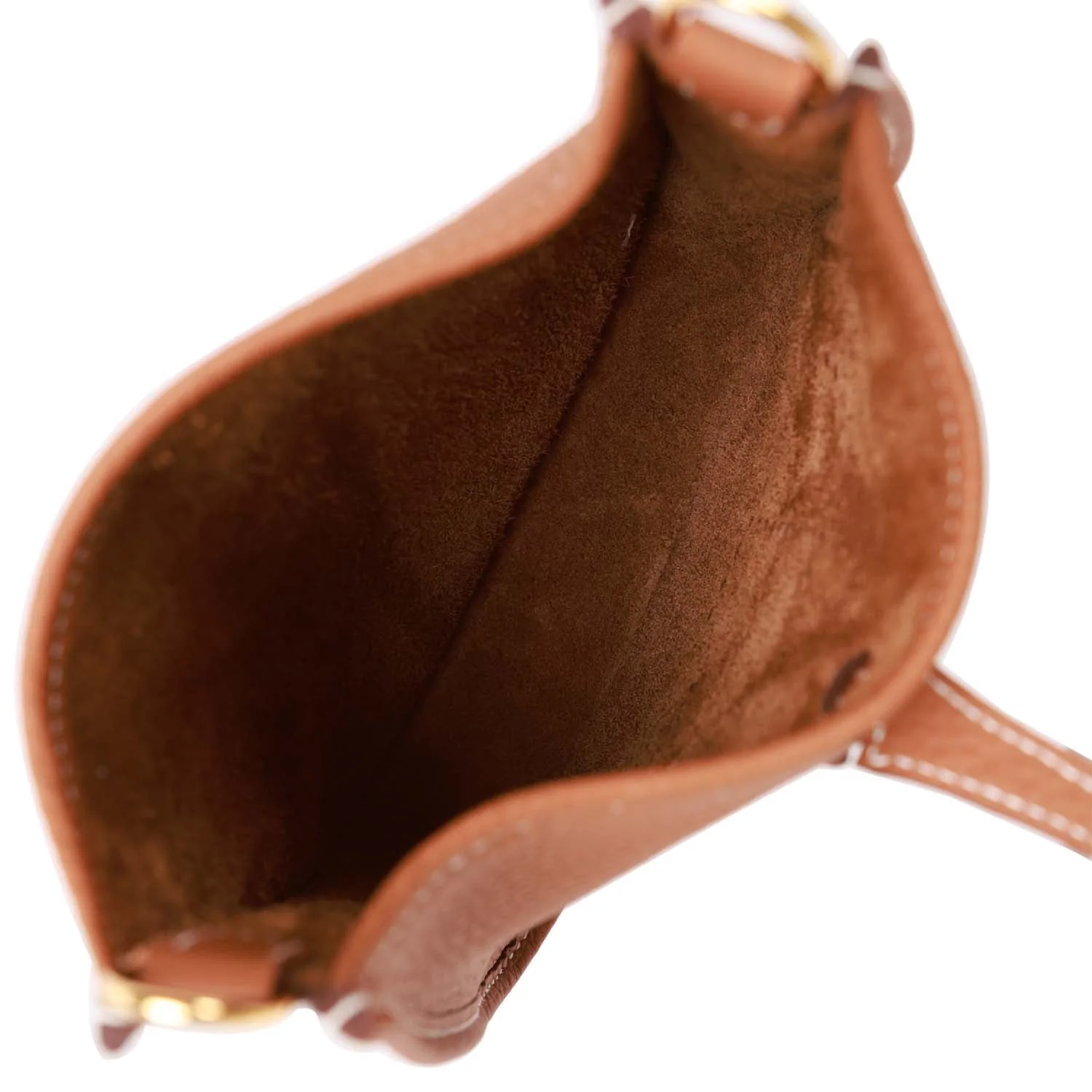 This Evelyne is inGold clemence leather withgold hardware and has contrast stitching, pull tab top closure and agold removable canvas and leather shoulder/crossbody strap.
