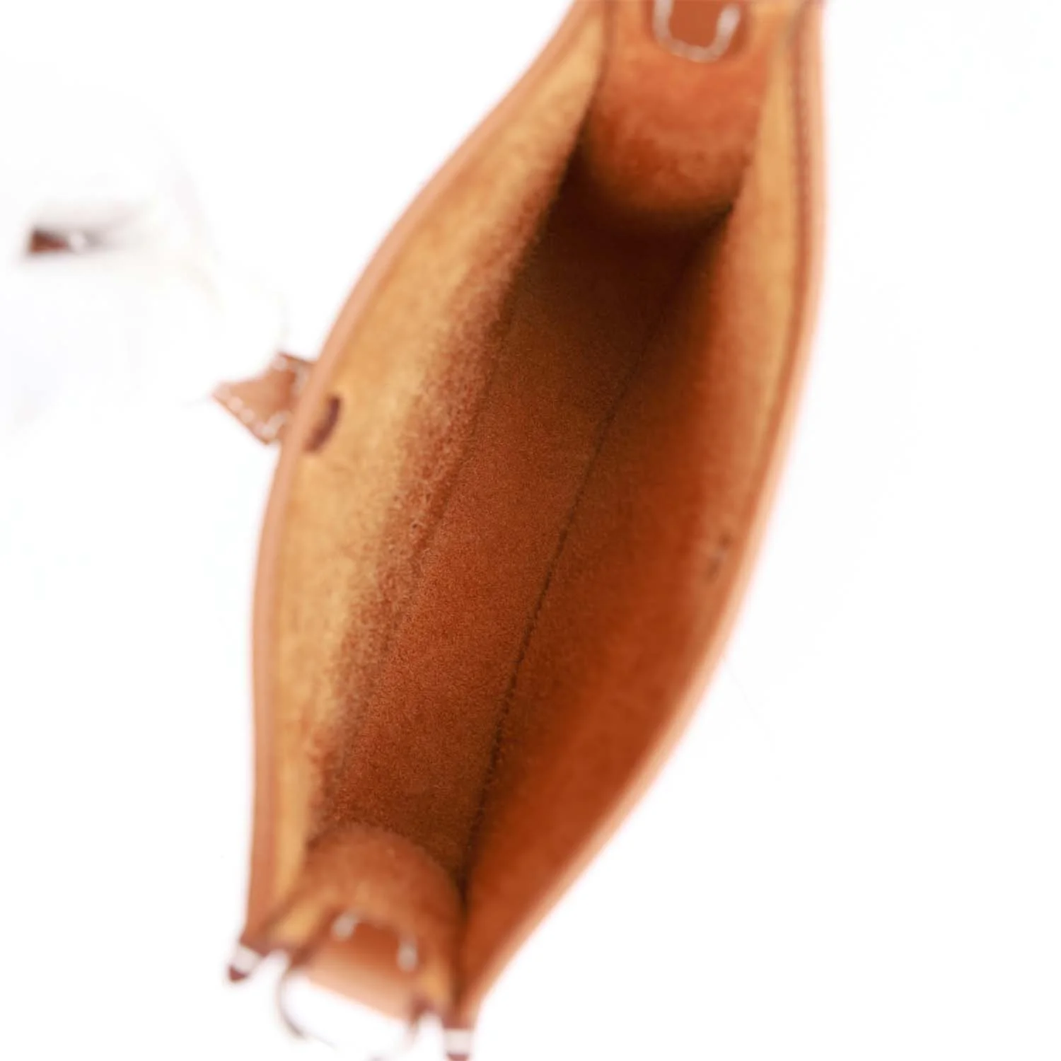 This Evelyne is inGold clemence leather withpalladium hardware, has contrast stitching, pull tab top closure and agold removable canvas and leather shoulder/crossbody strap.