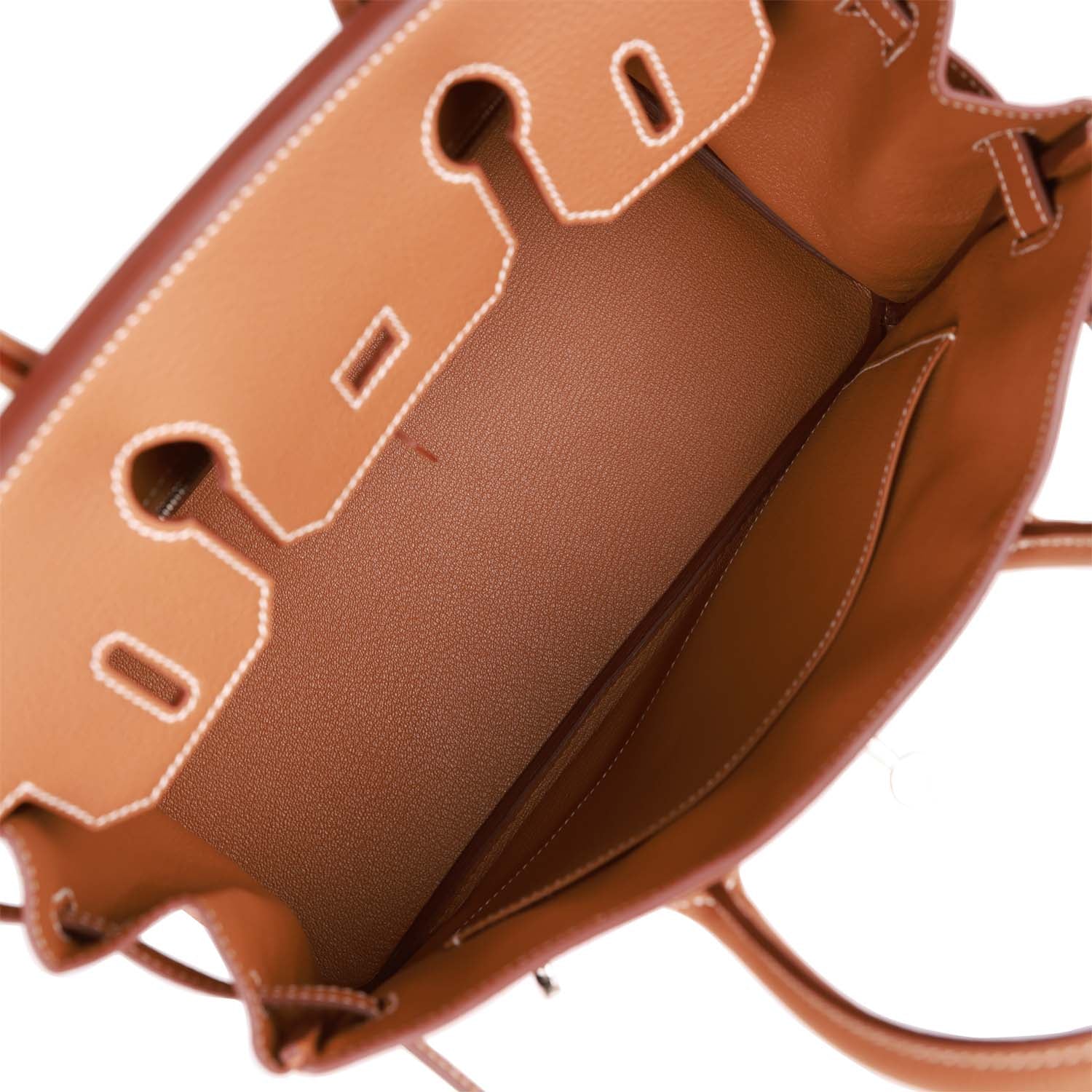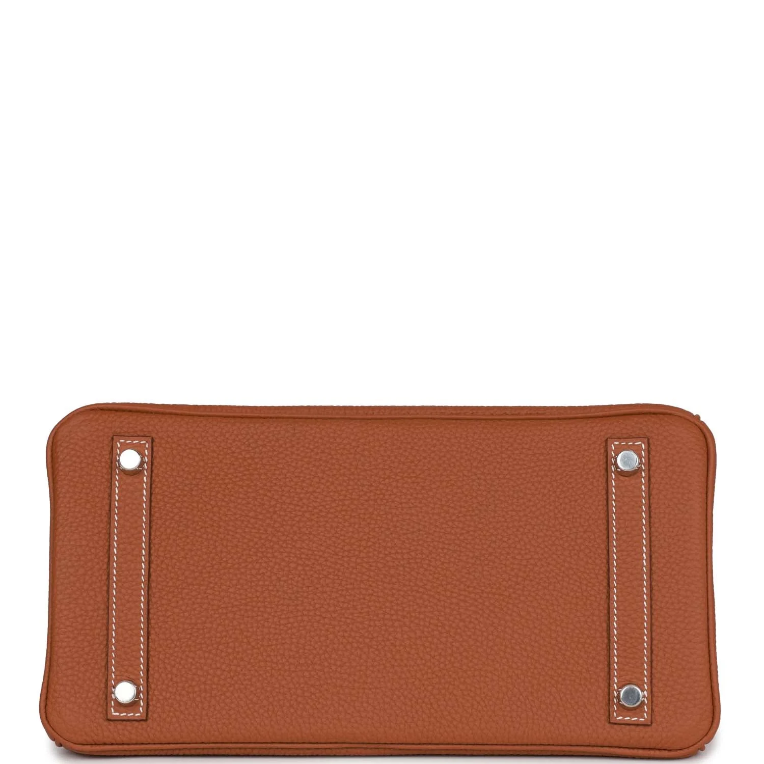 This Birkin is in Gold togo leather withpalladium hardware and features contrast stitching, front flap, two straps with center toggle closure, a clochette with lock and two keys and double rolled handles.