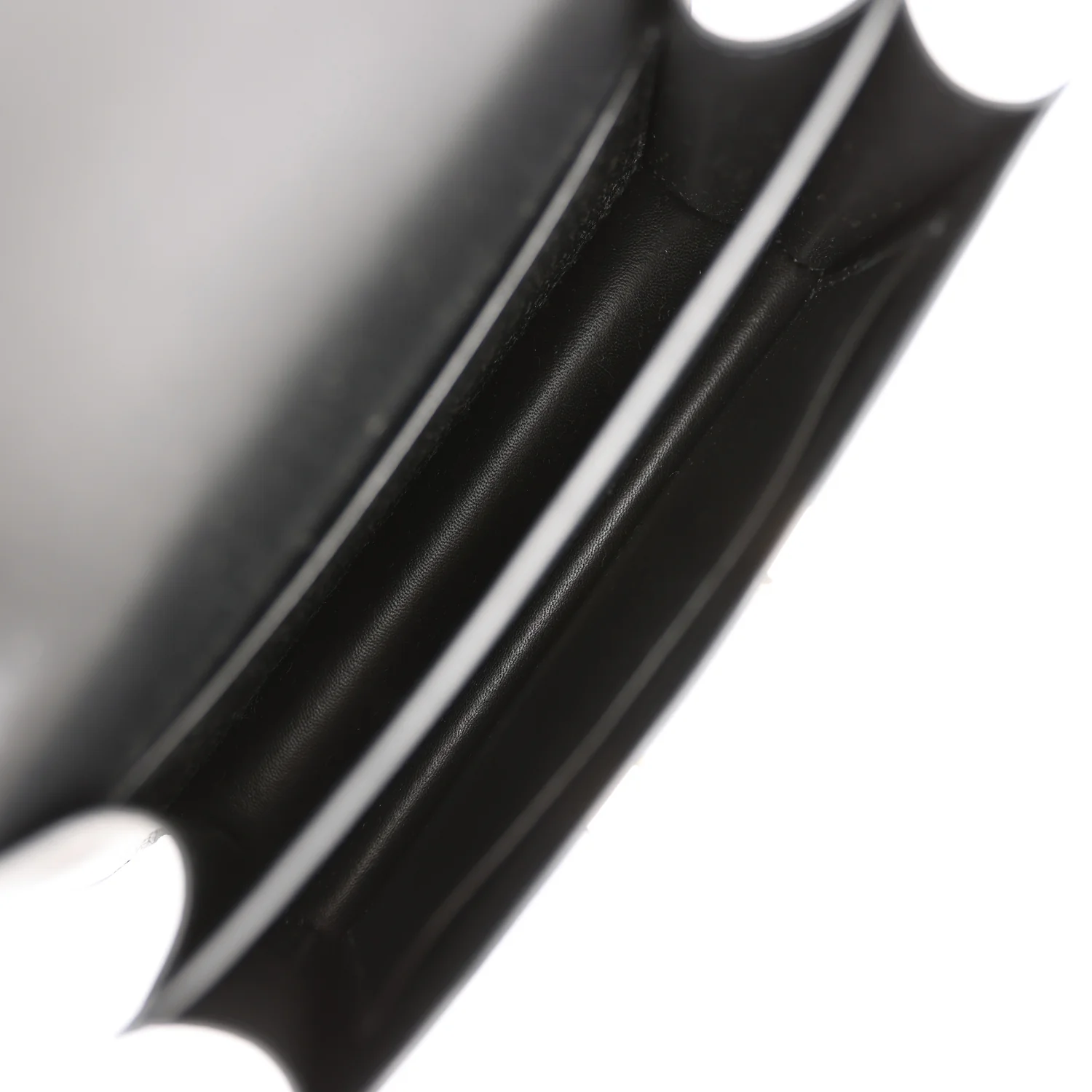 The interior is lined withBlack lambskin and has an open pocket on the front wall, a center divide, and a slit pocket on the back wall.