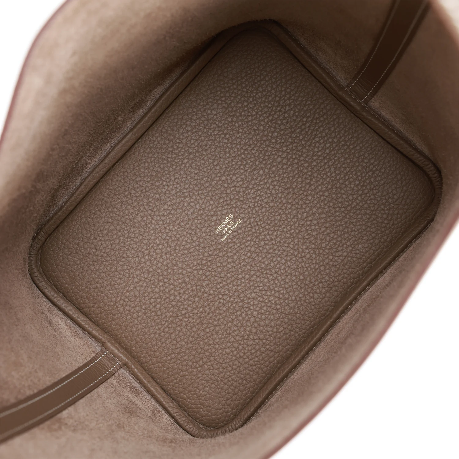 The interior is lined withEtoupe natural leather, no interior pockets and has a pull through closure secured by padlock.