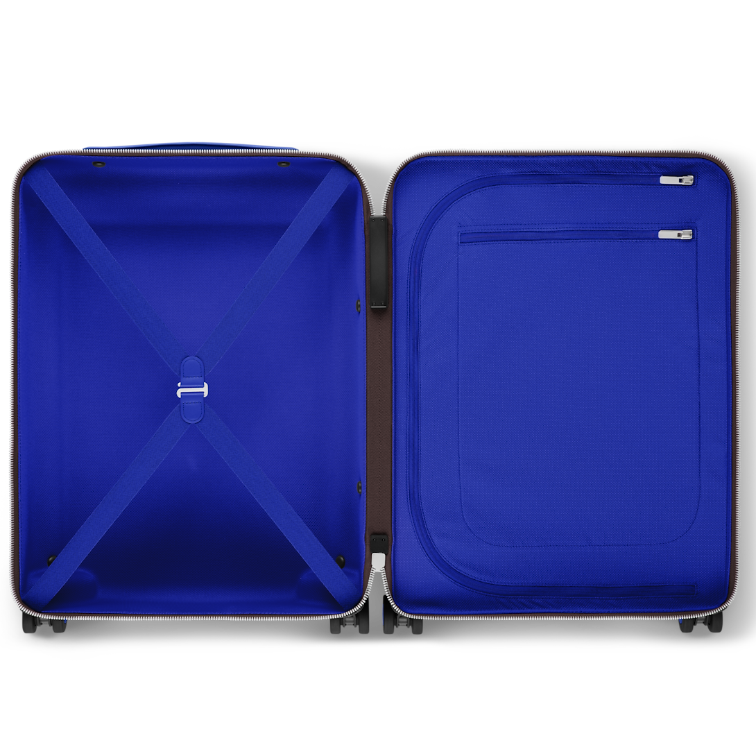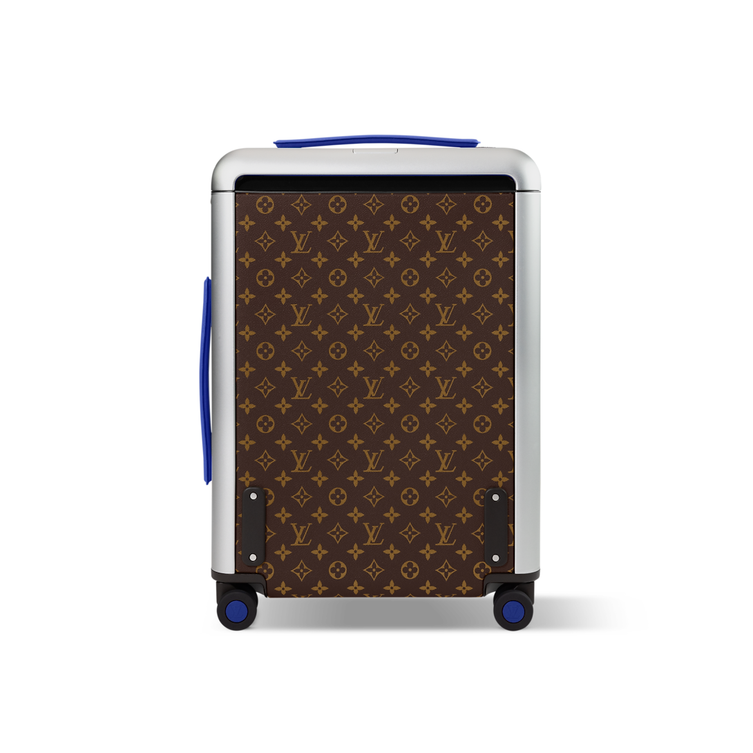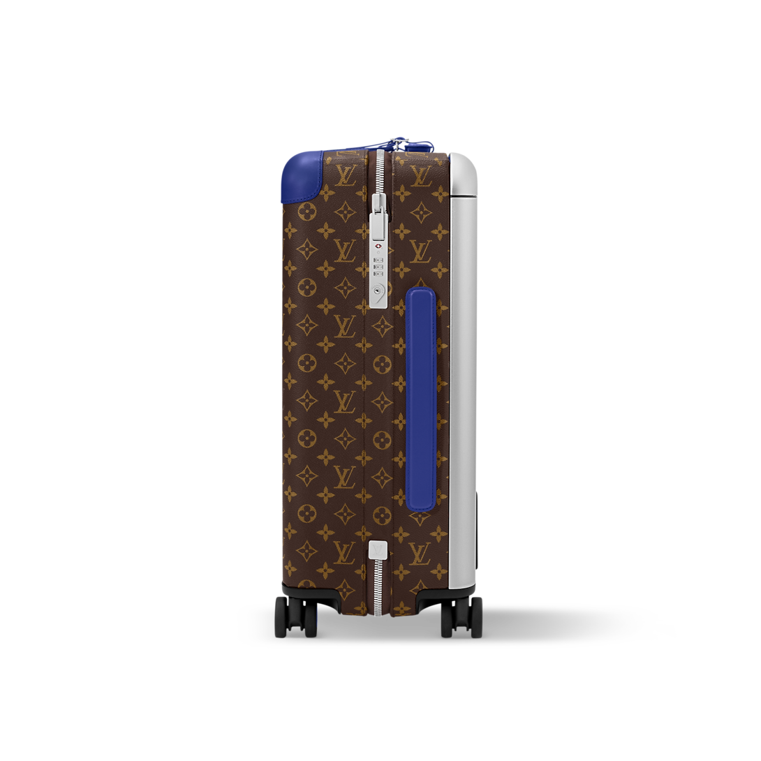 This Horizon 55 rolling suitcase in Monogram Macassar canvas, with touches of vibrant color on the reinforced corners, cane handle, and its compact wheels, is small enough to carry onto a plane. And yet its interior is remarkably roomy thanks to its external cane. The lining is in the same bright color as the exterior details.