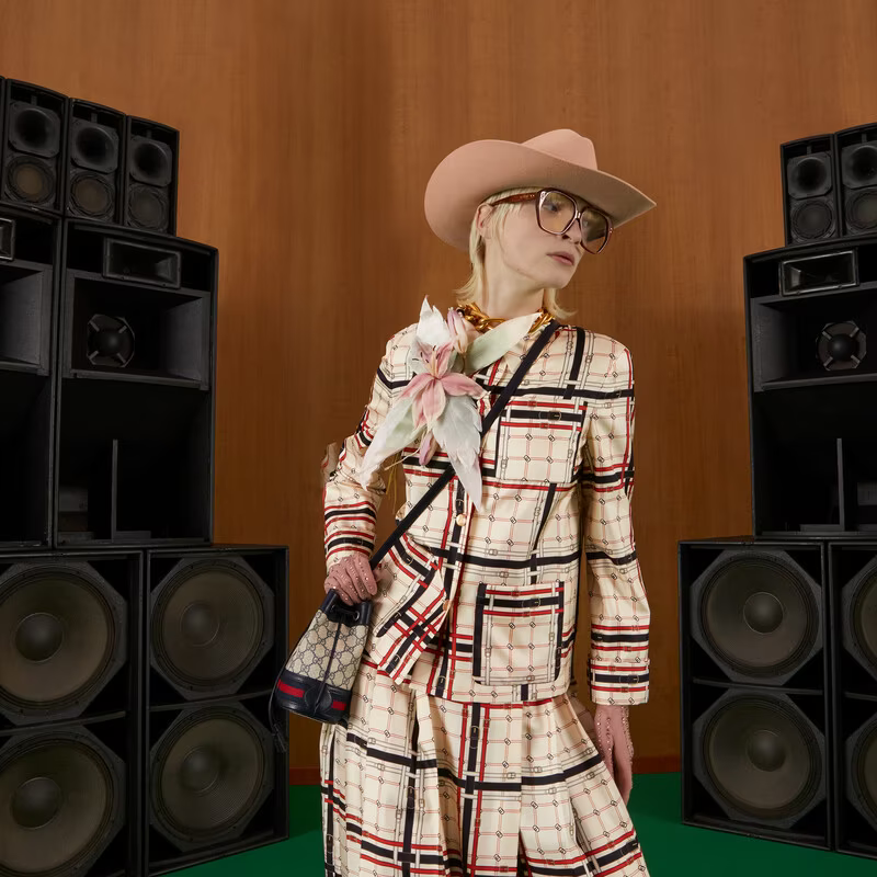 Mirroring the material's historic origins, GG Supreme is introduced in a timeless mix of blue and beige for Gucci Love Parade. The canvas has come to the forefront of each collection decade after decade to become a hallmark of the House. Here, the classic palette defines this mini bucket bag from the Ophidia line, combined with the Web in blue and red.