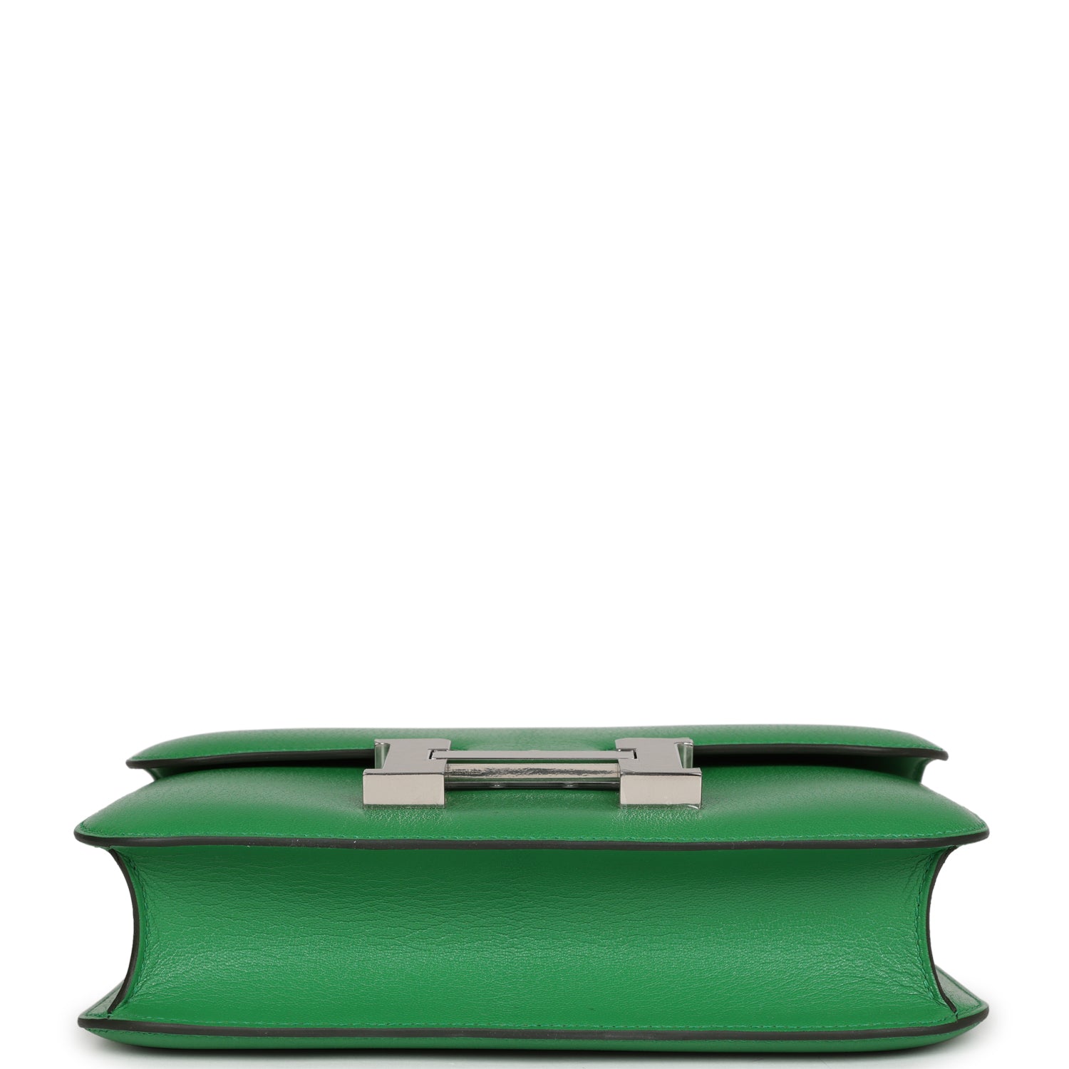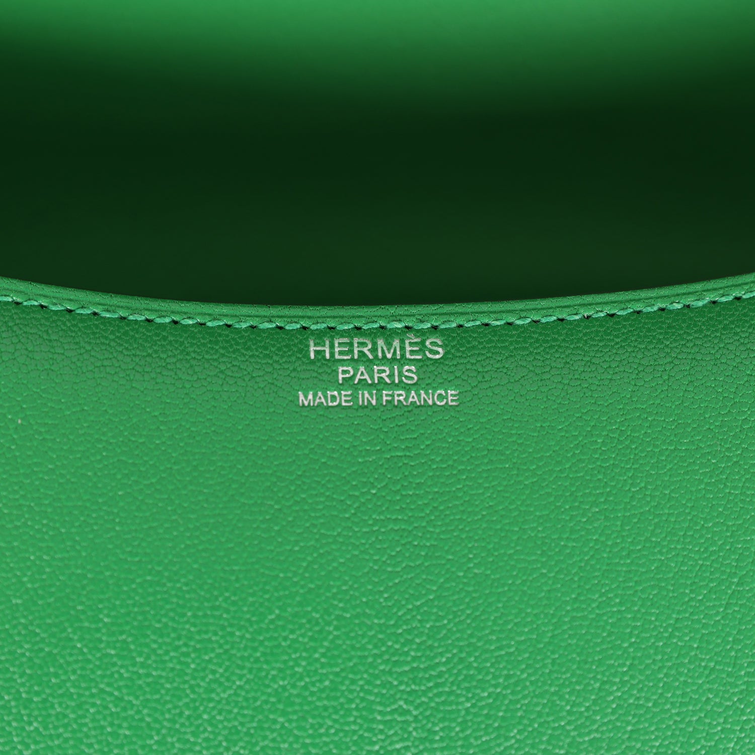 This Constance is in Bambou Chamkila Chevre with palladium hardware, has tonal stitching, a metal “H” snap lock closure and adjustable shoulder strap.