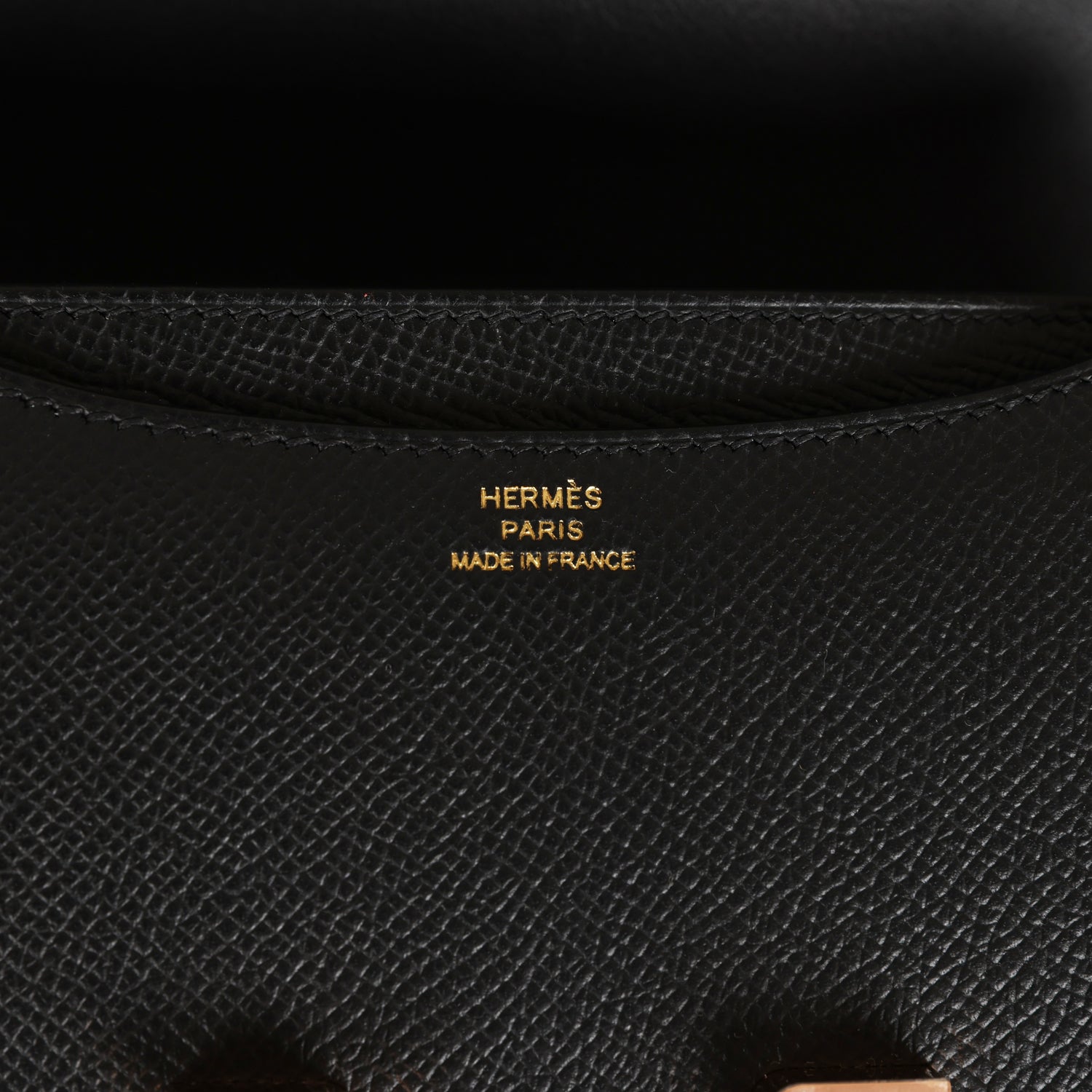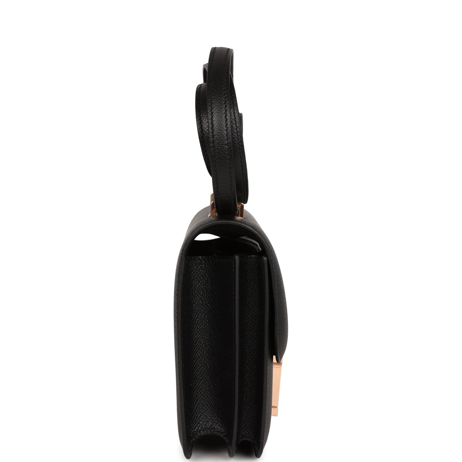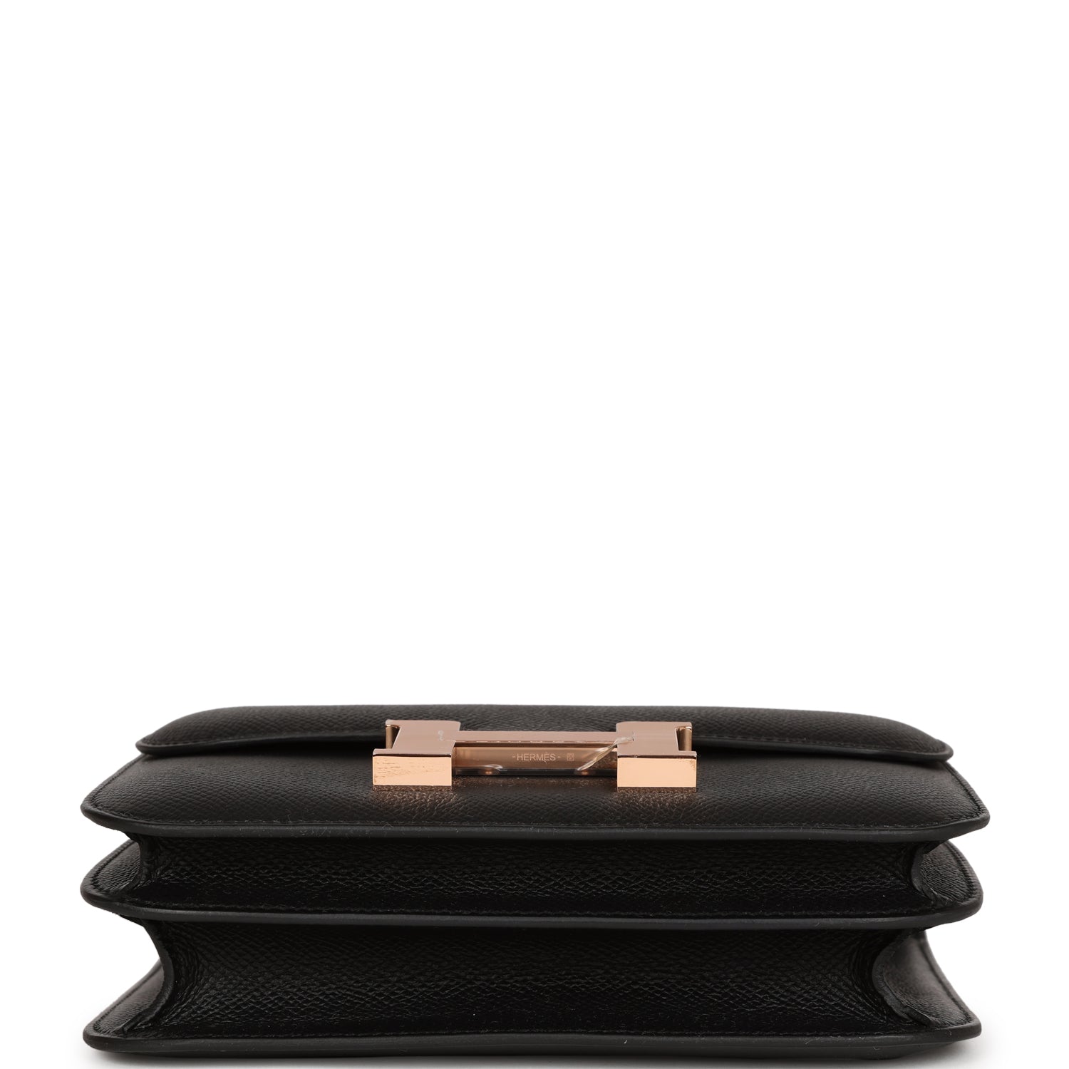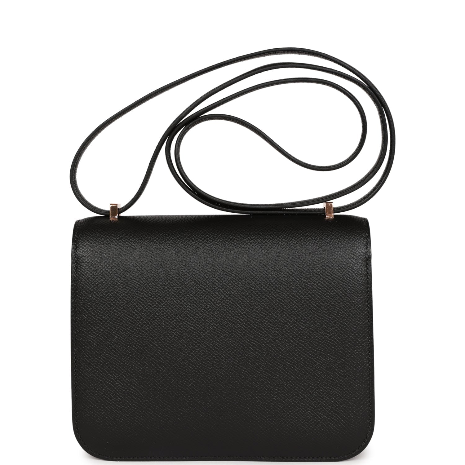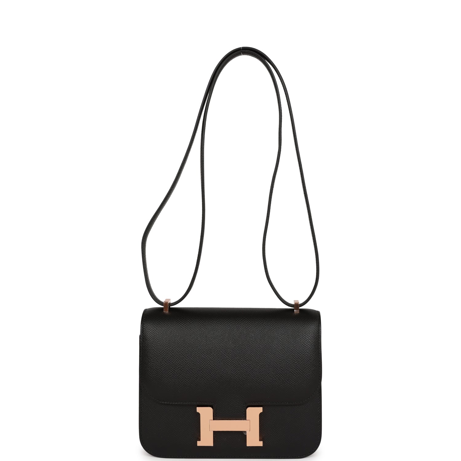 This Constance is in Black epsom leather with rose gold hardware and has tonal stitching, a metal “H” snap lock closure and adjustable shoulder strap.