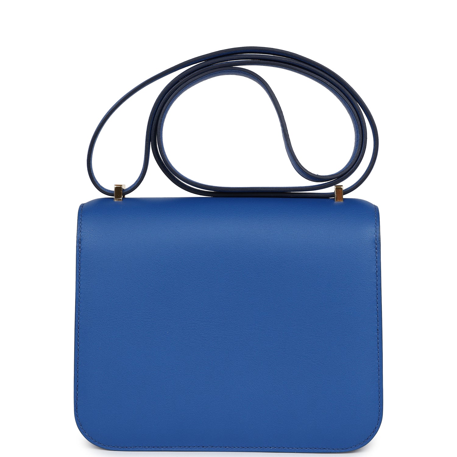 This Constance 1-18 is in Bleu France swift leather with gold hardware and has tonal stitching, a metal “H” snap lock closure and adjustable shoulder strap.