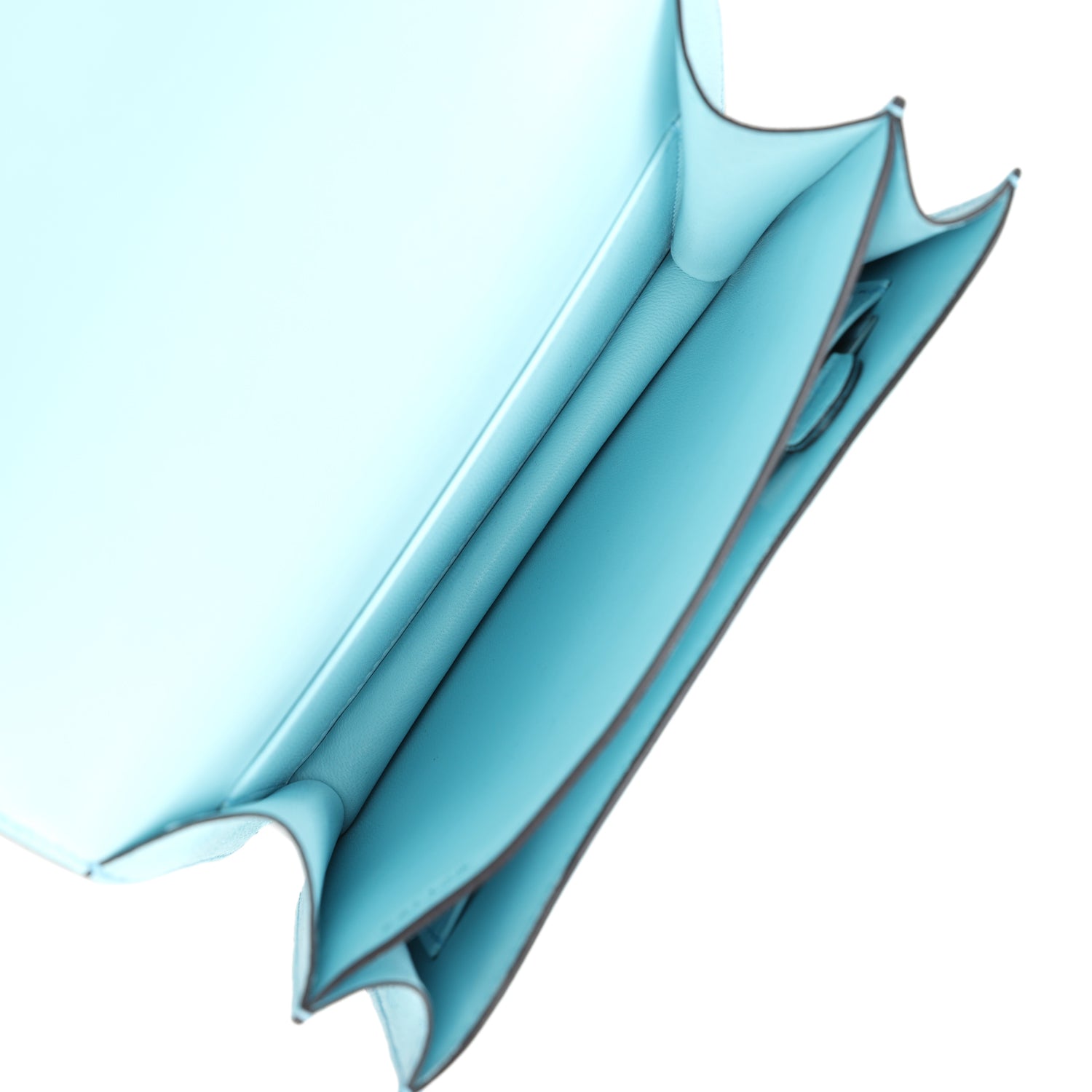 The interior is lined with Bleu Zephyr lambskin and has two open pocket on the front wall, a removable mirror, a center divide, and a slit pocket on the back wall.