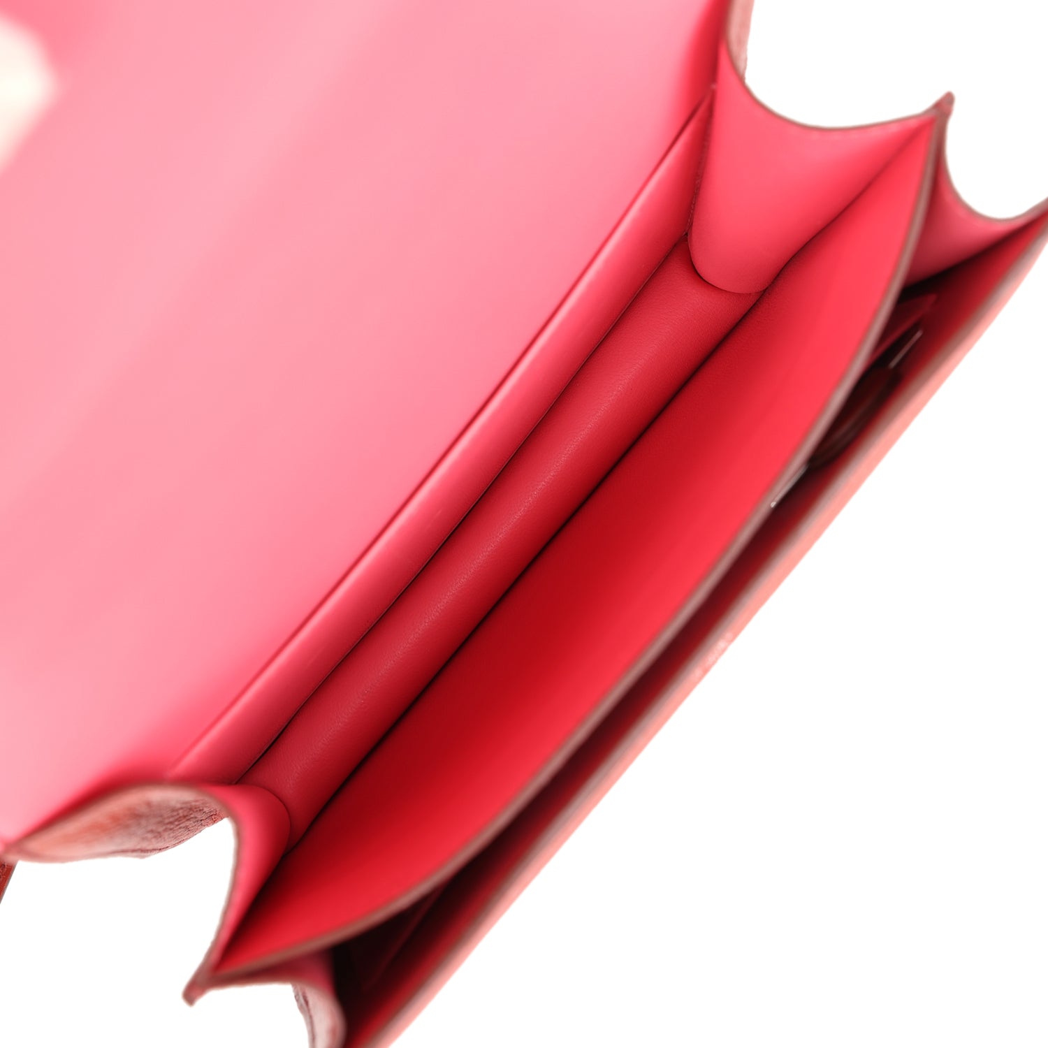 The interior is lined with Rose Azalee lambskin and has an open pocket on the front wall, a center divide, removable mirror and a slit pocket on the back wall.