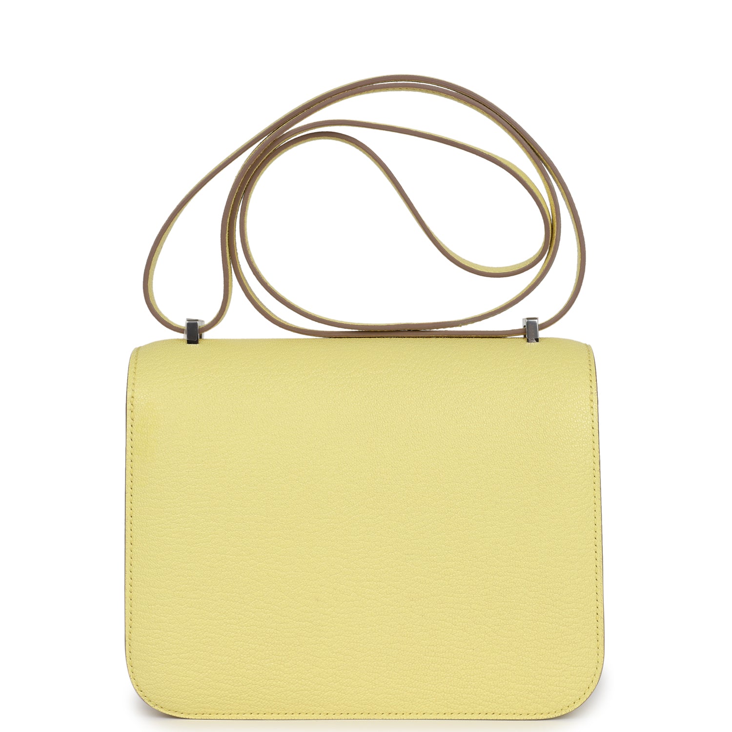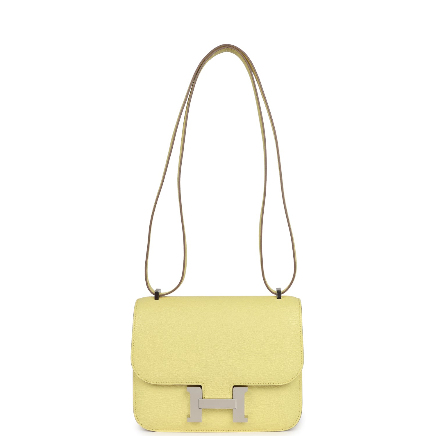 This Constance 1-18 is in Limoncello chevre mysore leather with palladium hardware and has tonal stitching, a metal “H” snap lock closure and adjustable shoulder strap.