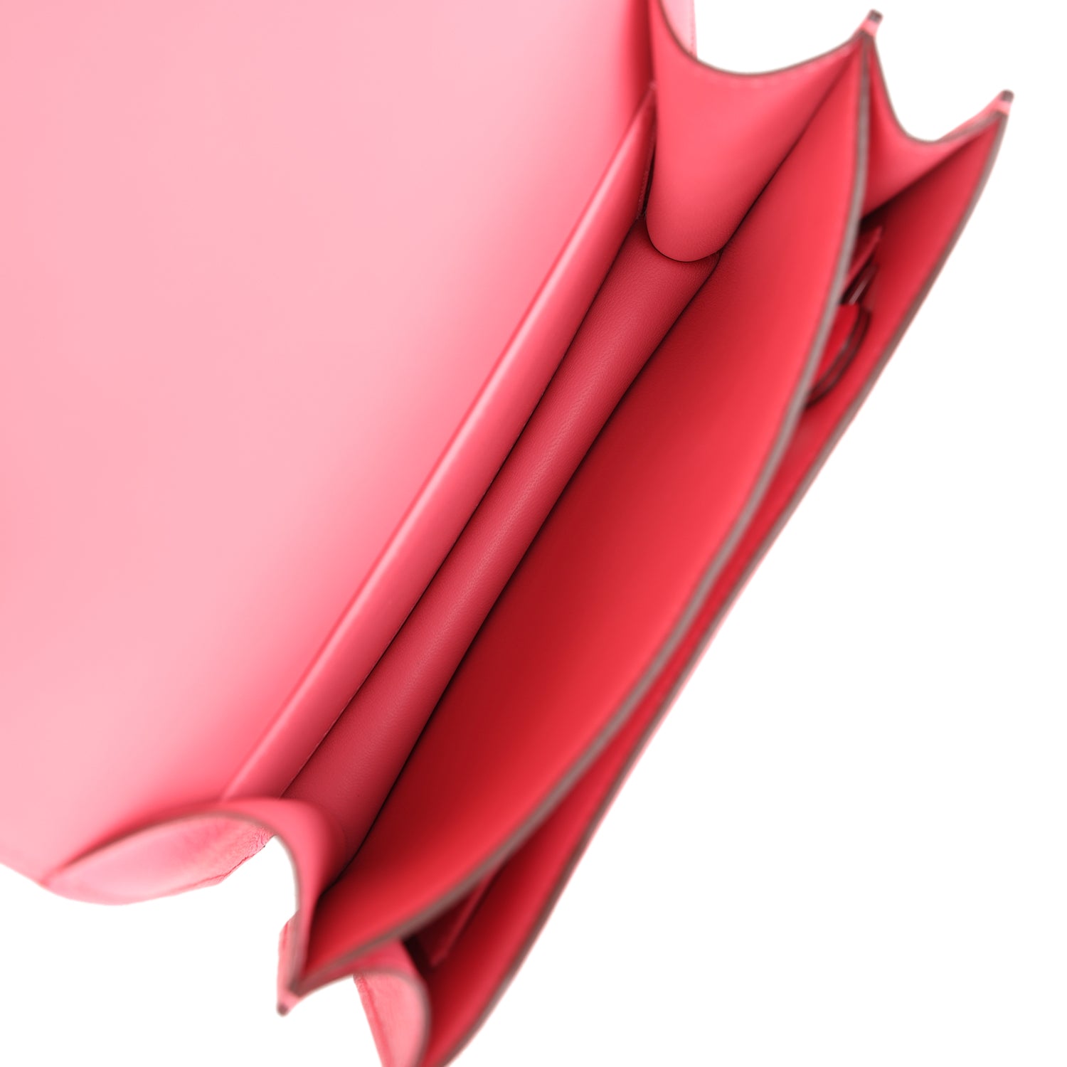 The interior is lined with Rose Azalee lambskin and has an open pocket on the front wall, a center divide, removable mirror and a slit pocket on the back wall.